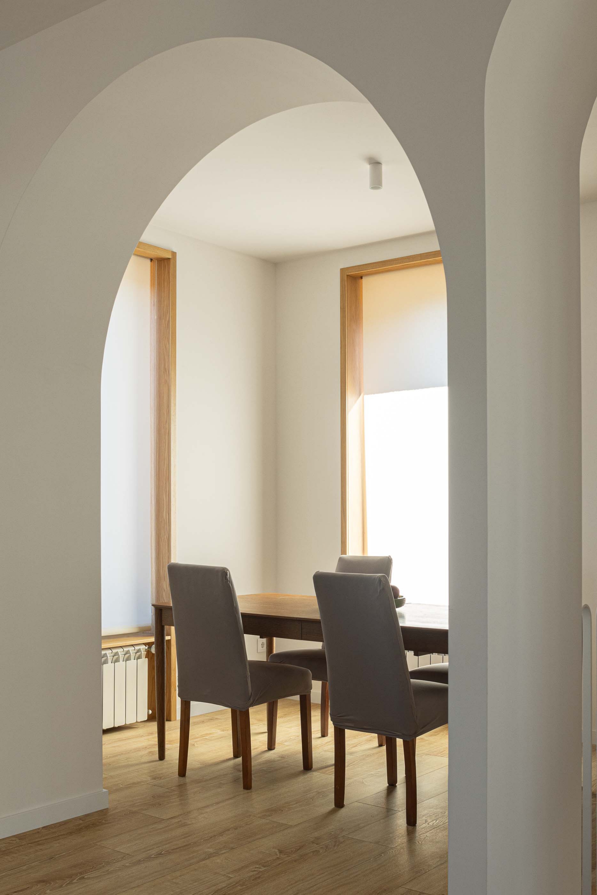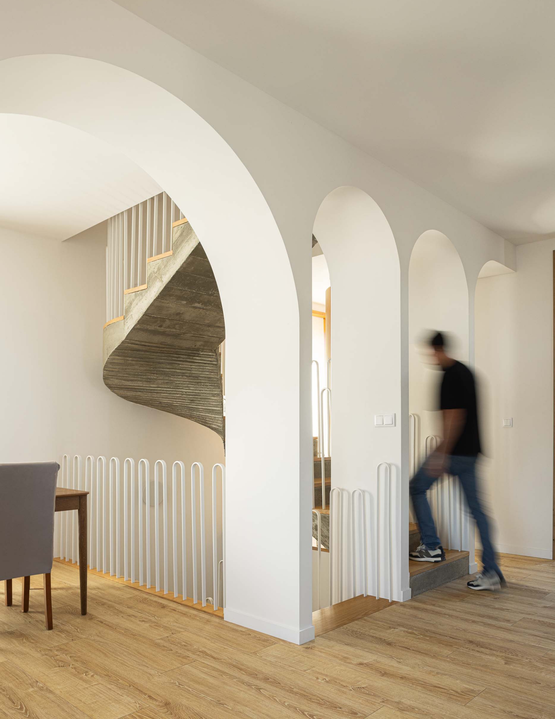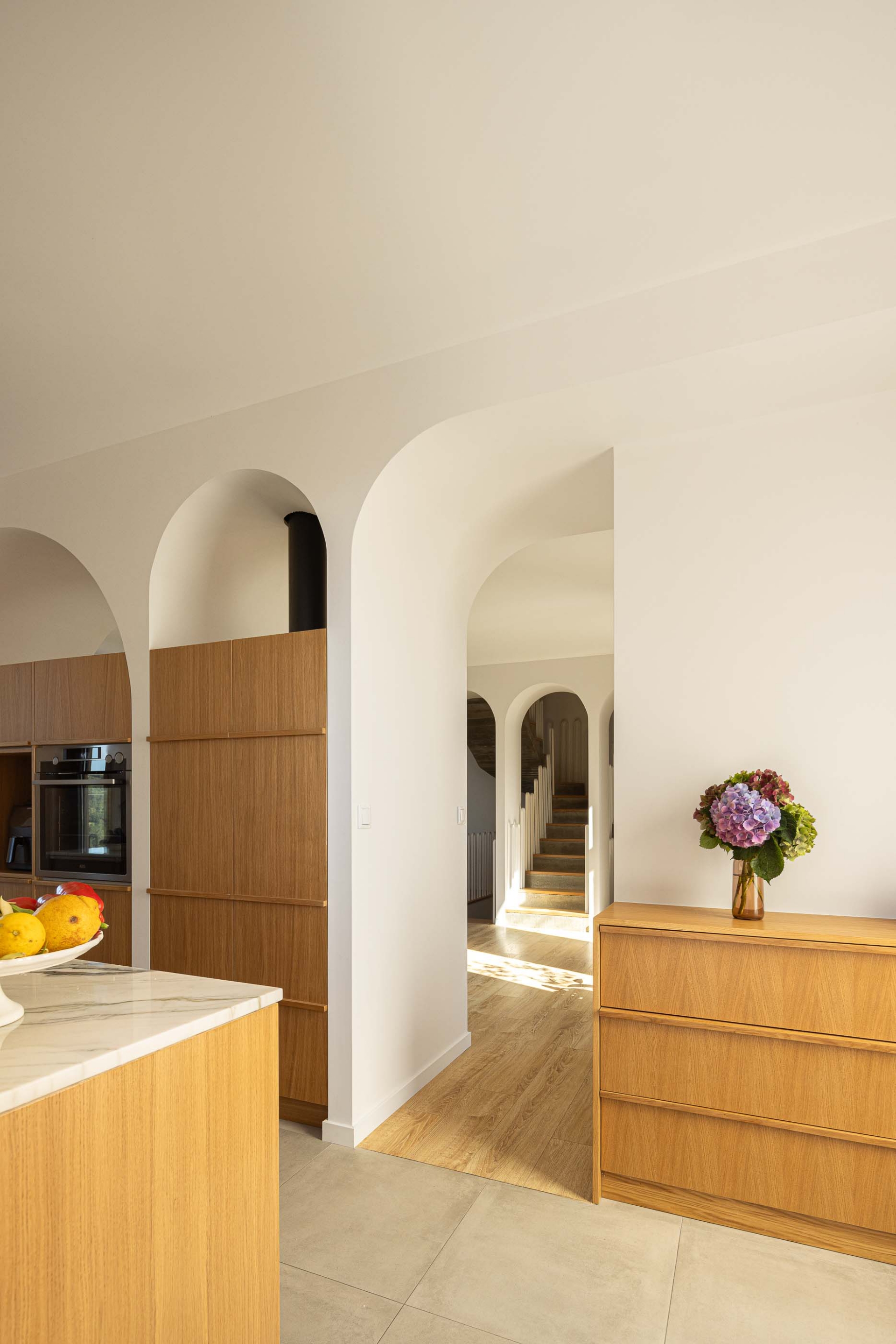 By employing the arch, a historically significant artistic element, the space was reorganized to create a new habitation brimming with fresh sensations. The ground floor, serving as the entrance, was transformed into a single, expansive area, subtly subdivided by two arcades. This ingenious arrangement gave rise to three distinct yet interconnected spaces for various uses: a kitchen, a living room, and a dining room. These refined elements forged an elegant symbiosis between form and function, offering three diverse moments of living within a unified space. The upper floor now features a central office, a support room, a sanitary installation, and storage. On the semi-buried lower floor, two bedrooms, a bathroom, and a laundry room provide private sanctuaries. In these private domains, tranquility reigns, bathed in the soft, constant northern light – a light synonymous with serenity. Connecting these levels is a suspended and decorative concrete staircase, clad in wood, meticulously designed to align with the precise metrics imposed by the arches. It seamlessly begins and ends within the architectural embrace of the arches.