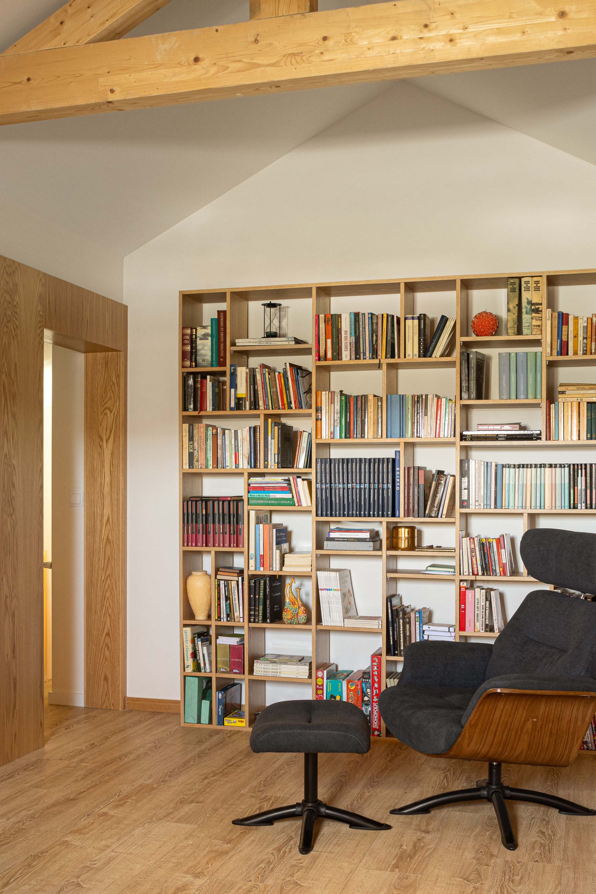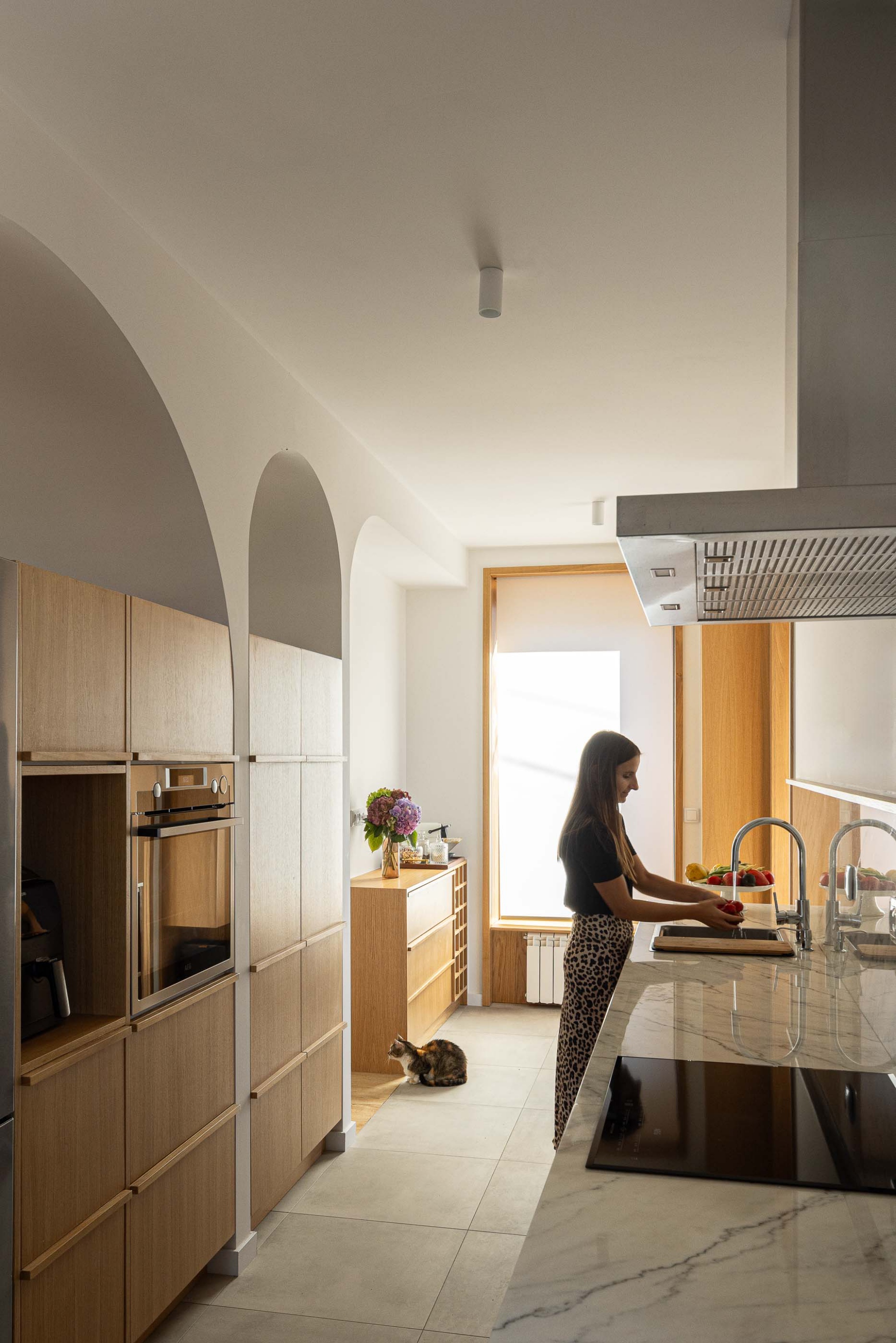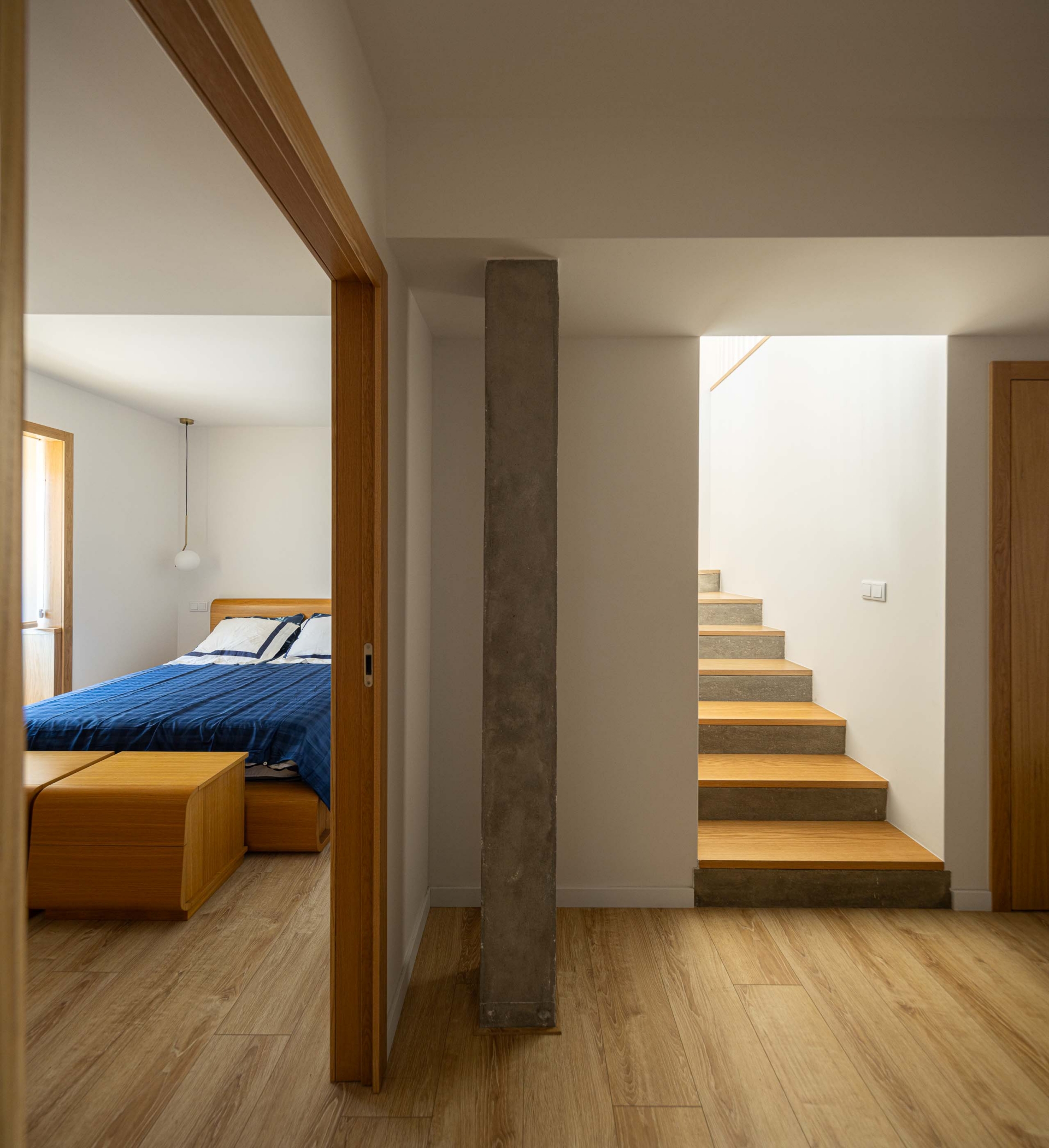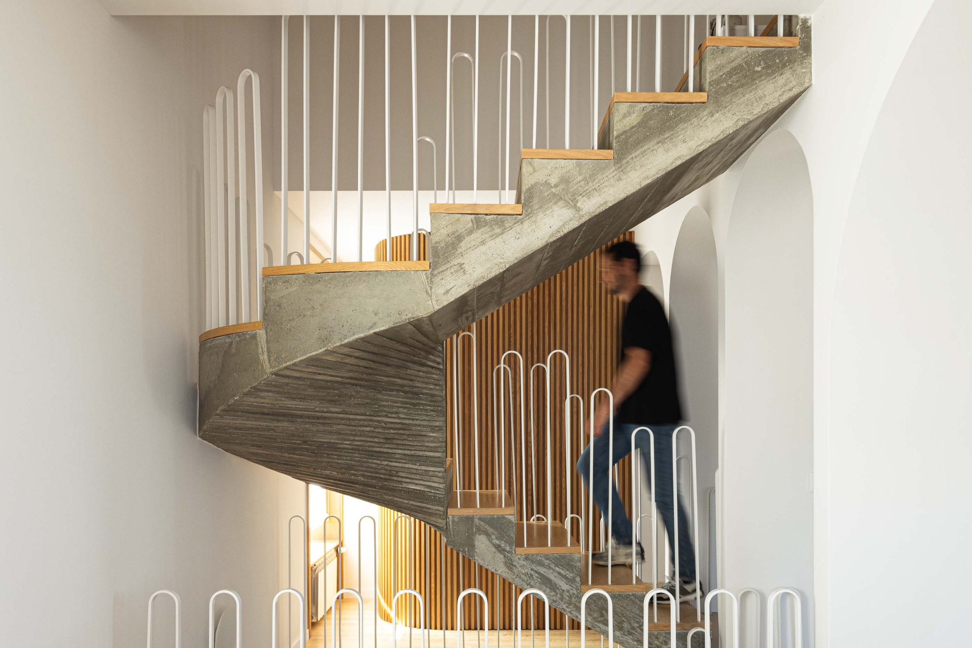 By employing the arch, a historically significant artistic element, the space was reorganized to create a new habitation brimming with fresh sensations. The ground floor, serving as the entrance, was transformed into a single, expansive area, subtly subdivided by two arcades. This ingenious arrangement gave rise to three distinct yet interconnected spaces for various uses: a kitchen, a living room, and a dining room. These refined elements forged an elegant symbiosis between form and function, offering three diverse moments of living within a unified space. The upper floor now features a central office, a support room, a sanitary installation, and storage. On the semi-buried lower floor, two bedrooms, a bathroom, and a laundry room provide private sanctuaries. In these private domains, tranquility reigns, bathed in the soft, constant northern light – a light synonymous with serenity. Connecting these levels is a suspended and decorative concrete staircase, clad in wood, meticulously designed to align with the precise metrics imposed by the arches. It seamlessly begins and ends within the architectural embrace of the arches.