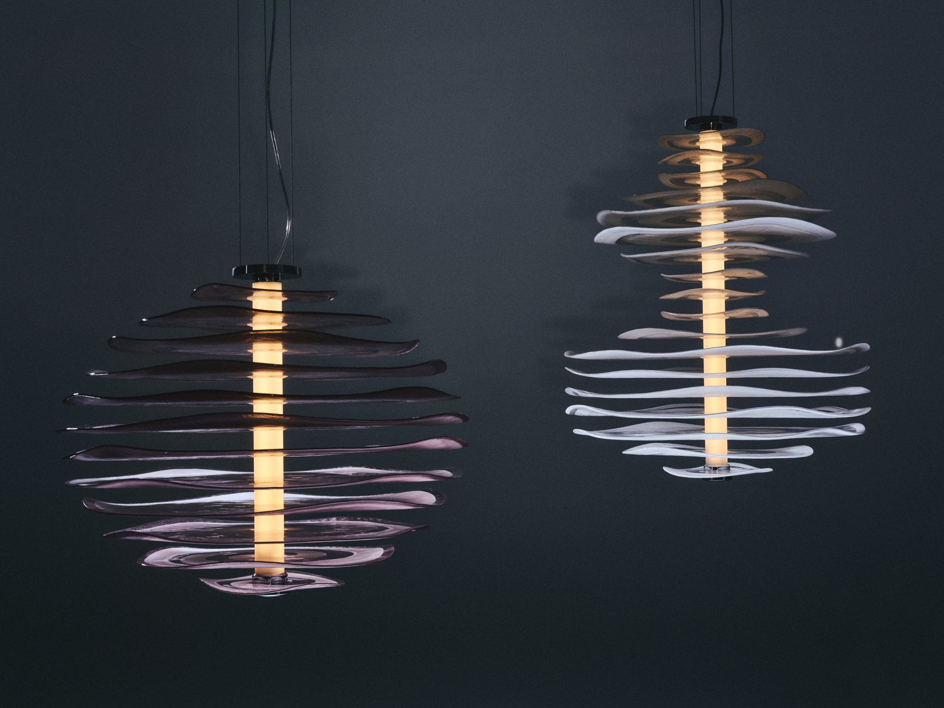 A composition of layers shaped by light. The name Profilo refers to the outline the lamp draws in space: a contour that emerges from the overall composition. The structure is built from a sequence of overlapping discs which, when seen from a distance, create clear and recognizable silhouettes - spherical, conical, or reminiscent of a contemporary chandelier. Made using the centrifuged glass technique, each element reveals thickness, material vibration, and subtle organic variations. An opaline spiral runs across the surface, softly diffusing the light and creating a measured, enveloping glow. The lighting technology is seamlessly integrated, allowing light to expand across the surfaces. Available in several configurations, Profilo maintains the same clarity and purity of form in every configuration.