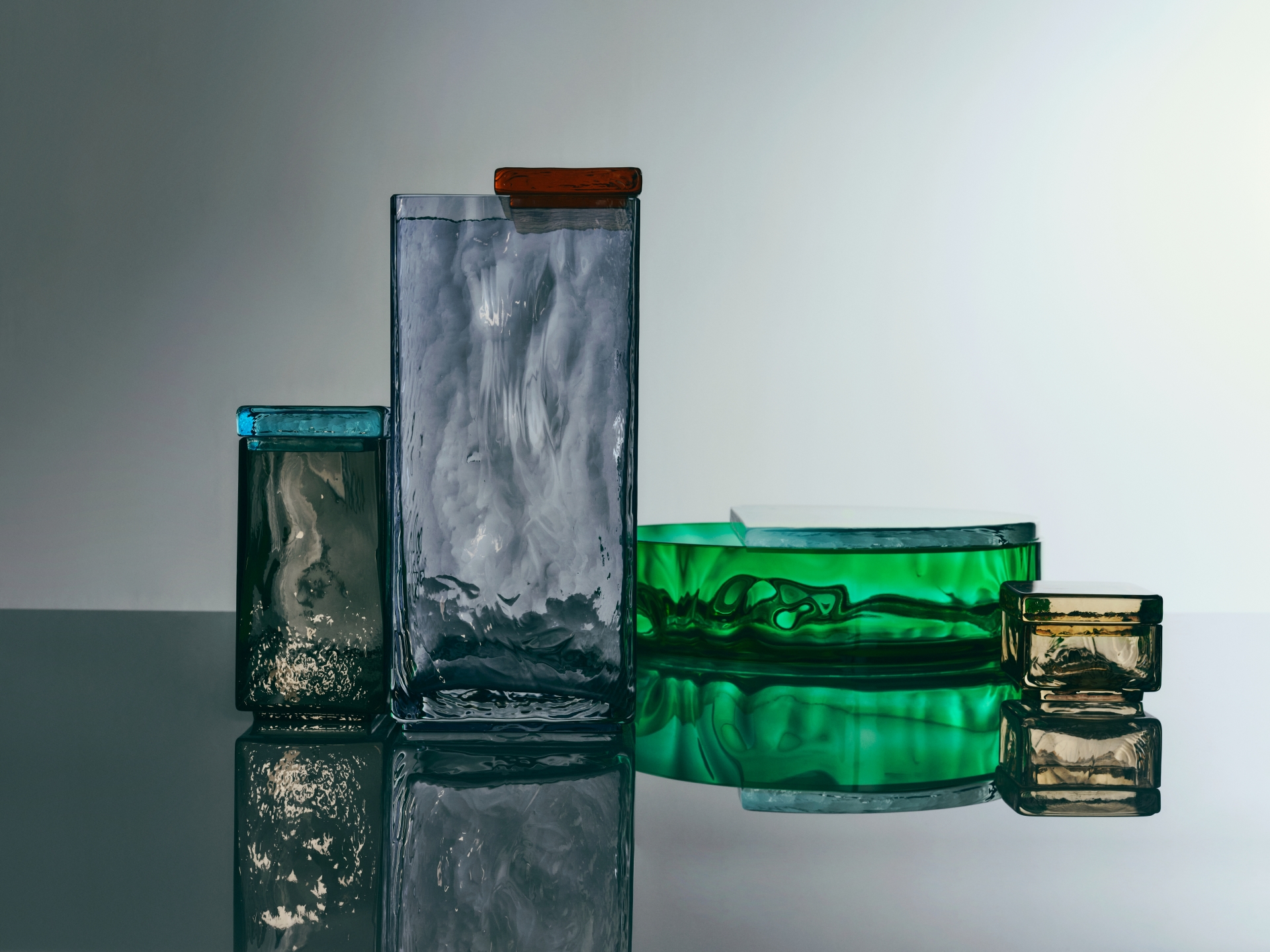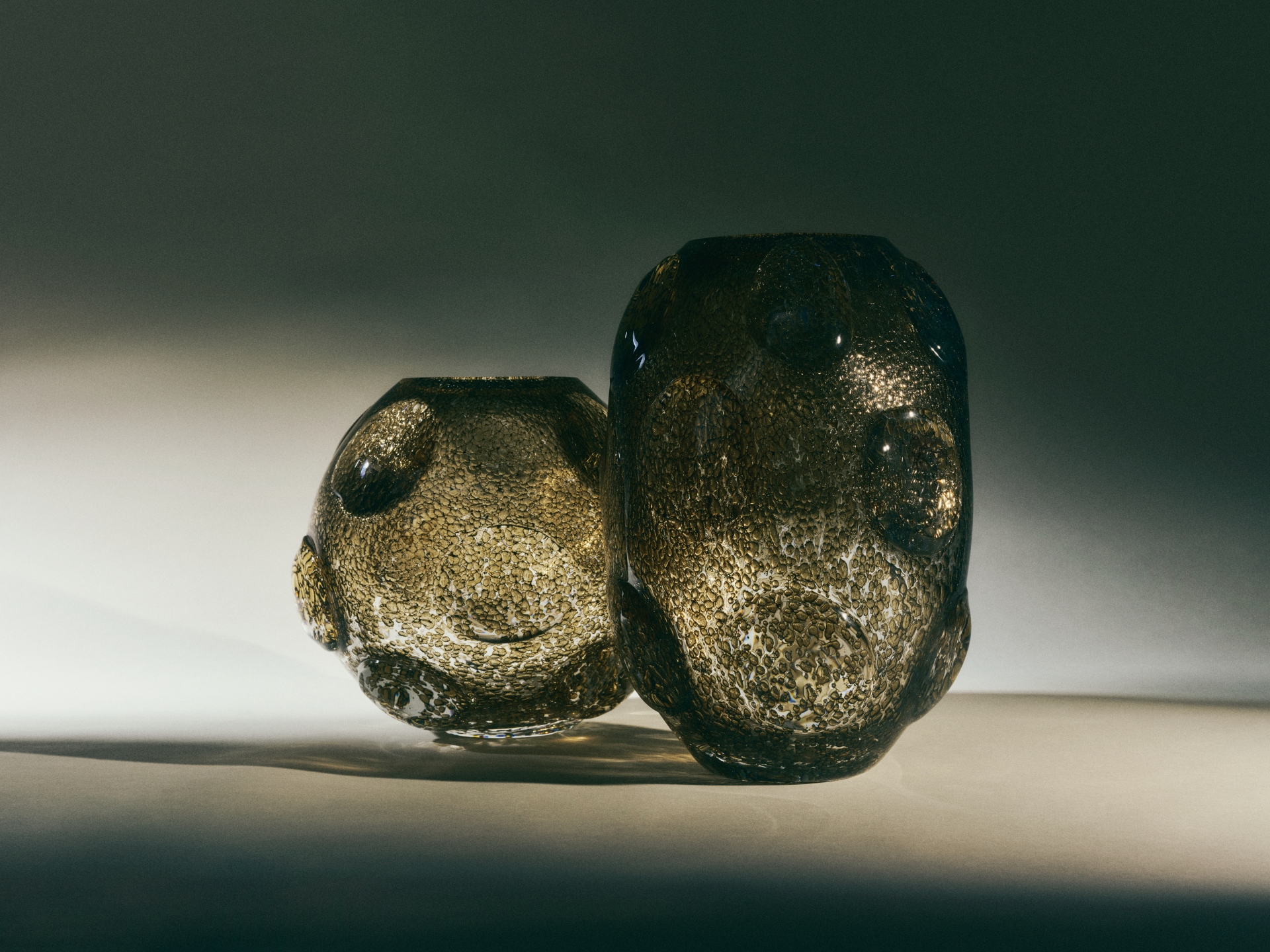 The exhibition continues with further novelties and extensions of existing collections. The new table and floor versions of Agave, designed by García Cumini, emphasize the collection’s vertical tension and material lightness, enhanced by the rugiada technique and a subtle gradient effect created with colored glass granules. Olori, by Studio Lani, celebrates strength and femininity through a series of vases that reinterpret the layered collars of traditional African adornment in an hourglass form. With Kado, Keiji Ashizawa conceives the vase as a small architecture inspired by ikebana: articulated surfaces composed of planes and measured inclinations guide the compositional gesture, while different glassmaking techniques (from incamiciato to fine ground shading) create a delicate balance between material, color, and suspension. The Lithos vases, designed by Emmanuel Babled, explore glass as a geological substance. A reactive mineral powder generates bubbles and inclusions that crystallize into a compact, irregular surface, evoking rock formations and fossil stratifications. Integrated optical lenses amplify the internal morphology, making each piece unique and deeply tactile. Podio, by Claesson Koivisto Rune, introduces a modular system of vases composed of container and lid, crafted using the corteccia technique and cast glass. Their varying proportions allow for stackable compositions that evoke small architectural forms, enhancing both the flower and the vase itself as a display object, hence the name Podio.