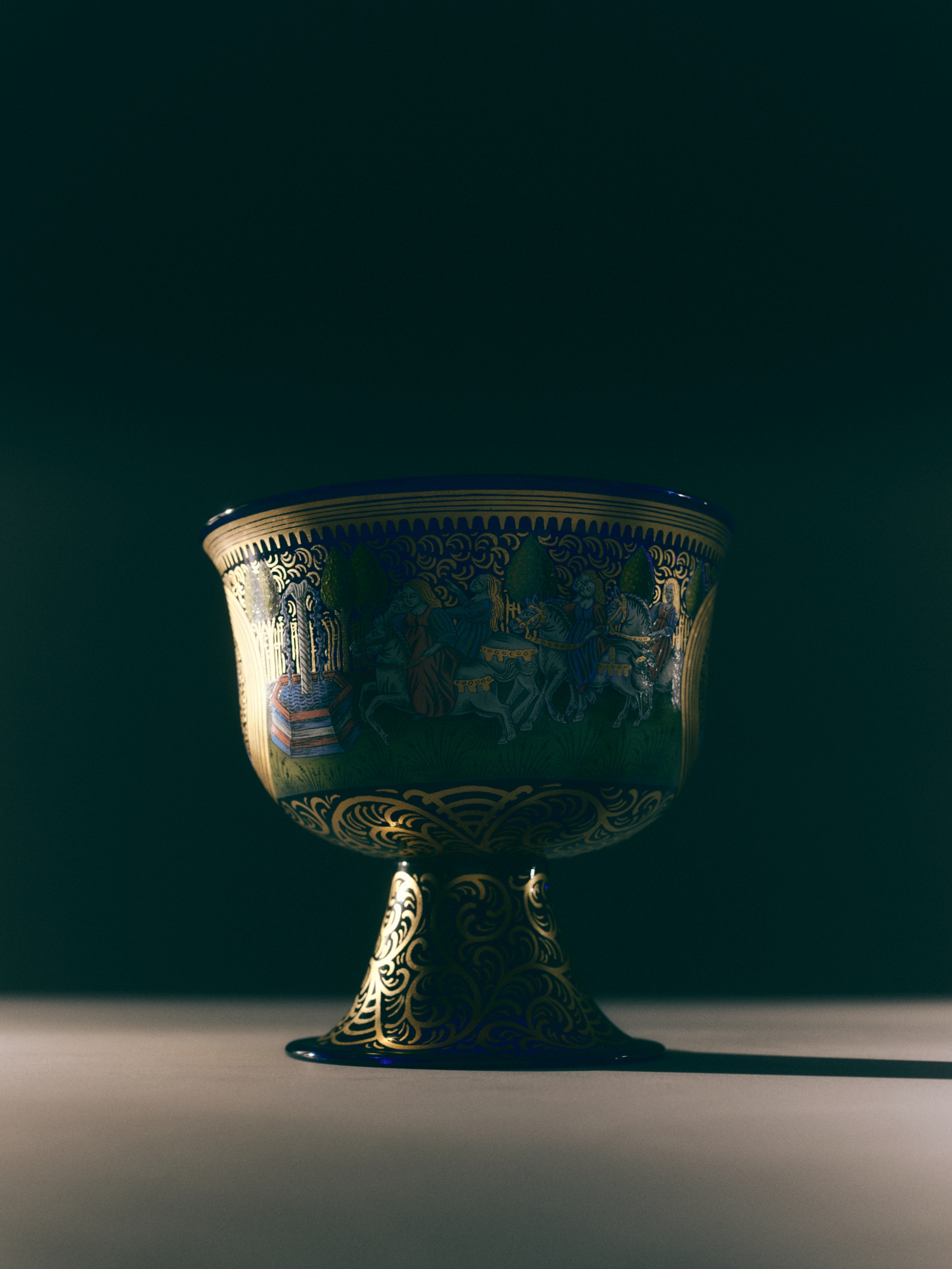 The exhibition concludes with the Coppa Barovier, a masterpiece of the Murano Renaissance created around 1460 and traditionally attributed to Angelo Barovier. Decorated with polychrome enamels and gold on deep blue glass, it is still produced today using the original techniques, preserving a tradition that spans more than five centuries.