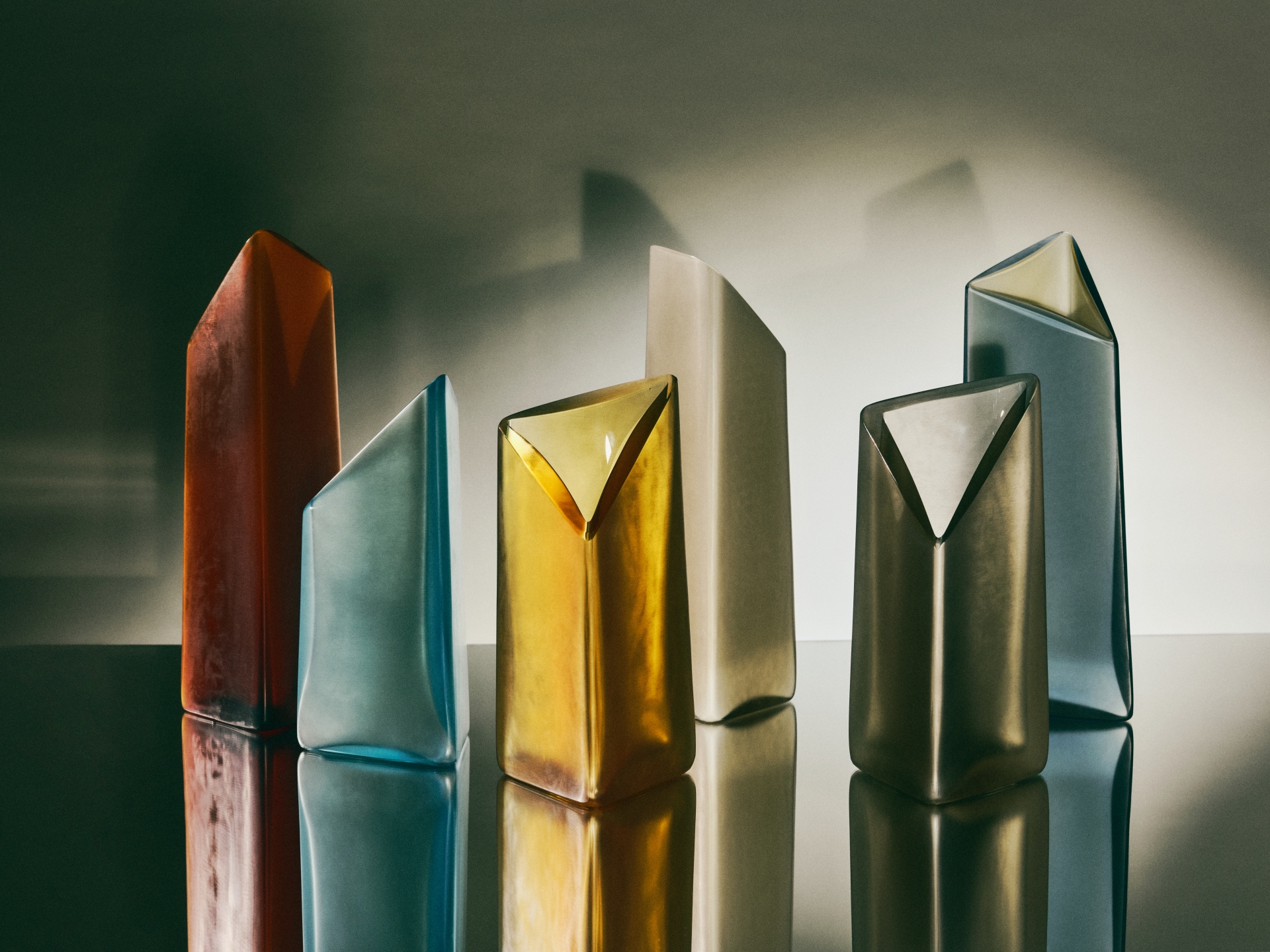 The name Kado brings together two meanings: 角 (corner) and 華道 (the art of flower arrangement). Inspired by ikebana, the collection by Keiji Ashizawa explores the balance between form, line, and space within an essential composition. The project consists of three sets characterized by the pairing of a tall vase and a low vase, offered in three color combinations: warm, cool, and neutral. The vase becomes a quiet architecture that guides the gesture and frames the presence of the flower, creating a harmonious dialogue between material and void. The tall vase is crafted using the incamiciato technique, with three layered glass strata that generate a refined chromatic contrast between interior and exterior. The softened surface, achieved through grinding, is finished with an oil treatment that preserves its tactile quality. The low vase, made of transparent colored glass, also undergoes a similar grinding process, resulting in a diffused and restrained presence. In both versions, the material reveals depth and nuance, turning volume into a balance between geometric rigor and visual poetry.