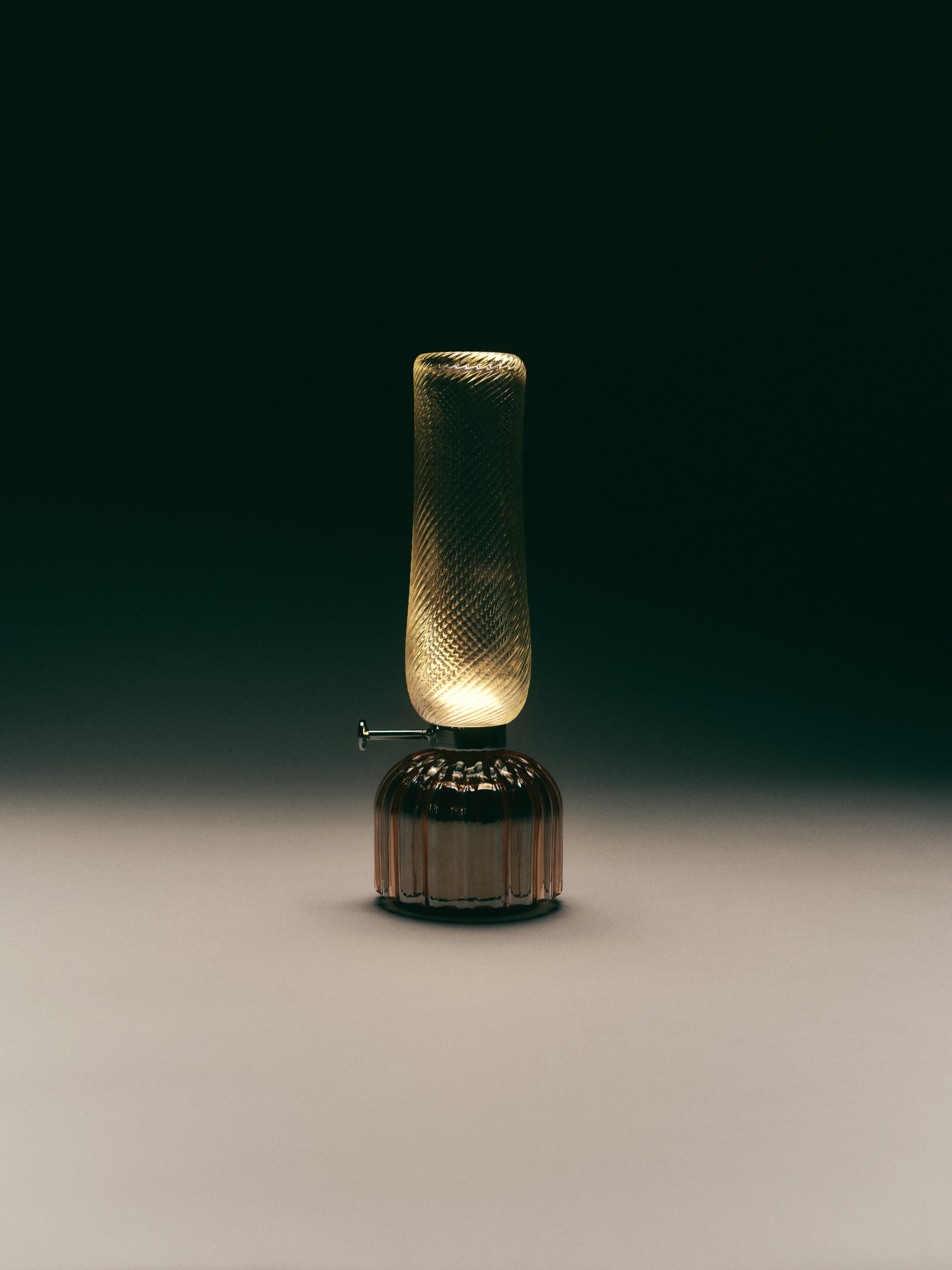 Inspired by the historical archive of Barovier&Toso, Aurora reinterprets the traditional oil lamp through a contemporary lens, transforming a gesture rooted in memory into a present-day object. Discreet, invisible lighting technology replaces oil and wick, preserving the intimacy of the ritual while allowing freedom of use. The colored ribbed glass base - molded with sixteen ribs and then blown - is combined with transparent glass diffusers crafted with a dense rigadin ritorto technique, generating refined optical vibrations and material depth. Aurora embodies a balance between tradition and innovation, where light becomes both living memory and contemporary gesture.
