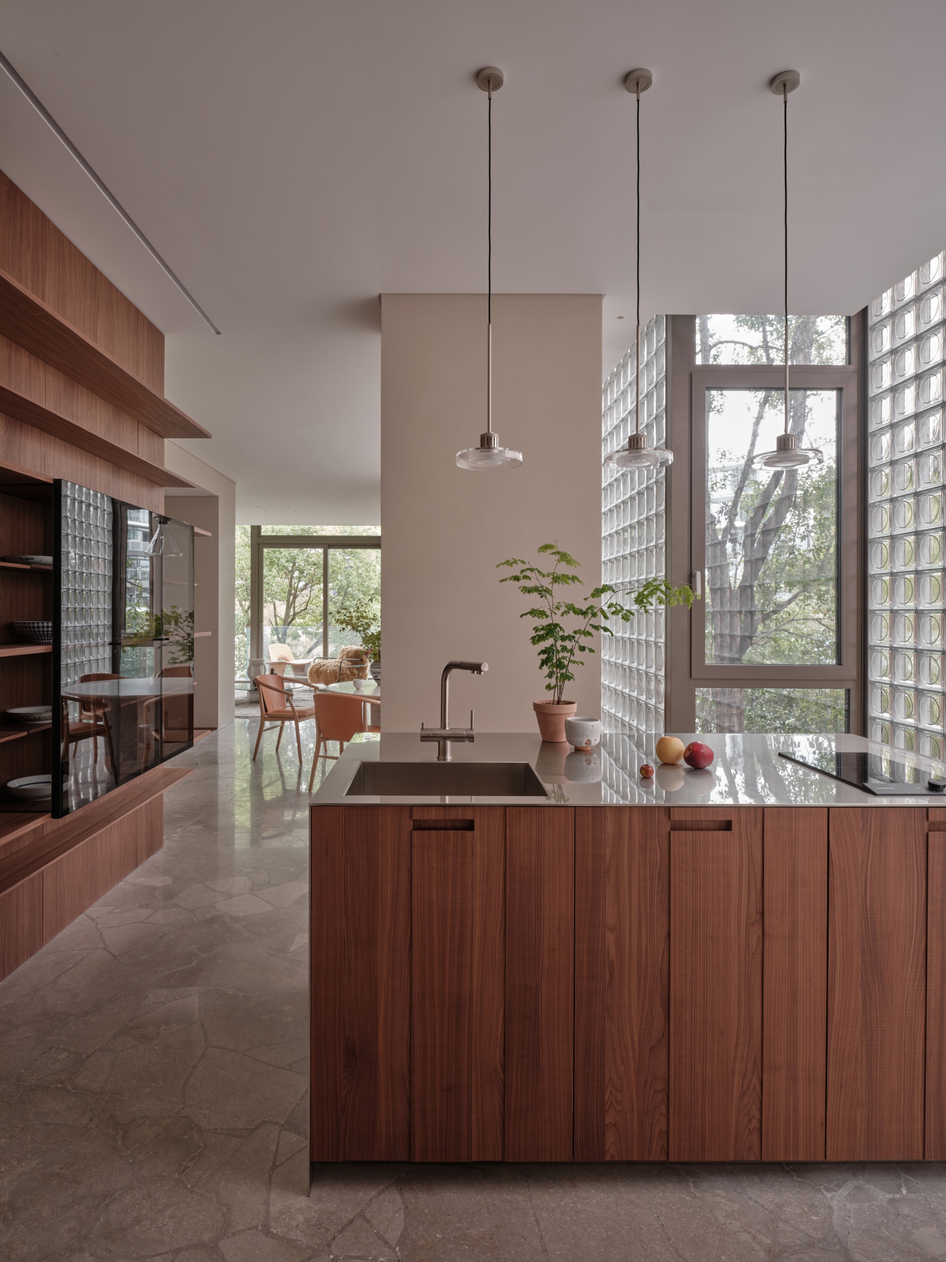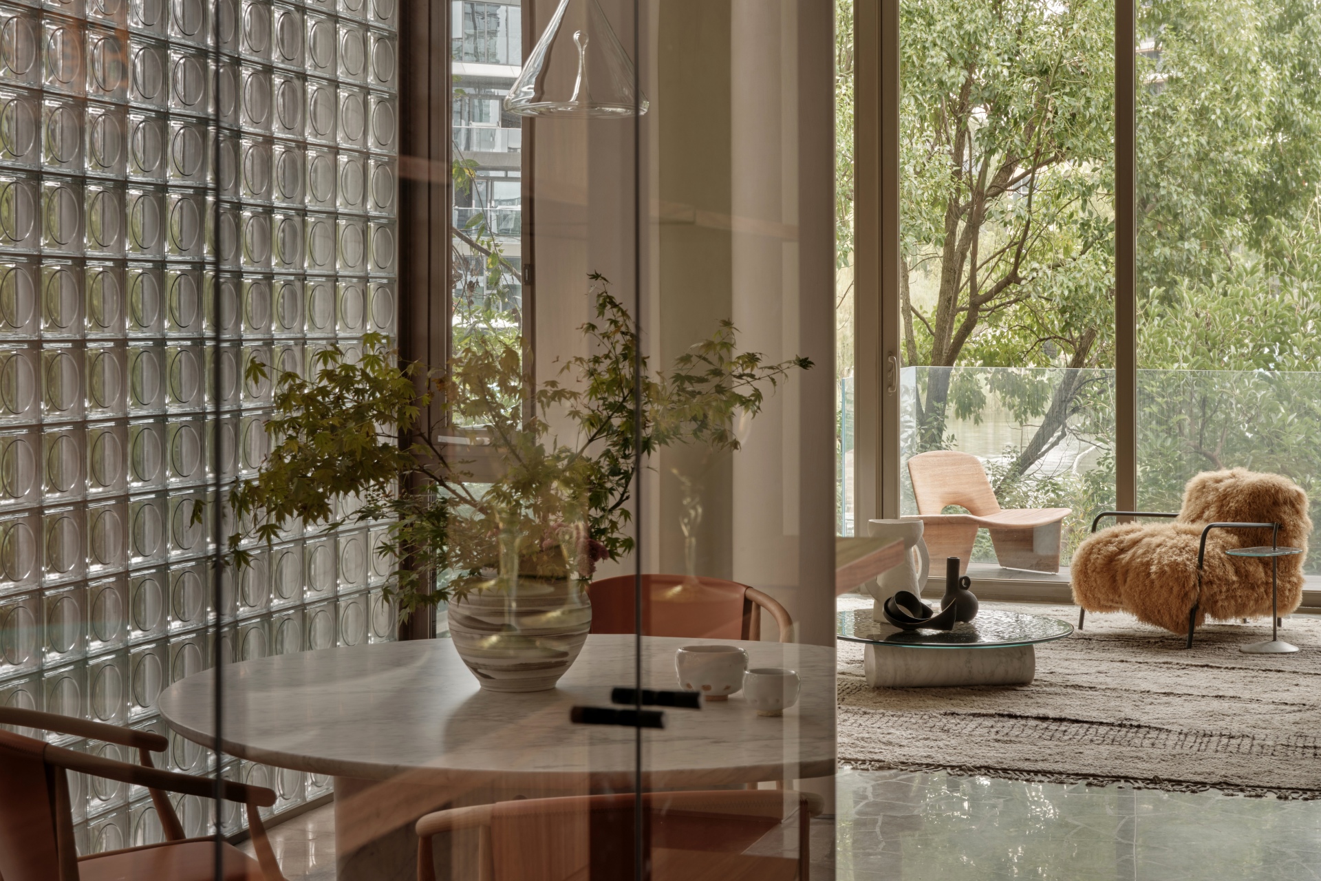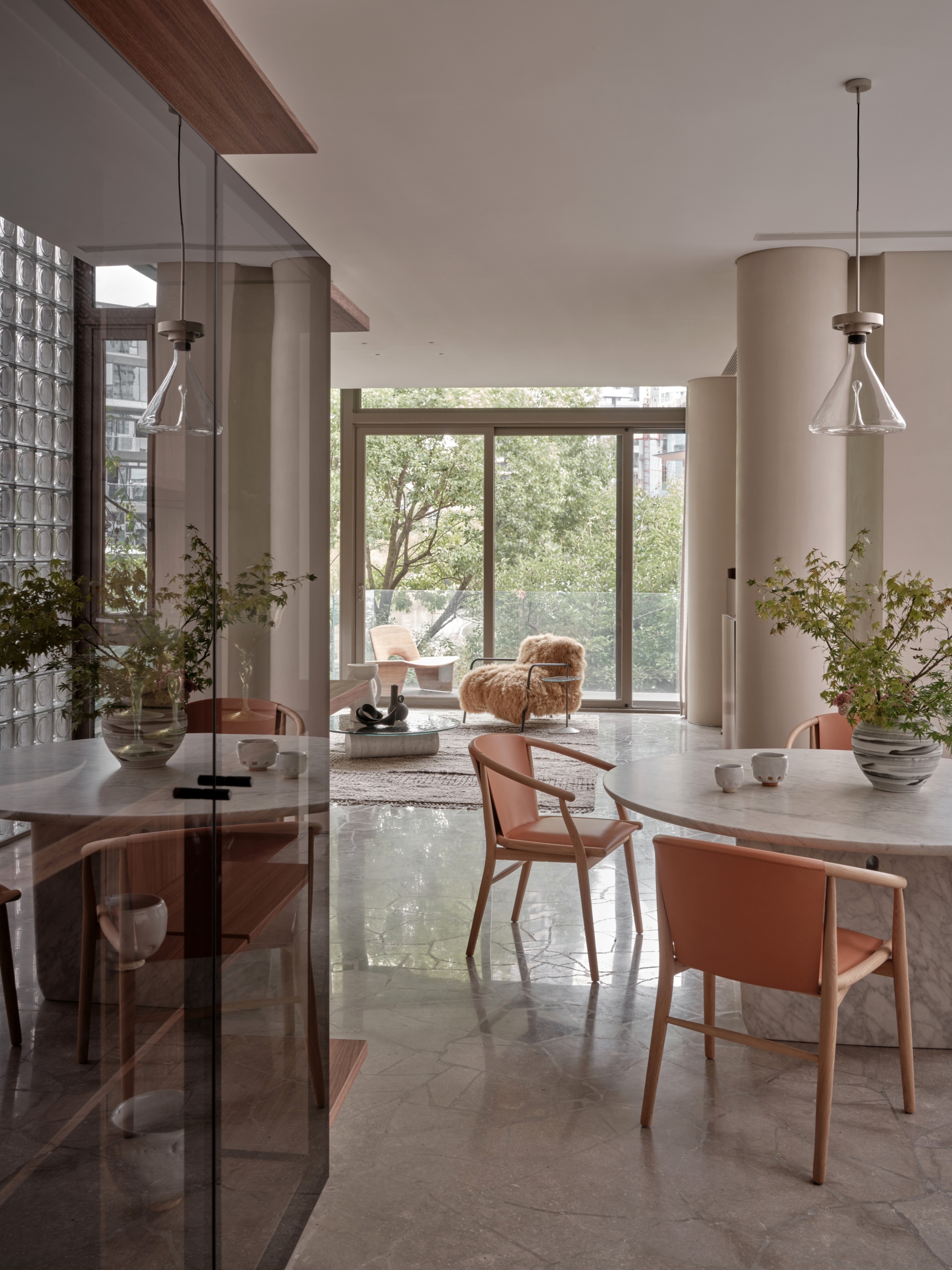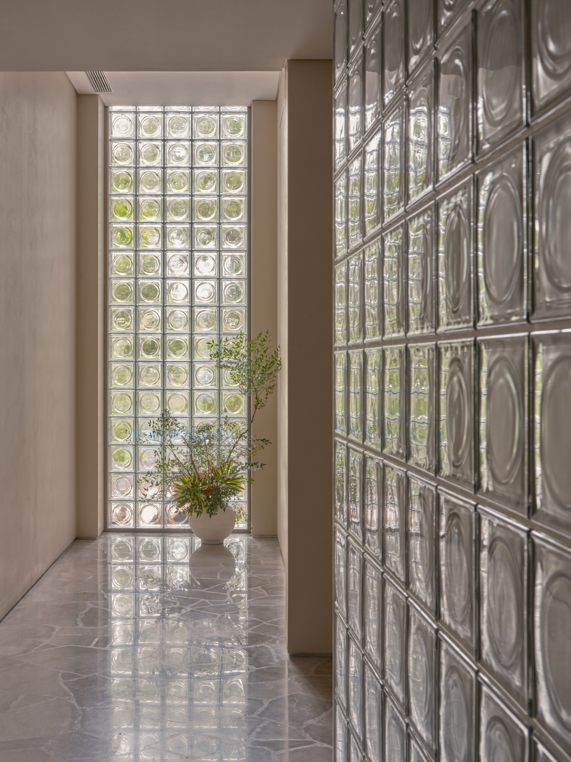 To counter the challenge of long, narrow interior spaces, the architects employed a clever interplay of materials to filter and diffuse the intense light. Transparent and semi-transparent elements were incorporated, softening the natural light and addressing privacy concerns without sacrificing brightness. The material palette is a carefully curated study in texture and atmosphere. For the flooring, the team developed a unique monolithic terrazzo casting process, crushing beige fine-grain veined marble and mixing it with pebbles and pearl shells to create a richly textured, one-of-a-kind surface. The building’s facades and interiors layer frosted glass bricks, natural black walnut wood, and raw cement. This combination of materials - where the ethereal quality of filtered light interweaves with the raw tactility of the surfaces - results in a calming, soft, and serene atmosphere.