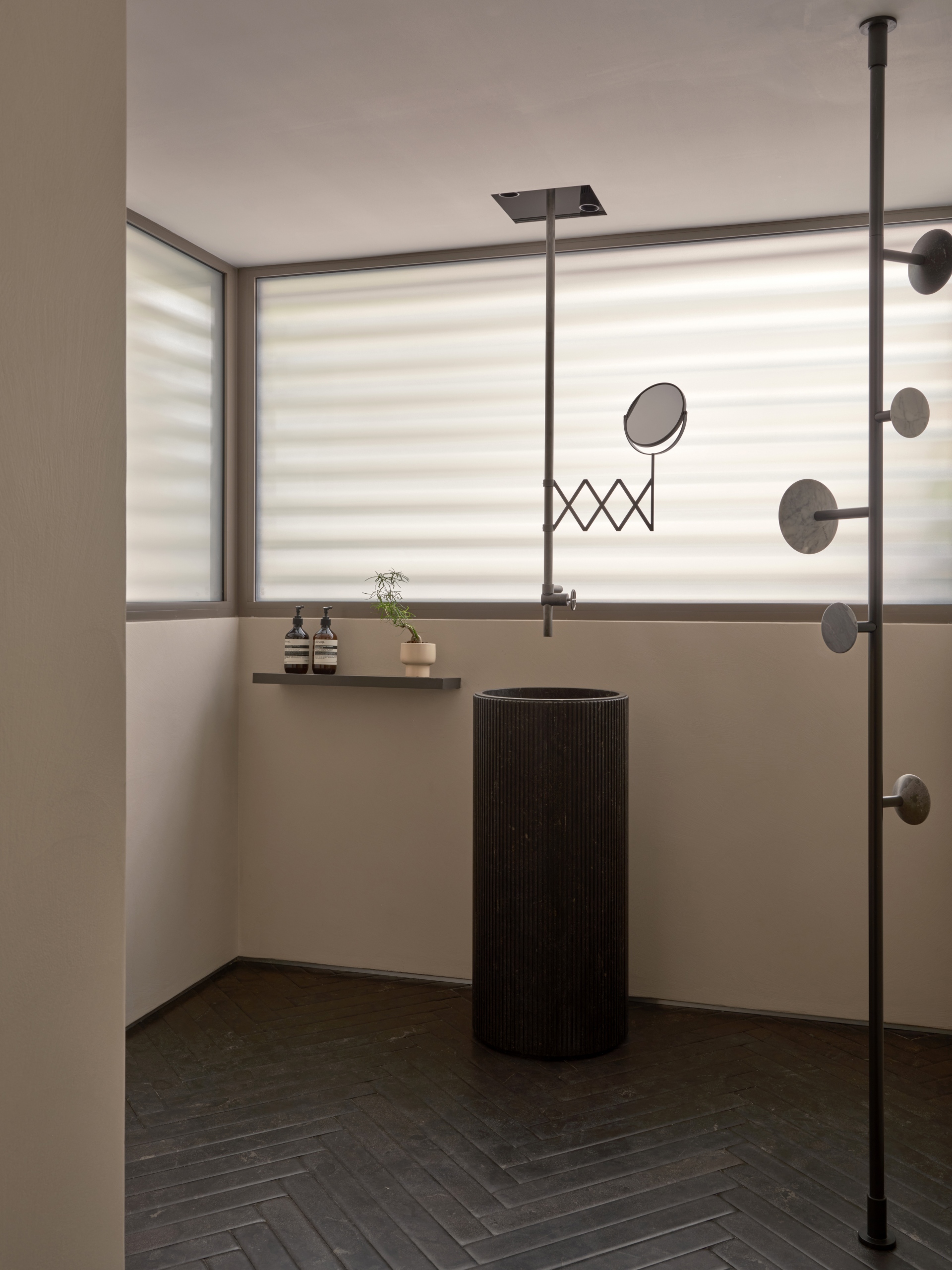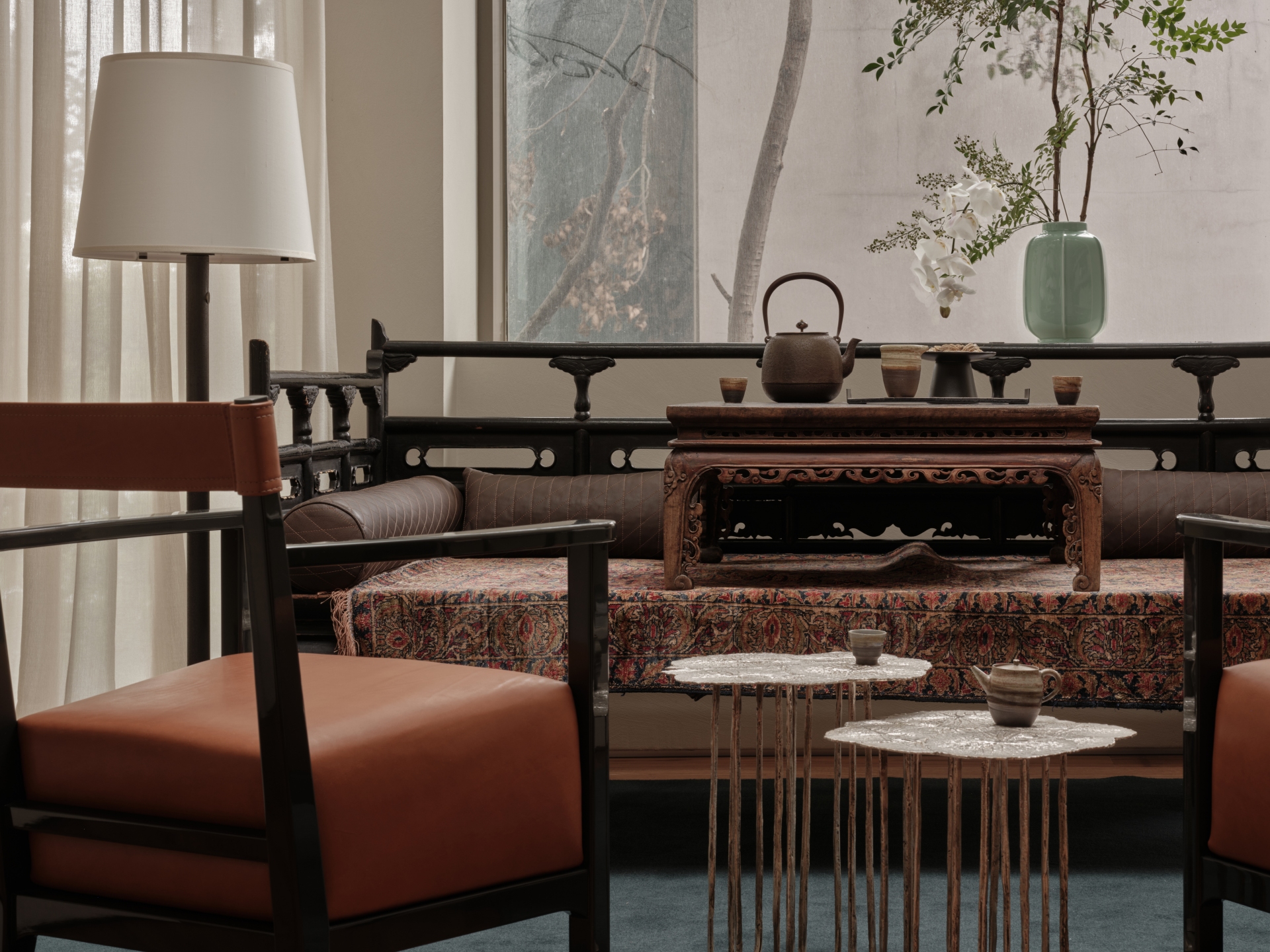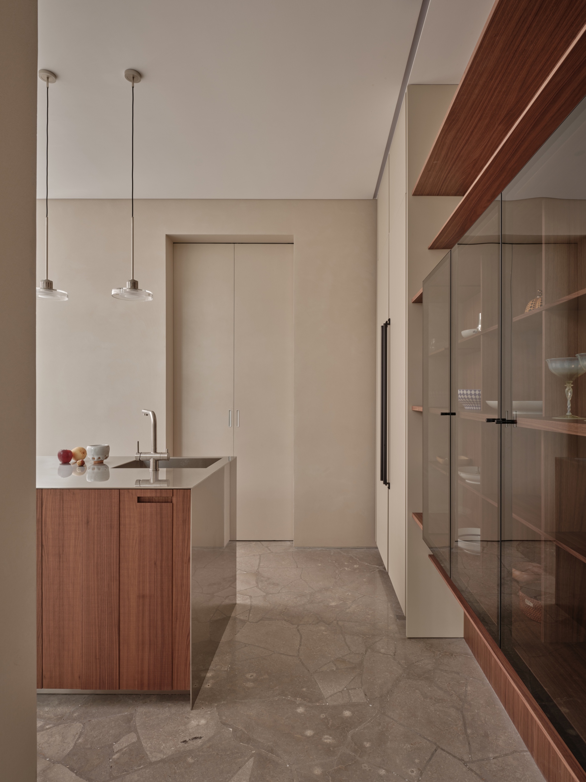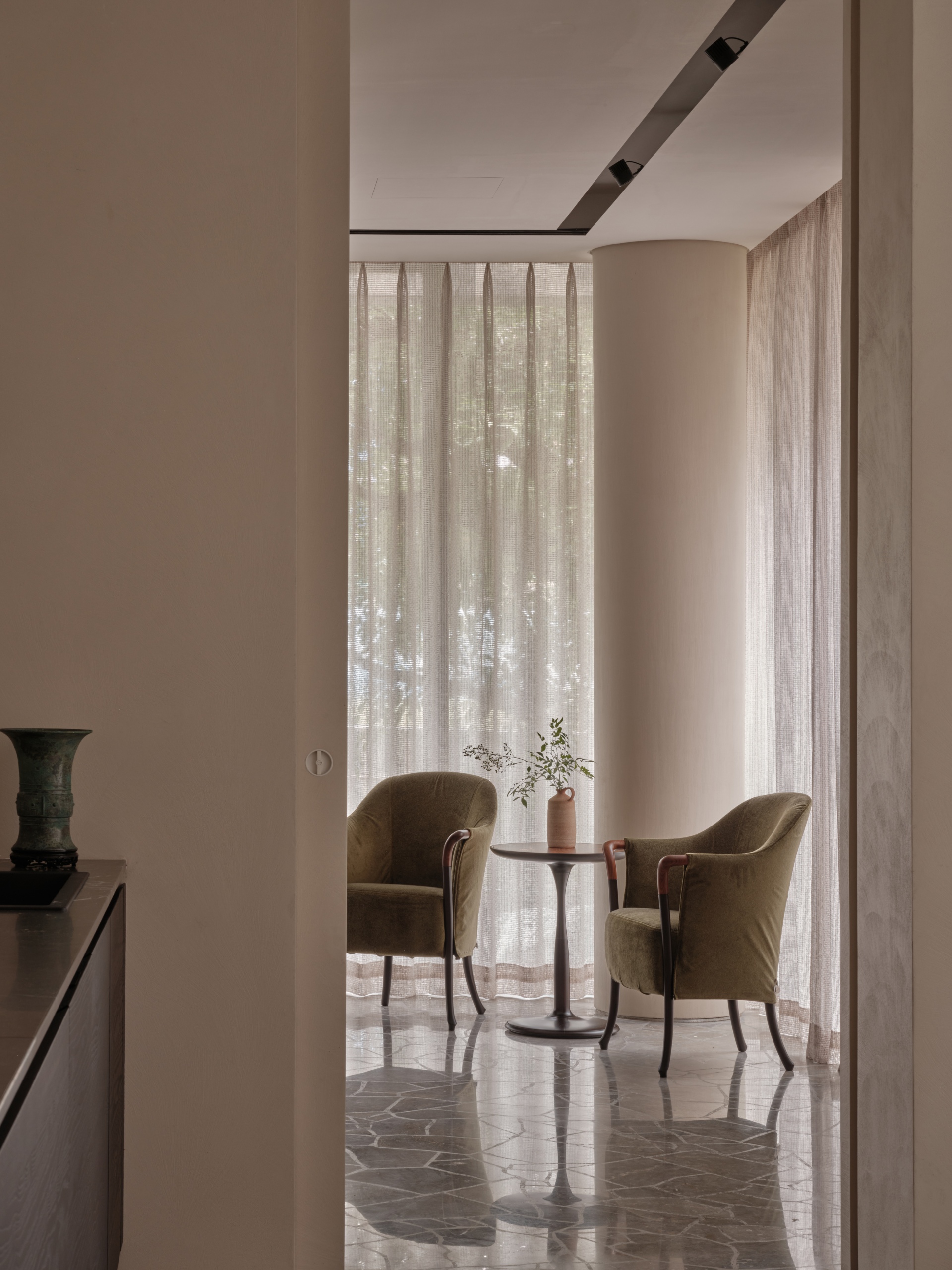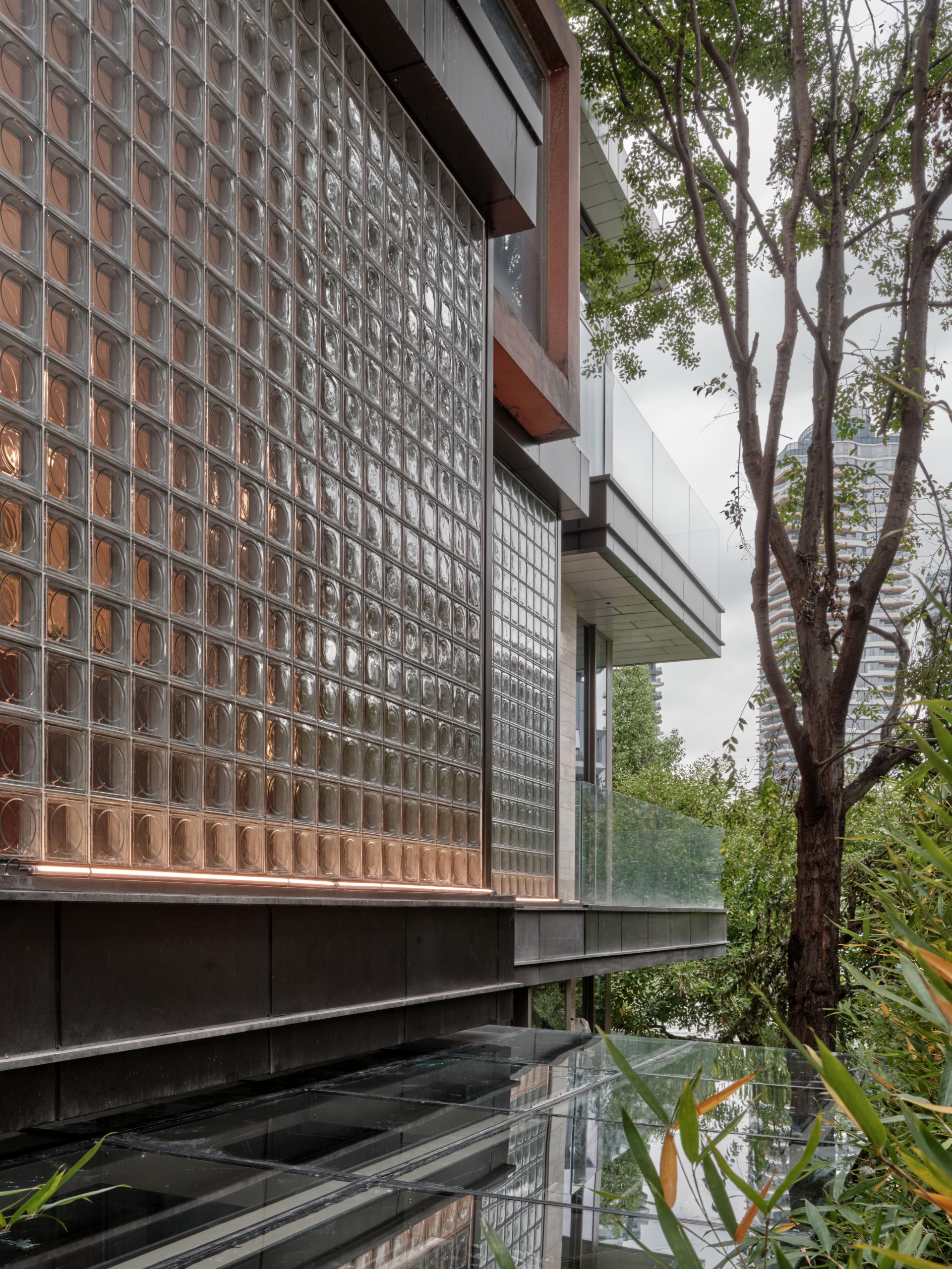 To counter the challenge of long, narrow interior spaces, the architects employed a clever interplay of materials to filter and diffuse the intense light. Transparent and semi-transparent elements were incorporated, softening the natural light and addressing privacy concerns without sacrificing brightness. The material palette is a carefully curated study in texture and atmosphere. For the flooring, the team developed a unique monolithic terrazzo casting process, crushing beige fine-grain veined marble and mixing it with pebbles and pearl shells to create a richly textured, one-of-a-kind surface. The building’s facades and interiors layer frosted glass bricks, natural black walnut wood, and raw cement. This combination of materials - where the ethereal quality of filtered light interweaves with the raw tactility of the surfaces - results in a calming, soft, and serene atmosphere.