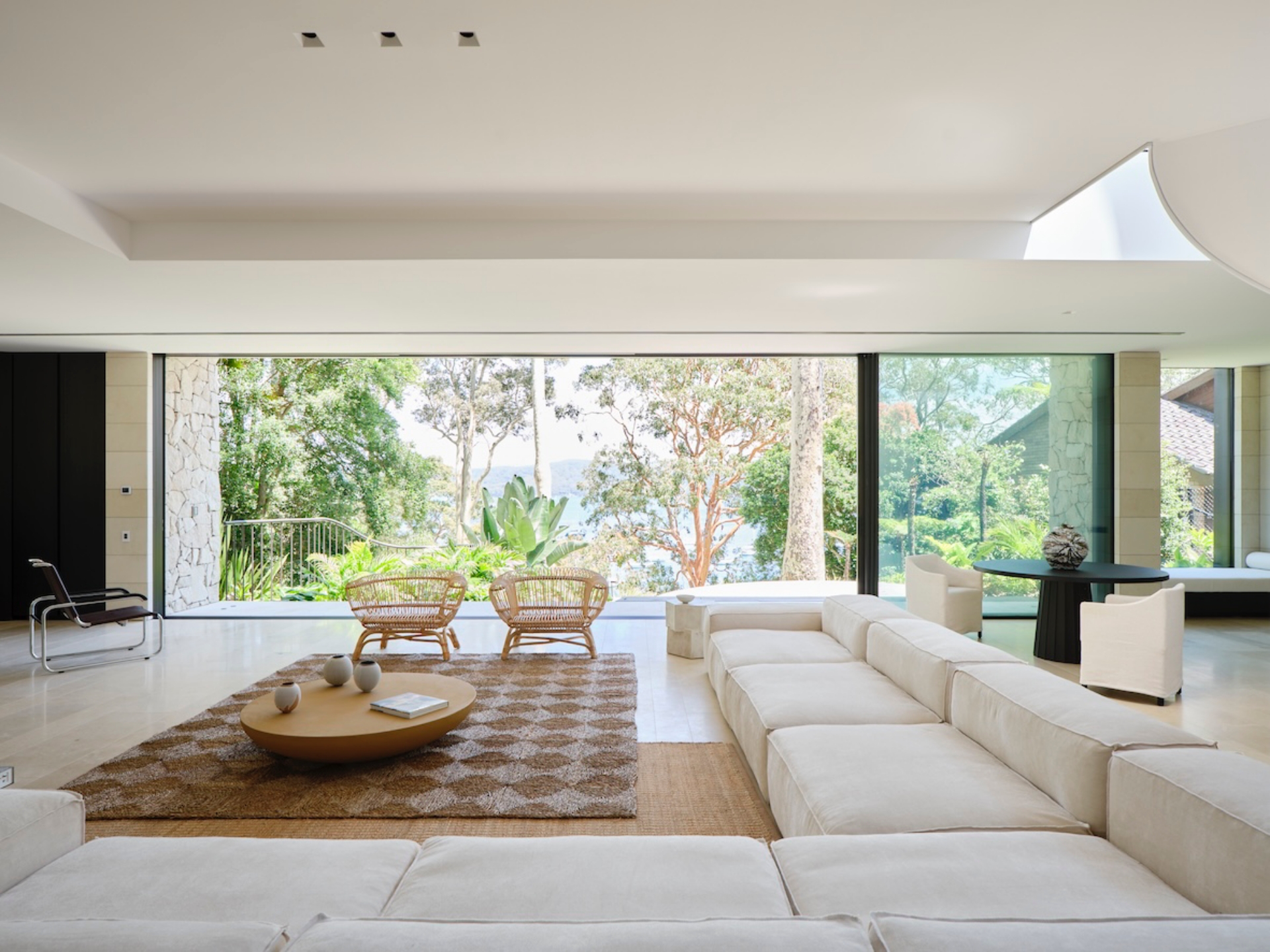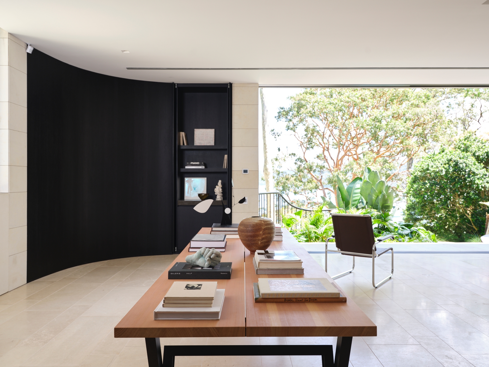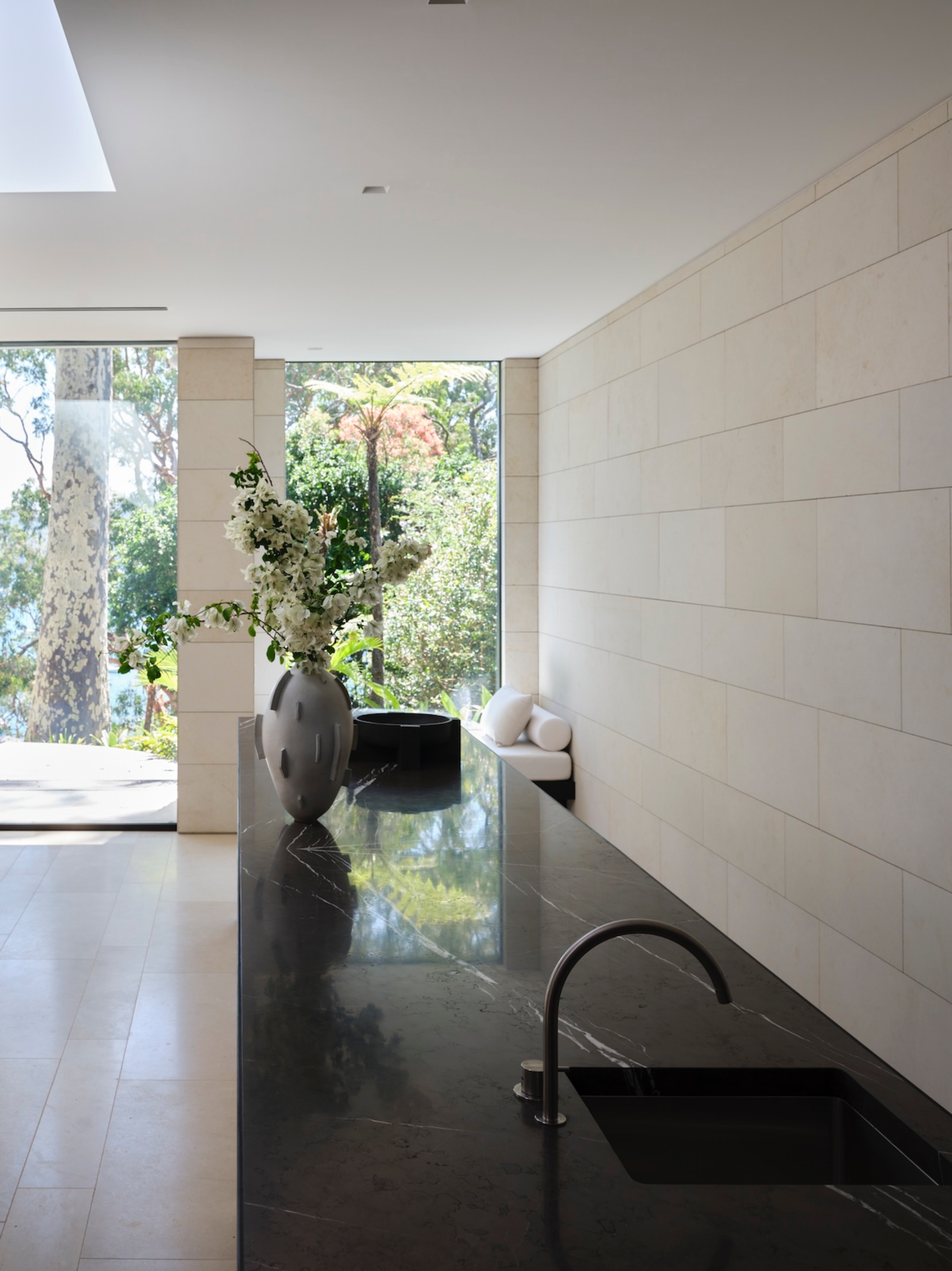 Inspired by the architecture's rough-hewn sandstone cladding, Mathieson introduced the material in a more refined form within the pavilion. All lower-level walls are clad in sandblasted limestone, with floors in honed limestone, offering a subtle shift in color and texture. The floor’s seemingly random lay pattern creates a "homogenous surface with an artisanal quality", avoiding an overly formal feel. Dark timber veneer cabinetry and doors, an upholstered window seat, and the kitchen’s blackened steel frame and pietro grigio marble benchtop punctuate this neutral envelope with essential moments of depth.