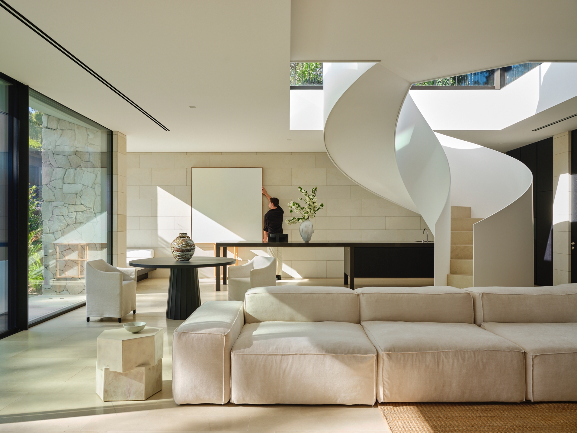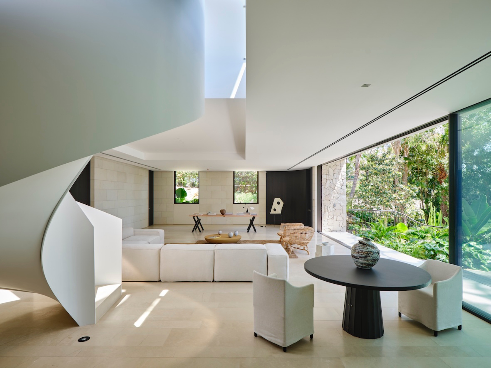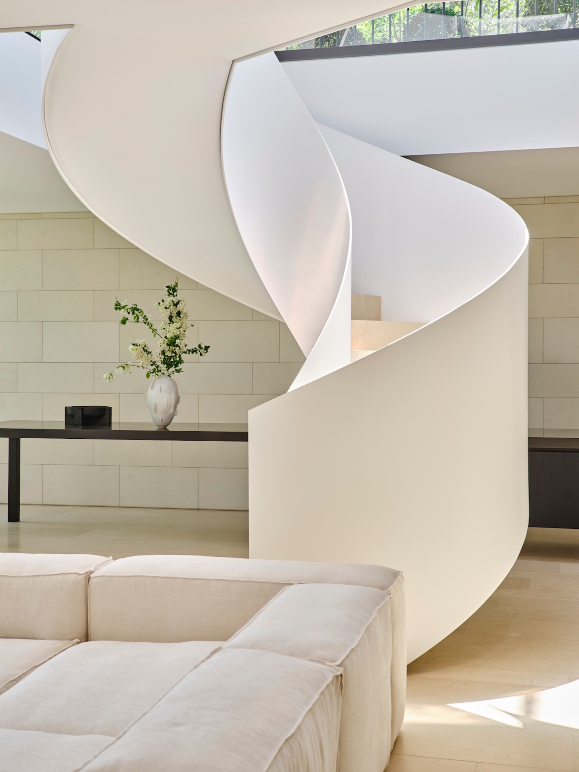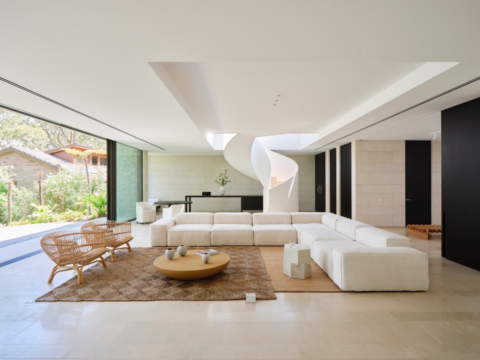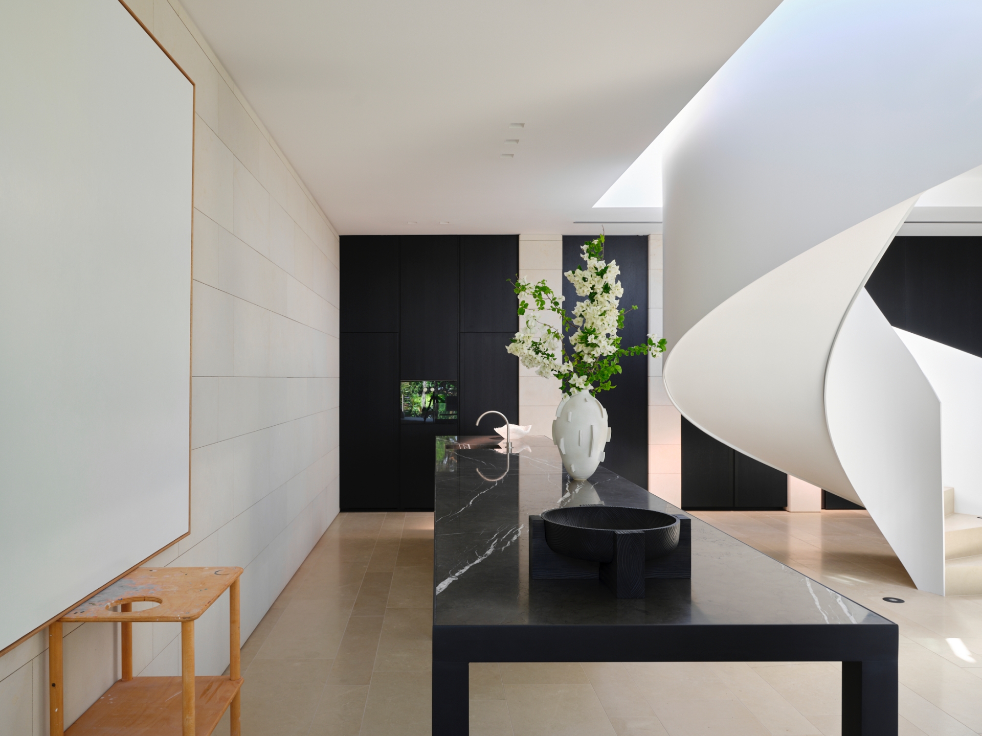 Along the northern edge, a fully equipped kitchen features a refined form that eschews traditional appearances. "One end is designed as an elevated table to function as a bar or a place to congregate with friends," describes Mathieson. A raised ceiling follows the rectilinear void of the spiral stair, accentuating this central feature and defining the main lounge area below. Here, communal furniture invites occupants to unwind against a backdrop of garden views, ensuring flexibility for the family’s evolving needs.