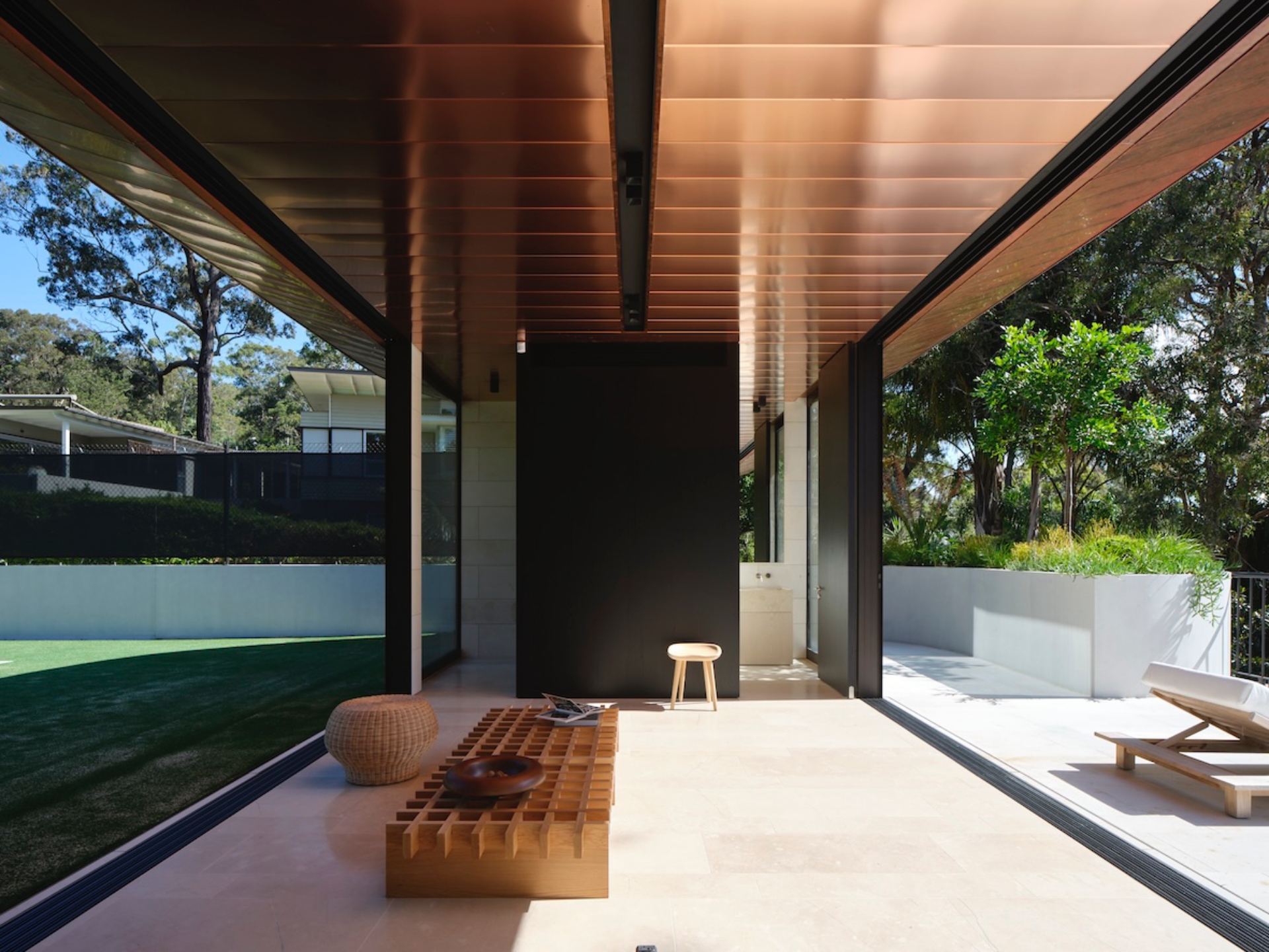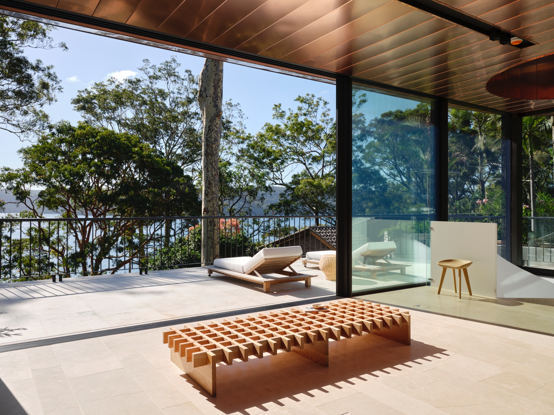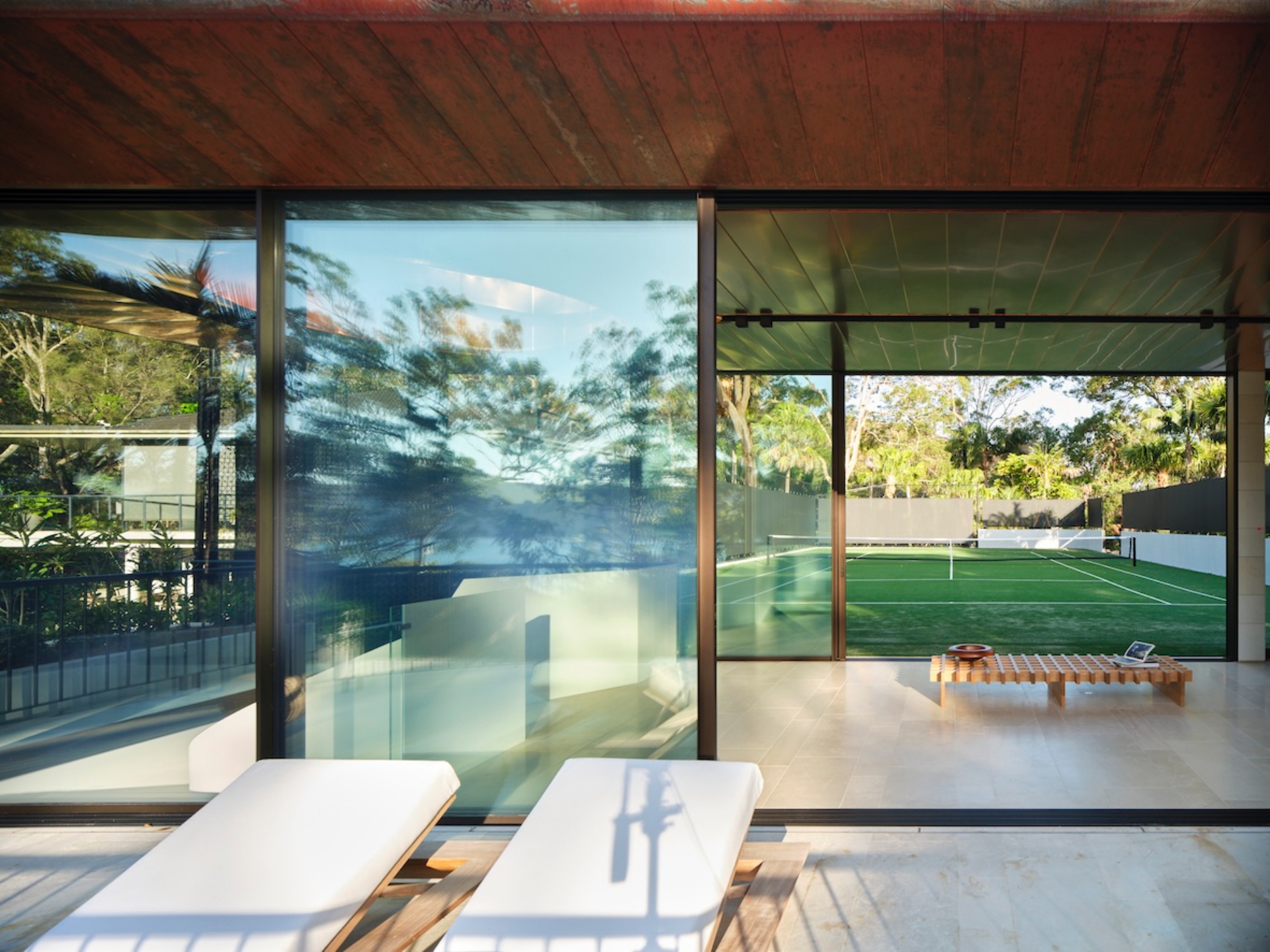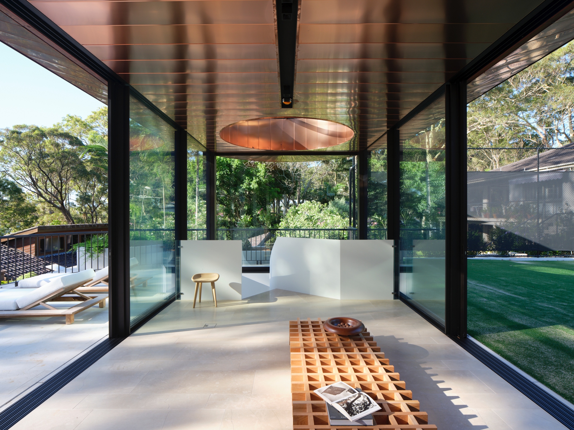Embracing a vision for seamless indoor/outdoor flow, Mathieson extended the building’s copper-clad roof inward, creating a sailing ceiling plane that links the upper-level interior and terrace. “The copper gently reflects the surrounding tree canopies, bounces light around the interior and, over time, will patina to develop a character of its own,” he says. To the south, a kitchenette and bathroom are concealed behind a timber veneer-clad wall. Broad glazed sliding doors open the main volume laterally to the east-facing tennis court and the elevated, west-facing terrace. This open arrangement draws the landscape and water views through the structure, crafting an elevated, immersive site experience.