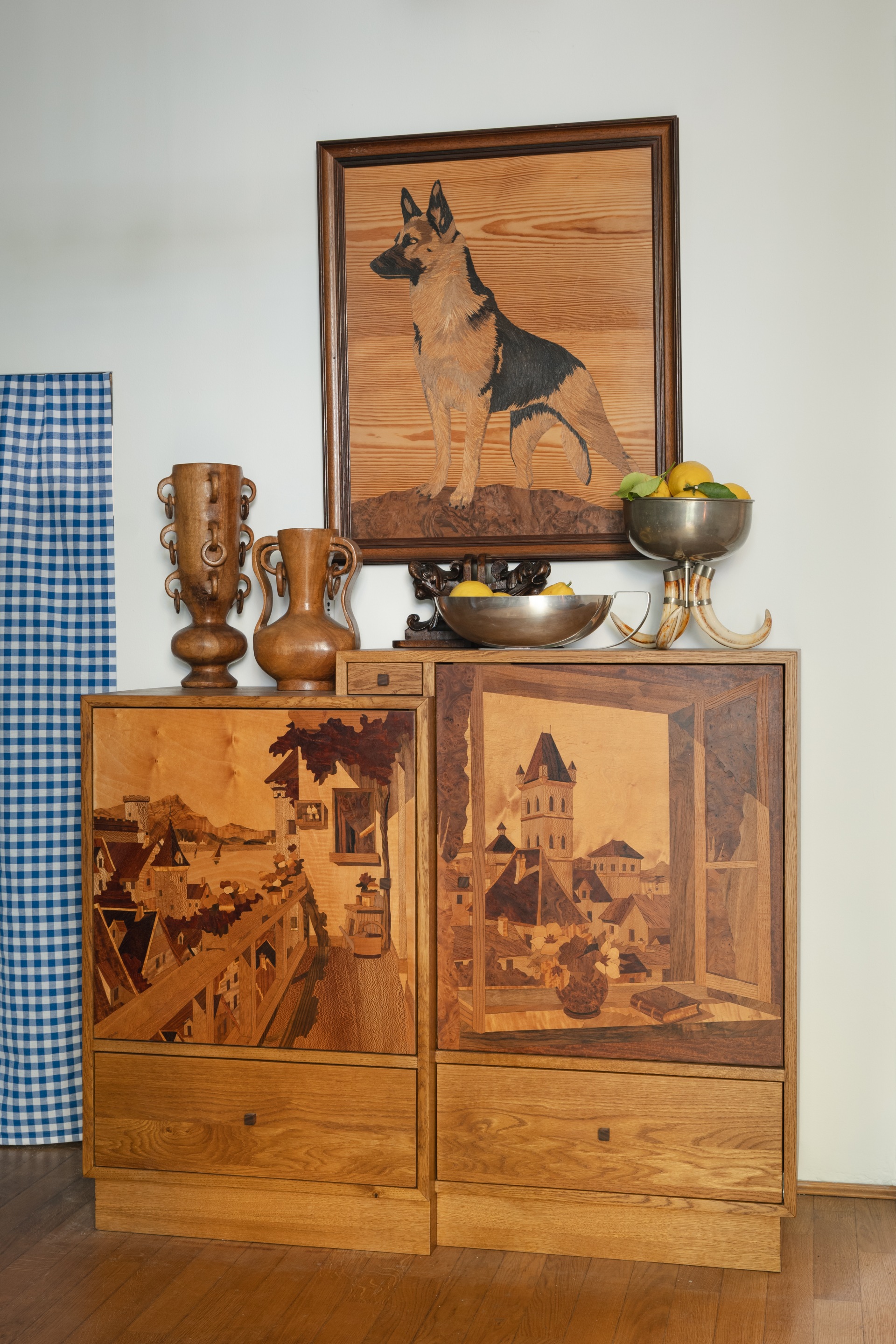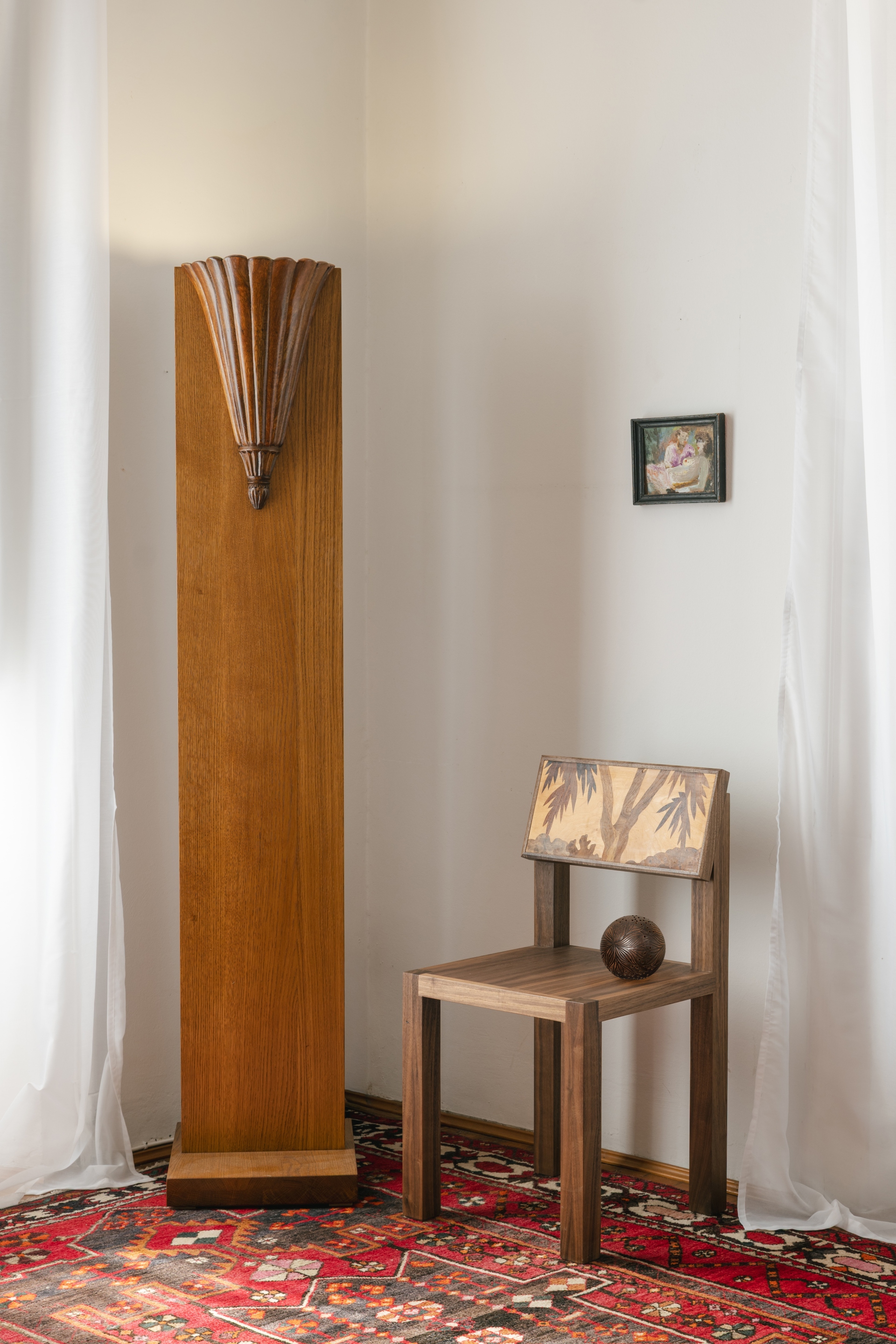 The new furniture collection, marking his shift from a set designer in the fashion world, is rooted in the interlocking of upcycled pieces. This hybridity is seen in solid wood chairs with a deliberately rudimentary, almost minimal design, which integrate ornamental elements such as marquetry panels or tin bas-reliefs into their backs, legs, or seats. This paneling principle also applies to a series of folding screens whose leaves encase small-format artworks. The two-in-one objects extend to steles that cleverly merge with vases. Billore insists his approach is sentimental, not designer-driven; he aims to invent a new function for "somewhat outdated, forgotten, neglected objects," changing the way we look at old things without any sense of nostalgia.