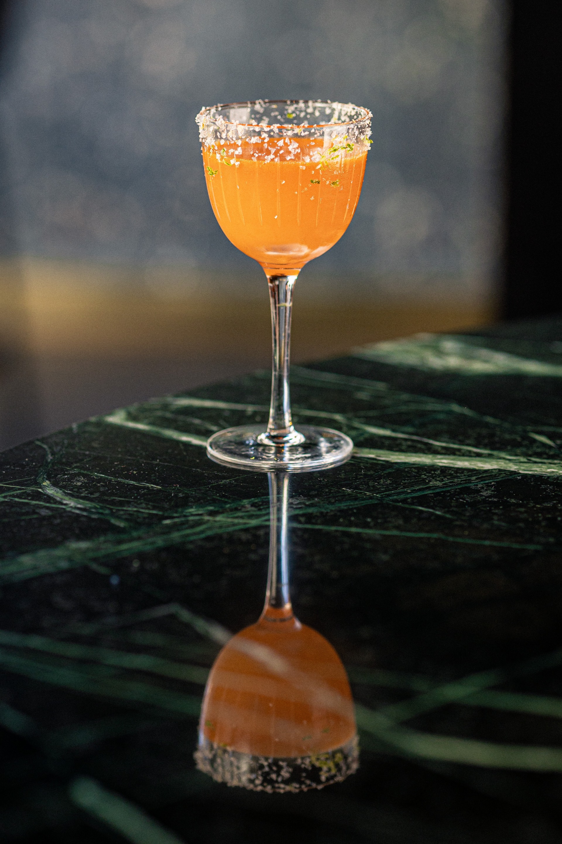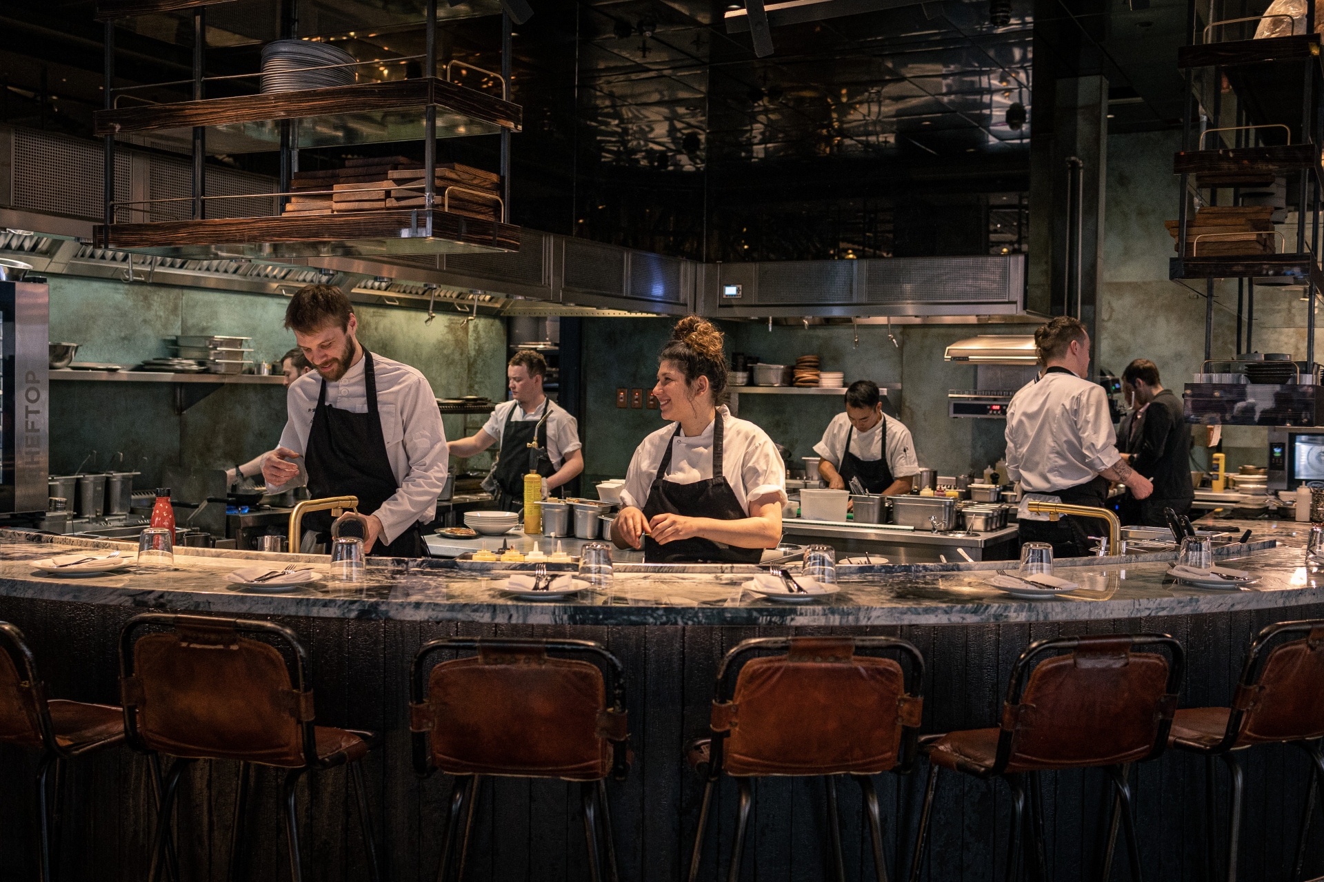 Designed by Christina Leung and Timothy Tan of Studio Gossamer, the interior has a super-stylish, moody aesthetic featuring green marble, red leather, and ethereal, amorphous Tom Dixon lighting. It adopts a waste-not-want-not approach, incorporating repurposed and reimagined materials in an engaging, theatrically designed space. A large, open kitchen features a seven-seat chef's counter that immerses you in the action, while a satellite bar positioned diagonally adds to the dynamic aesthetic. Above, a stunning seaweed installation lights up the space with filament bulbs, featuring a variety of sea plants including Irish moss, spiral wrack, bladderwrack and sea kelp. The flooring mimics terrazzo but is crafted from shells saved from a previous project by the chefs.