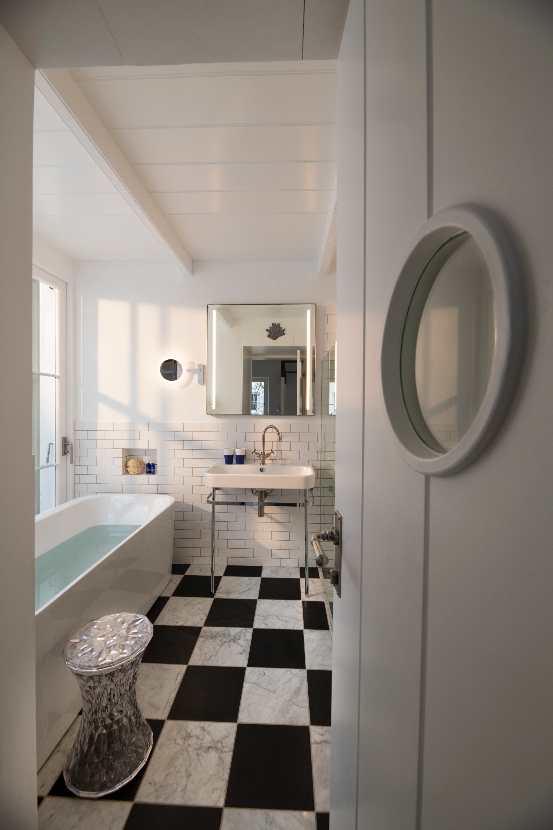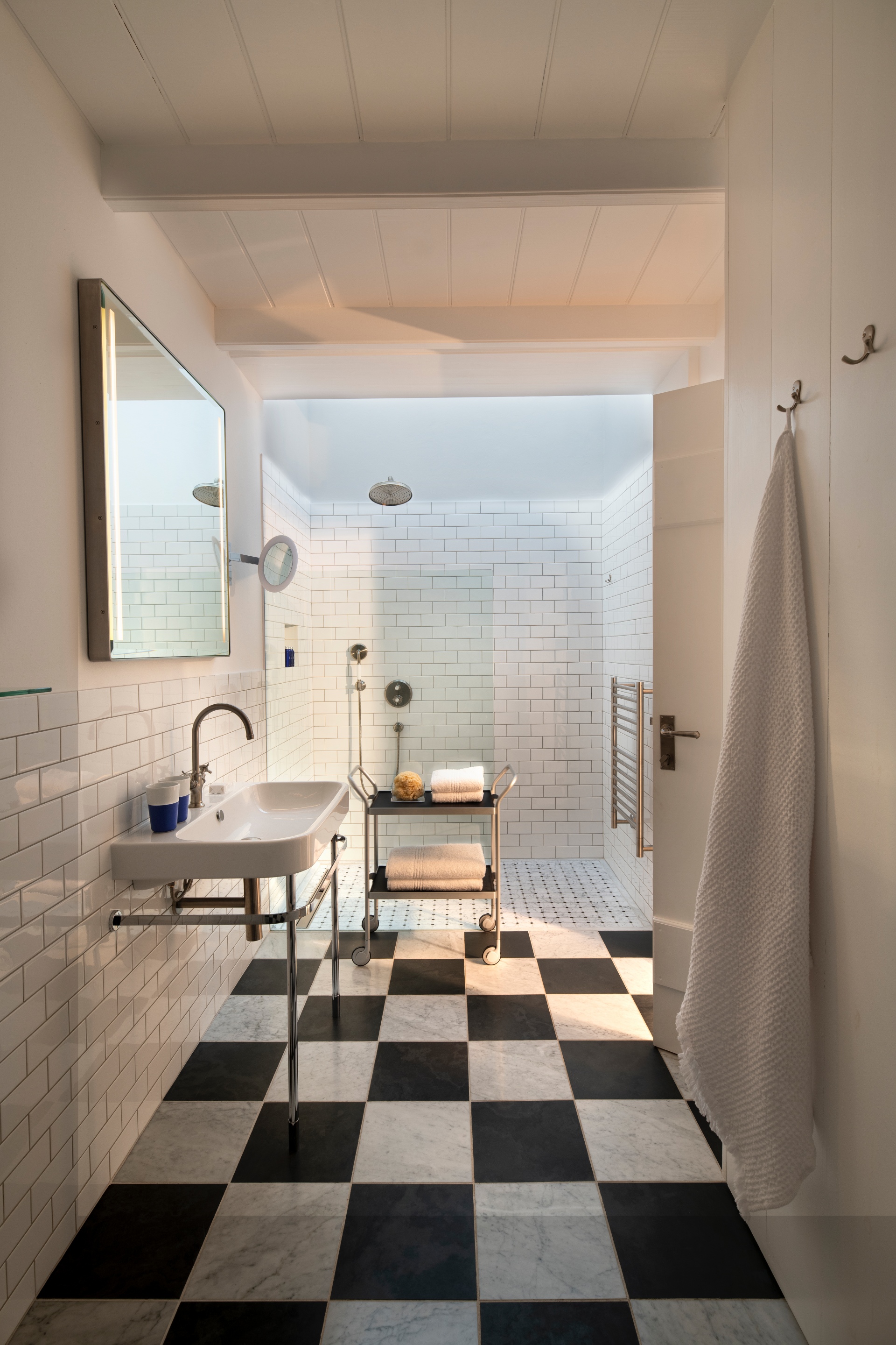 The arrival is deliberately understated. A subtle, white-on-white bas-relief of the name ‘BLOU’ - Afrikaans for blue - is the sole external cue above an open threshold. This quiet entrance is instantly countered by the warm reception from Annelle and her team, elegantly clad in the retreat’s namesake colour, leading me into the space they aptly call the 'Welcome Room'. Stepping inside, the interior reveals a modern, minimalist vision. The bright, airy atmosphere is immediate, achieved by the flood of natural light from thoughtfully placed skylights. White clapboard walls and a vaulted ceiling amplify the clean, open geometry, a perfect canvas for the geometric blue-and-white patterned Bisazza Studio tiles - specifically the Granada Bianca by Alessandro Mendini - underfoot, which introduces a rhythmic visual texture echoing the spirited freedom of seaside existence.