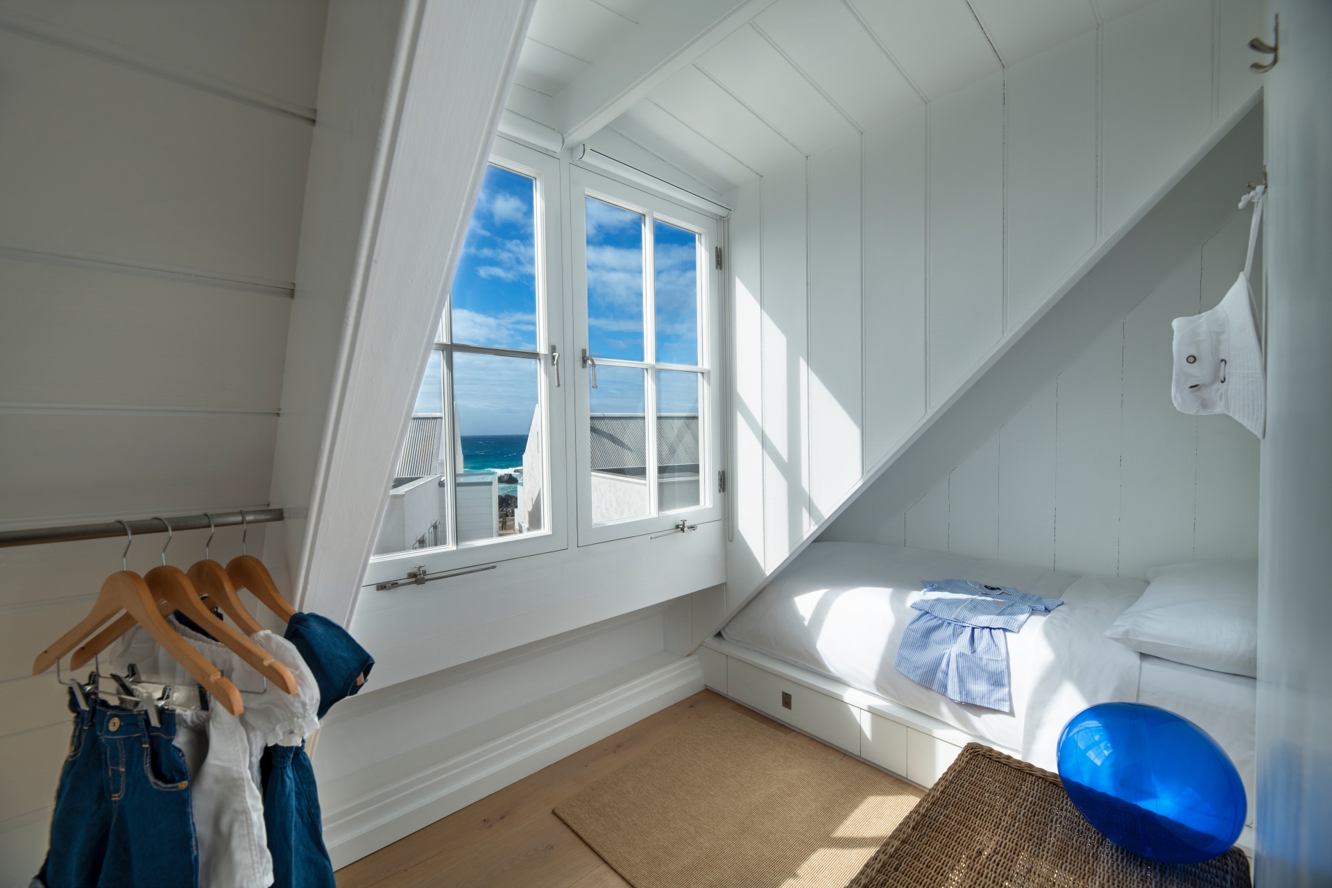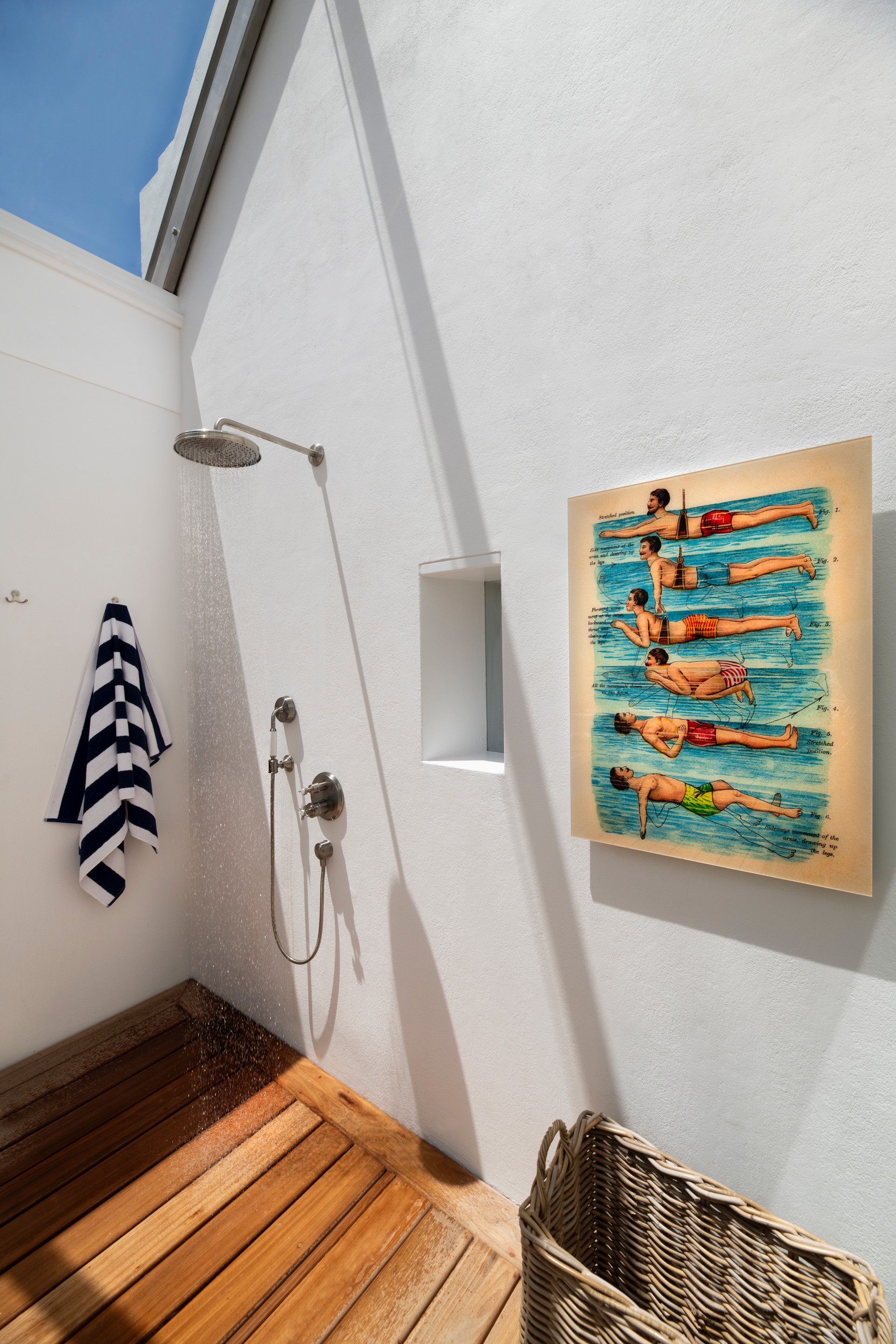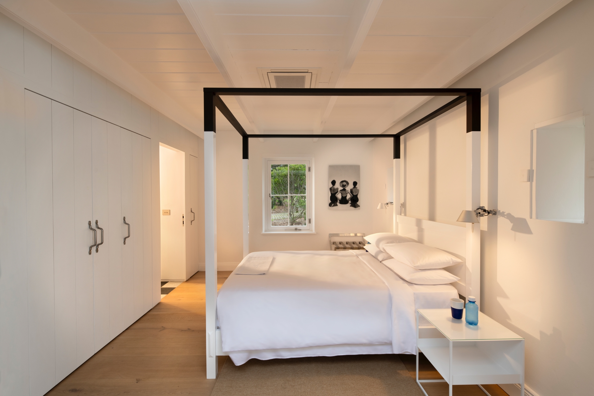 The bedrooms maintain the minimal white-on-white palette, spaces engineered for restorative sleep, all featuring the signature Babylonstoren four-poster beds. On one wall, American photographer Toni Frissell’s 1950s “Fashion Models in Swimsuits” portrays the refined backs of models, two kneeling with swim fins, one seated. This composition conjures an elegance that speaks to the glamorous, sophisticated allure of BLOU, using posture and negative space to evoke intrigue and contemporary artistic sensibility. The bathrooms reflect the quintessential Babylonstoren aesthetic: clean lines and pristine white tiling that exude functional elegance, featuring high-end, contemporary fittings that prioritize quality over ostentation. The overall vibe is one of serene tranquillity, perfectly capturing the essence of elevated coastal living.