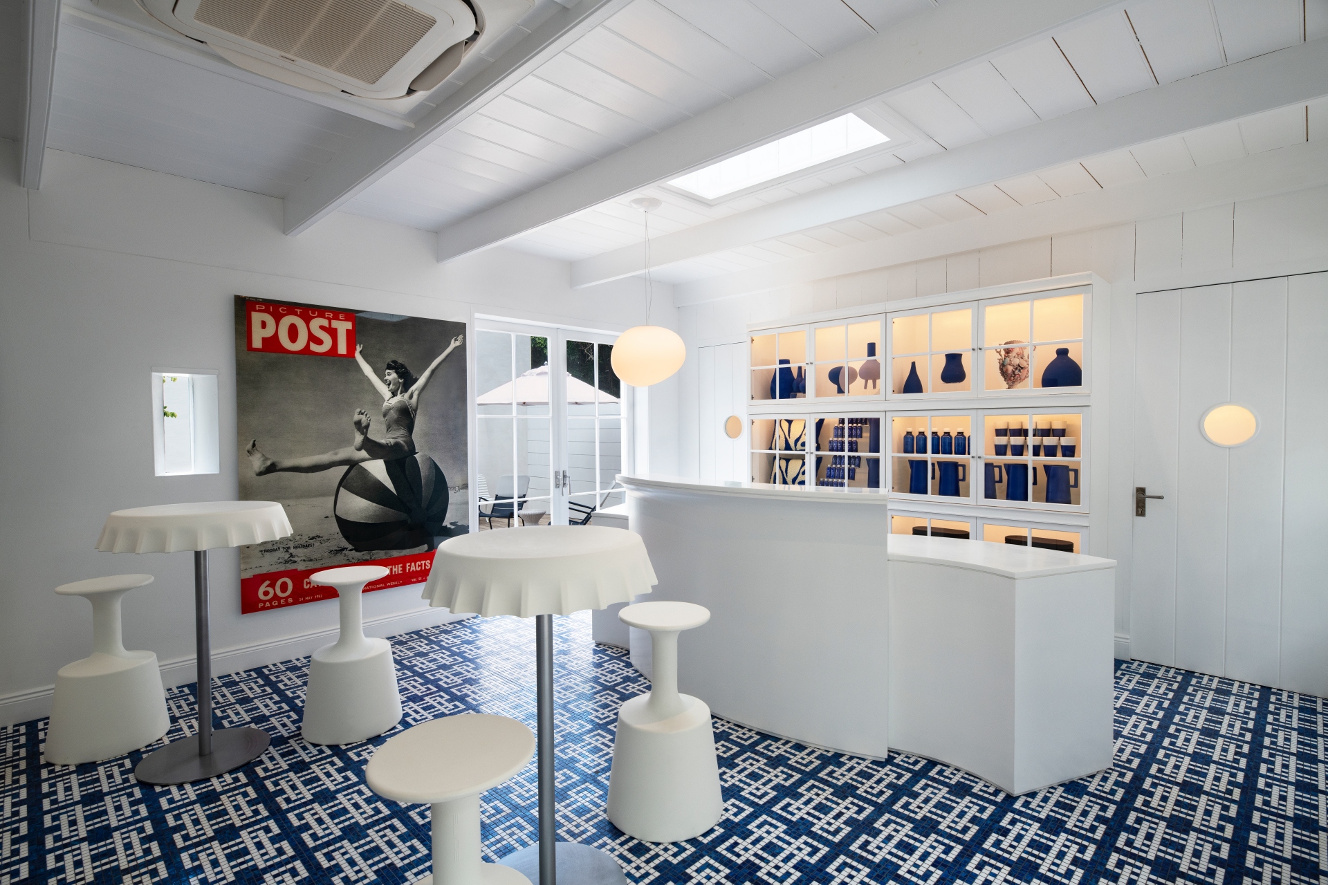 The reception desk is a sleek white counter, behind which a precisely curated display of blue-hued objects functions dually as décor and a discreet pantry and concierge service. Stylized seating and tables are placed with sculptural intention, infusing the room with a playful sophistication. A vintage "POST" poster offers a subtle, retro-infused nod to the artistic legacy that anchors this coastal retreat.