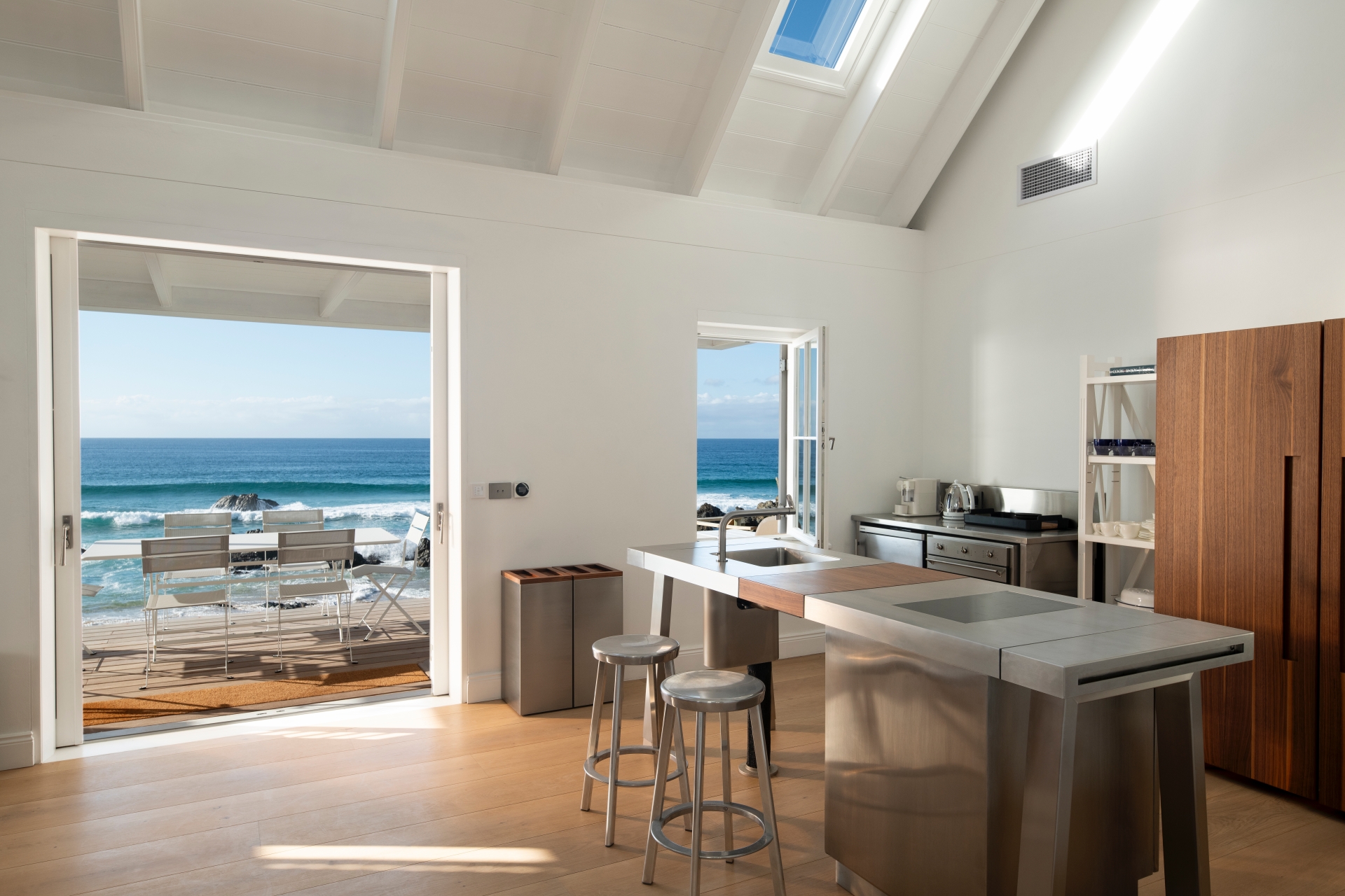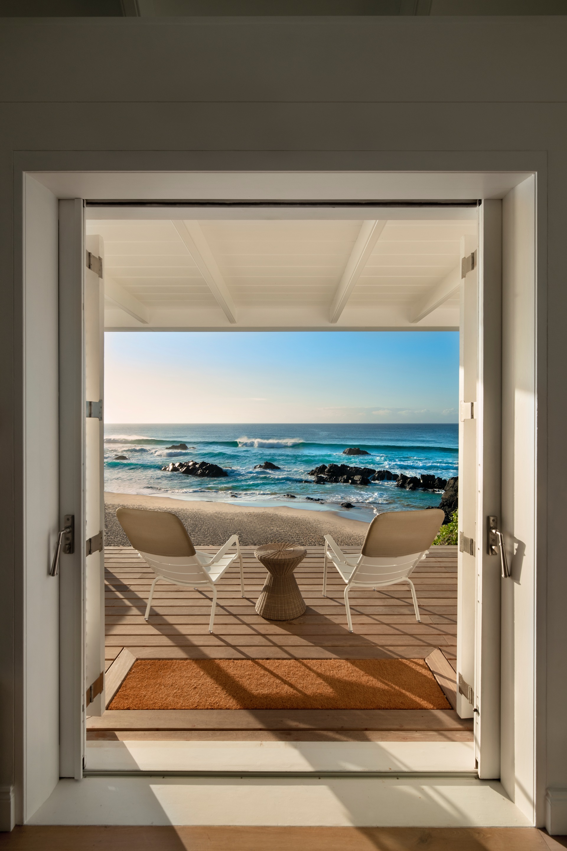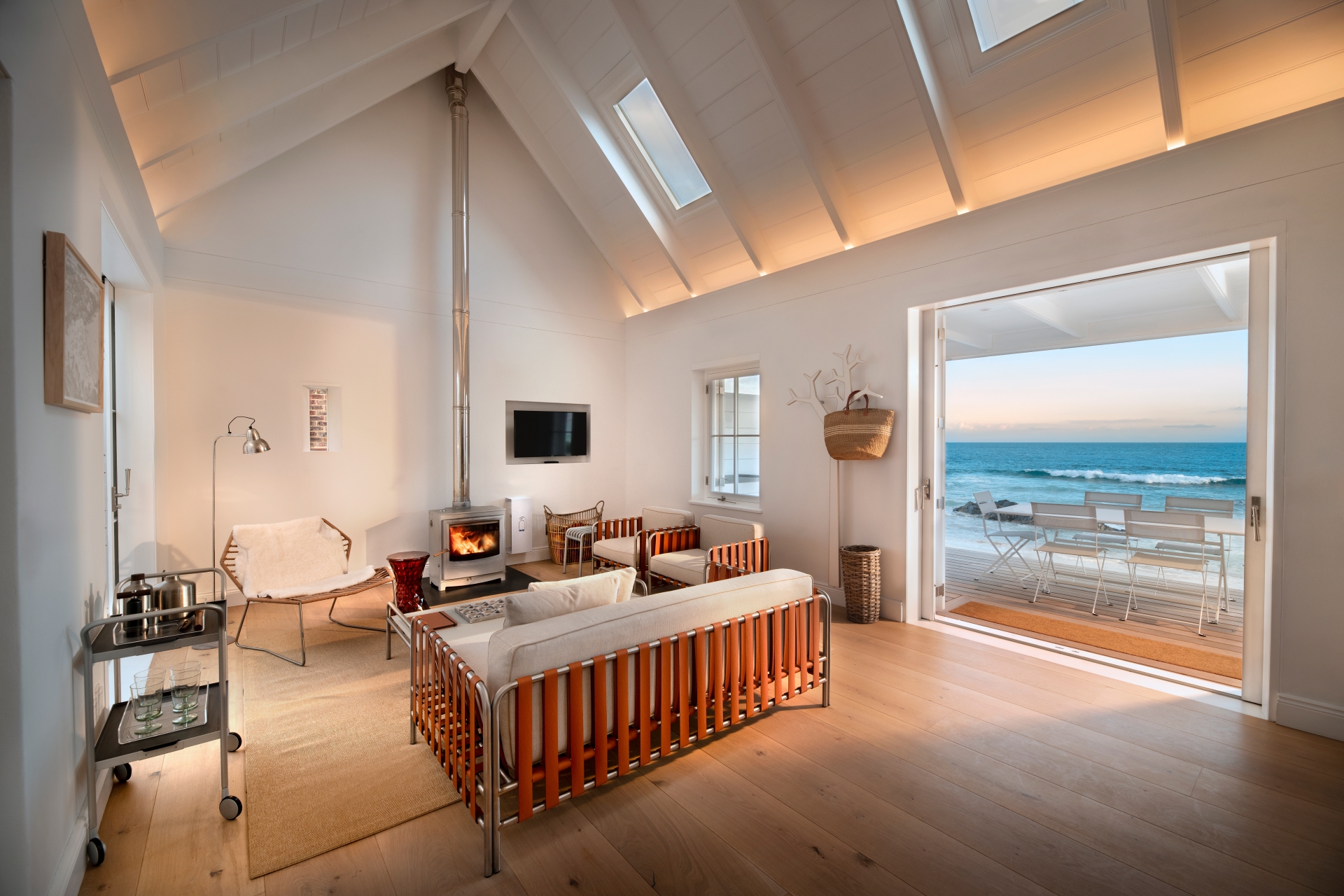 Crossing our expansive terrace through open doors, I enter a stunning modern, minimalist, Mediterranean-inspired living space. The clean lines and a neutral, resilient colour palette enhance the room’s airiness, amplified by a vaulted ceiling and skylights that draw light deep into the space. This is an environment of subtle, yet powerful, elegance. The furnishings are a curated selection of international designer classics, all chosen for their aesthetic merit and ability to withstand the harsh coastal elements. The Bulthaup kitchen anchors the left wall, above which hangs a seminal image: Robert Capa’s photograph from August 1948, capturing Pablo Picasso holding an umbrella over Françoise Gilot on the beach at Golfe-Juan, France - a decisive reinforcement of the sur la plage lifestyle. A sleek wood-burning fireplace provides a perfect architectural focus for creating warmth on cooler evenings.