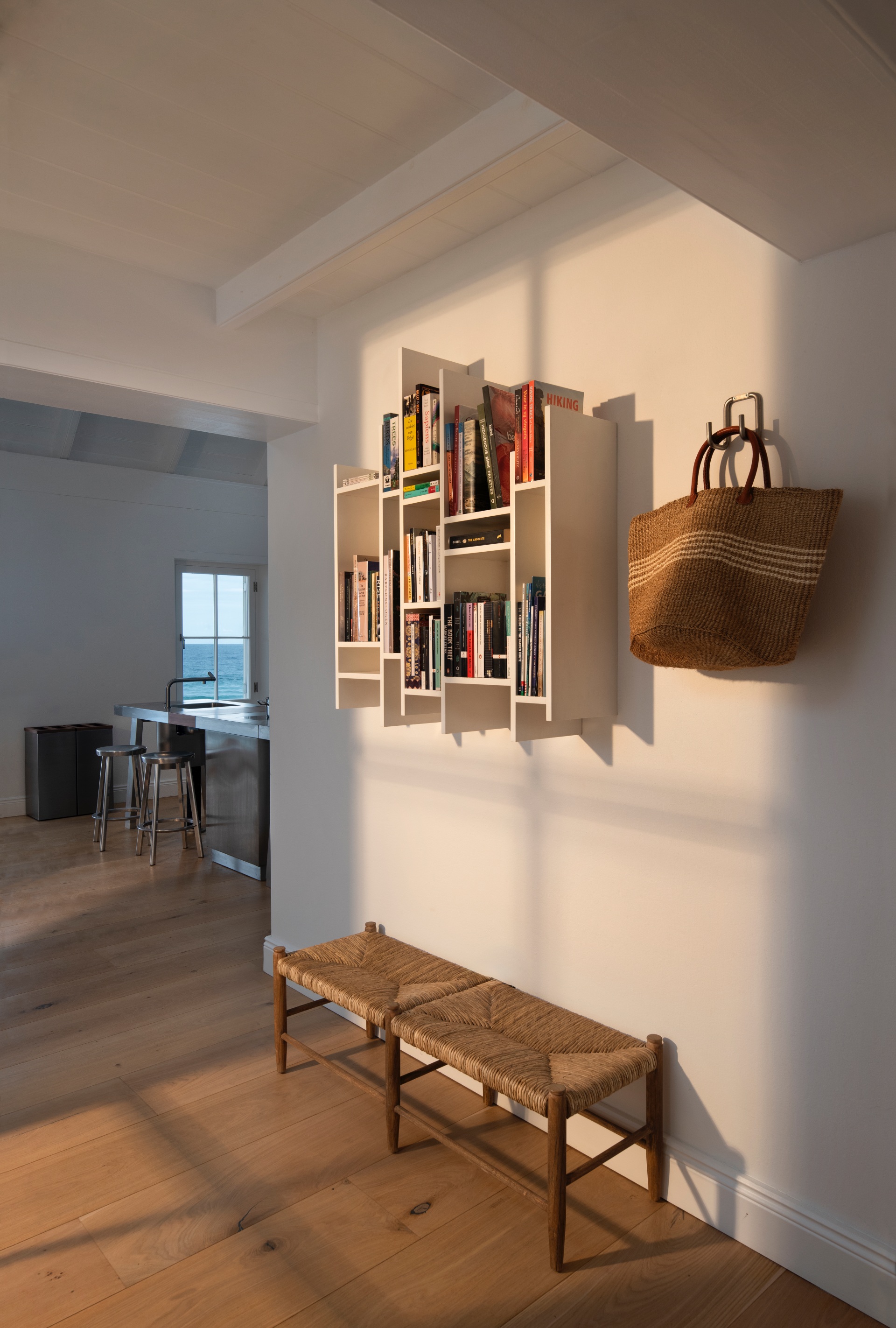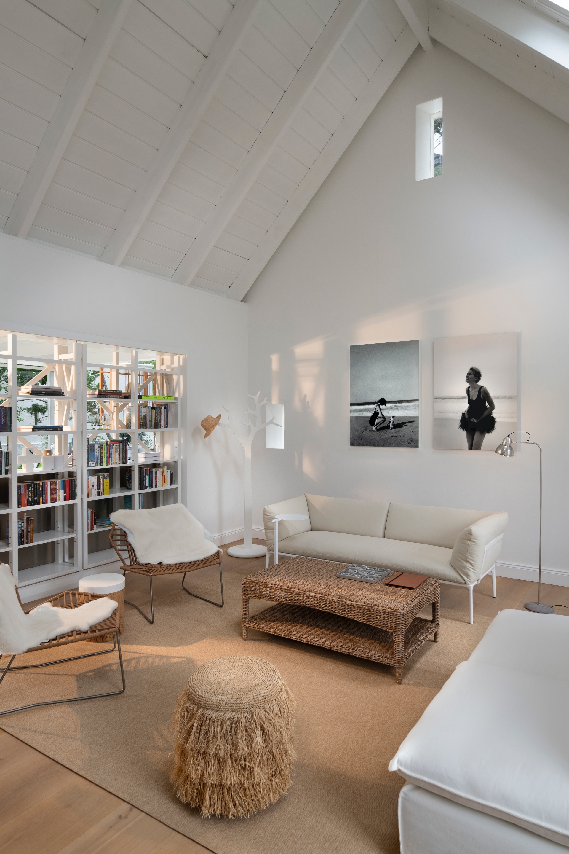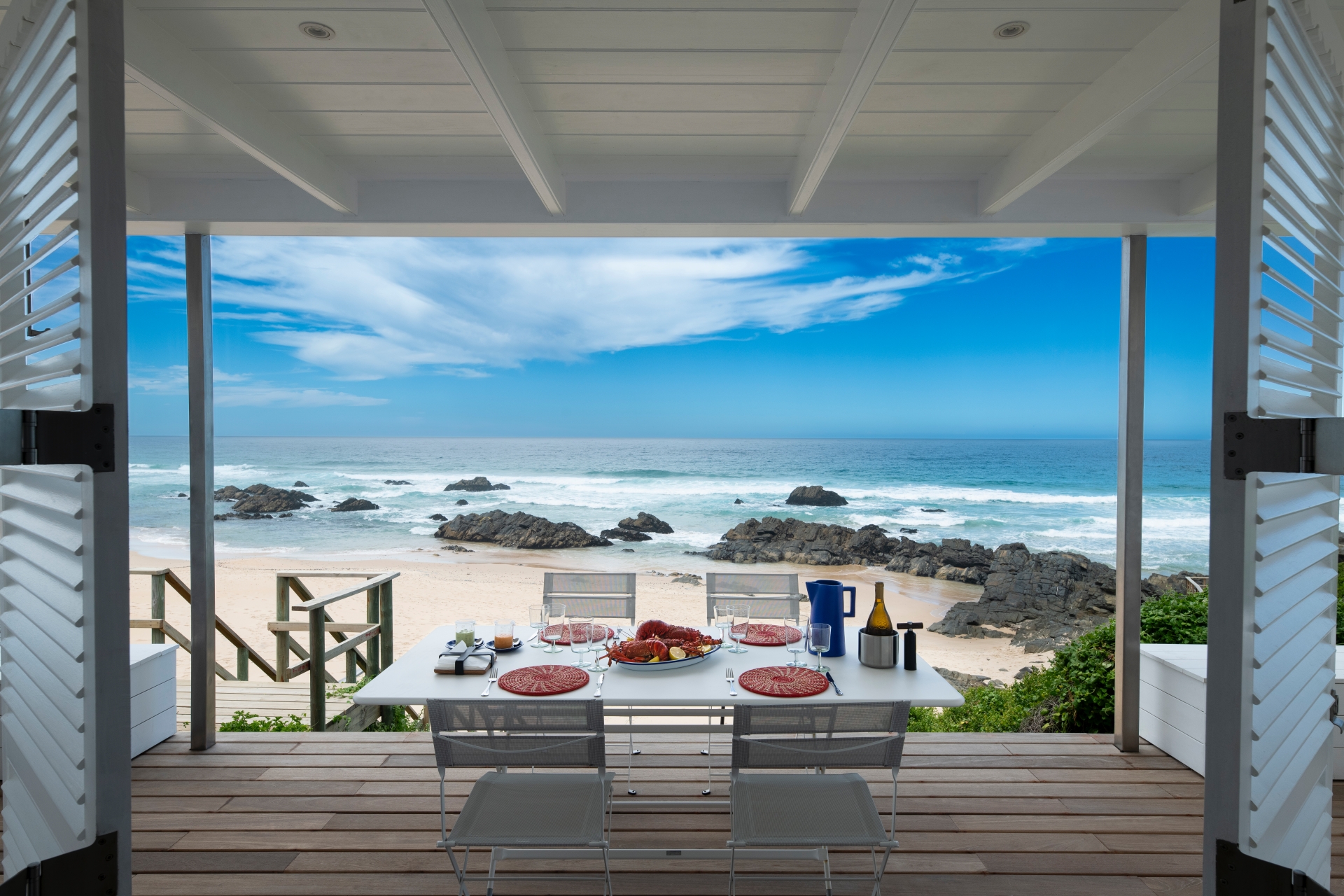 Crossing our expansive terrace through open doors, I enter a stunning modern, minimalist, Mediterranean-inspired living space. The clean lines and a neutral, resilient colour palette enhance the room’s airiness, amplified by a vaulted ceiling and skylights that draw light deep into the space. This is an environment of subtle, yet powerful, elegance. The furnishings are a curated selection of international designer classics, all chosen for their aesthetic merit and ability to withstand the harsh coastal elements. The Bulthaup kitchen anchors the left wall, above which hangs a seminal image: Robert Capa’s photograph from August 1948, capturing Pablo Picasso holding an umbrella over Françoise Gilot on the beach at Golfe-Juan, France - a decisive reinforcement of the sur la plage lifestyle. A sleek wood-burning fireplace provides a perfect architectural focus for creating warmth on cooler evenings.
