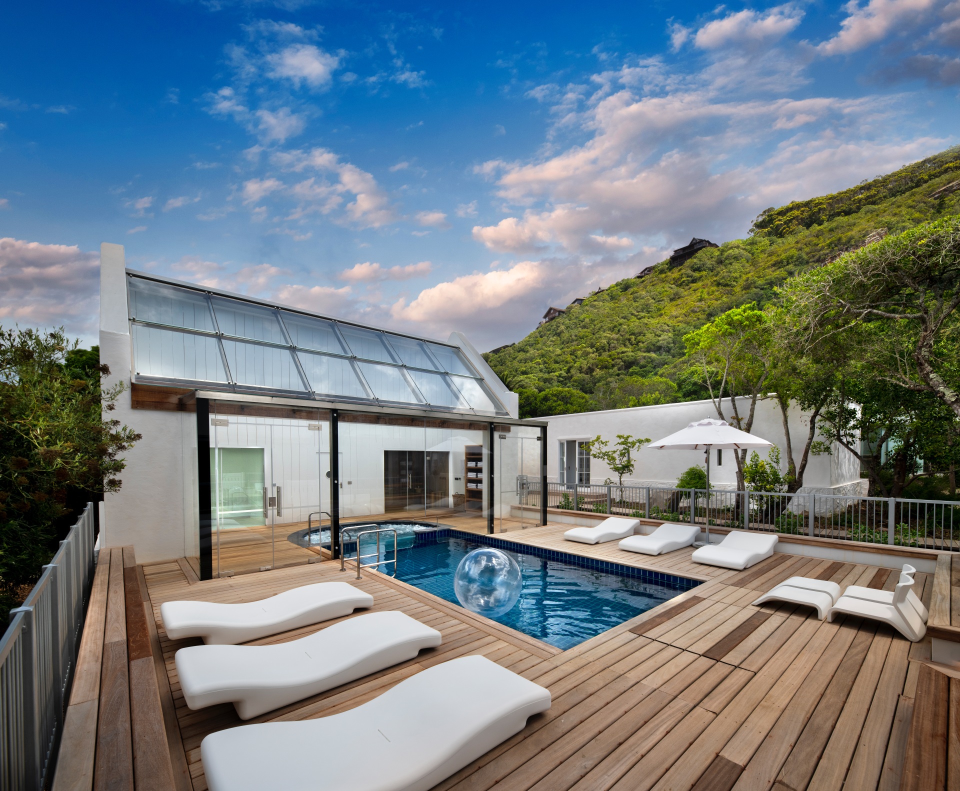 A twisting boardwalk guides us past a cluster of five whitewashed cottages, arranged around a communal courtyard featuring integrated outdoor braais and intimate garden nooks shaded by Milkwood Trees. Familiar to those who appreciate the design language of Babylonstoren, these areas showcase decadent, architectural glass-walled kitchen rooms featuring glorious Bulthaup perfection. Continuing, a gorgeously recreated mini-spa comes into view, complete with an obligatory blue pool, framed by minimalist white loungers and an eye-catching blue-and-white float from Oliver James. An adjacent glass-fronted sauna, a steam room, and a spectacular white-tiled bathroom - softened by sensuous, retro-inspired curves - evoke the charm of an opulent bathing pavilion.