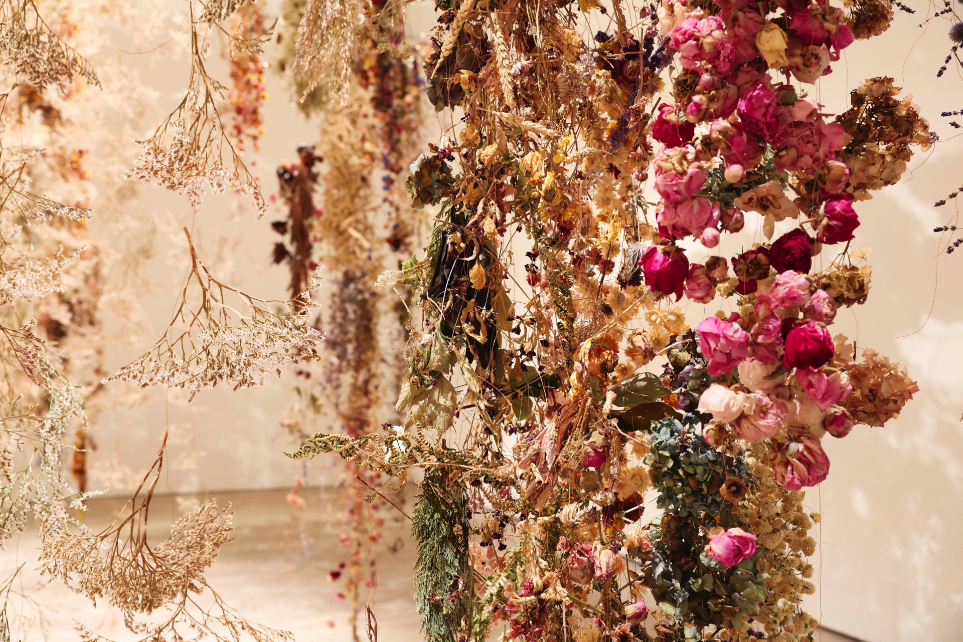 在壯觀的雙層高展廳中,Rebecca Louise Law的La Fleur Morte裝置作品以100,000朵枯花營造出沉浸式的夢幻空間,從陽台俯瞰過去更是別具風情。