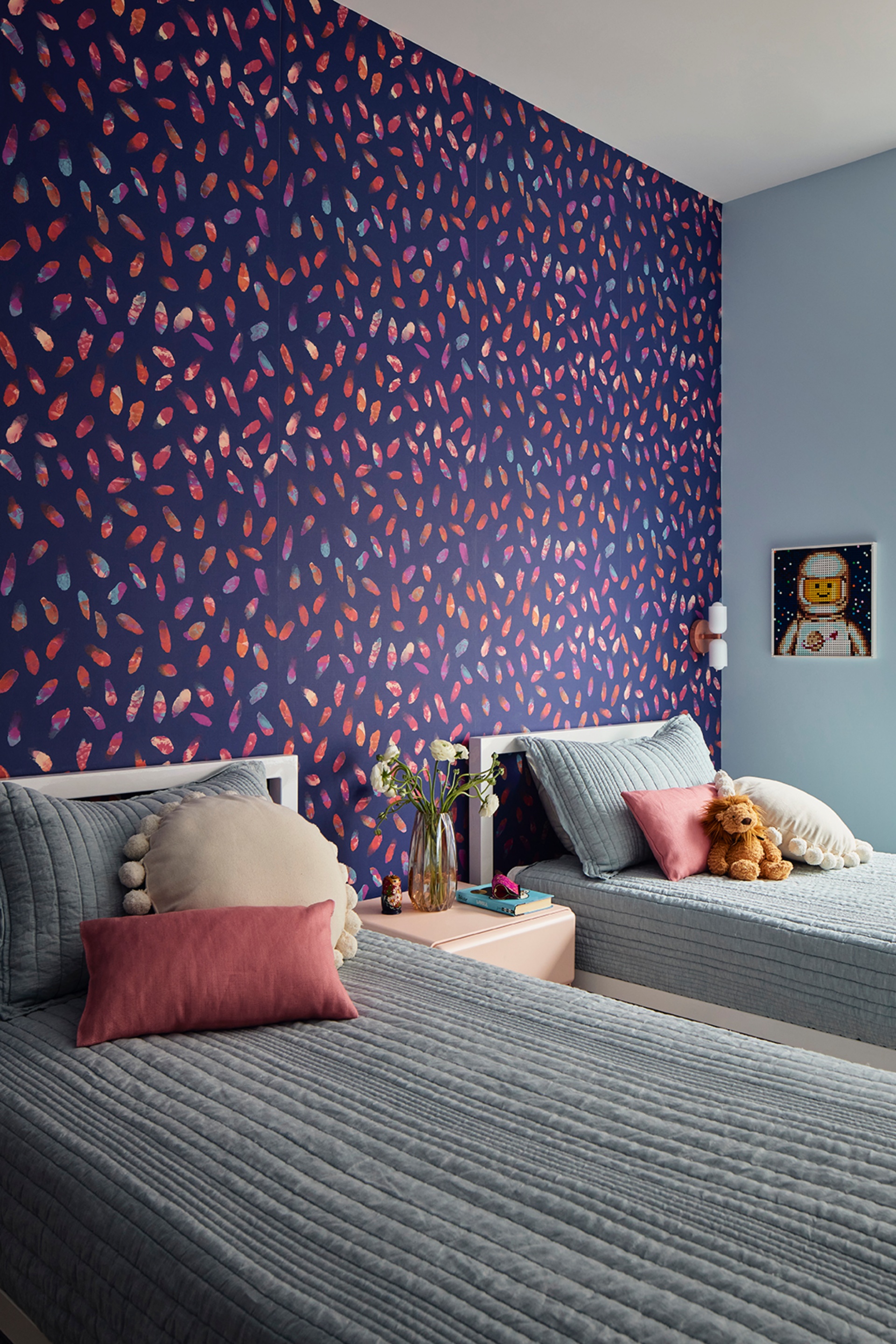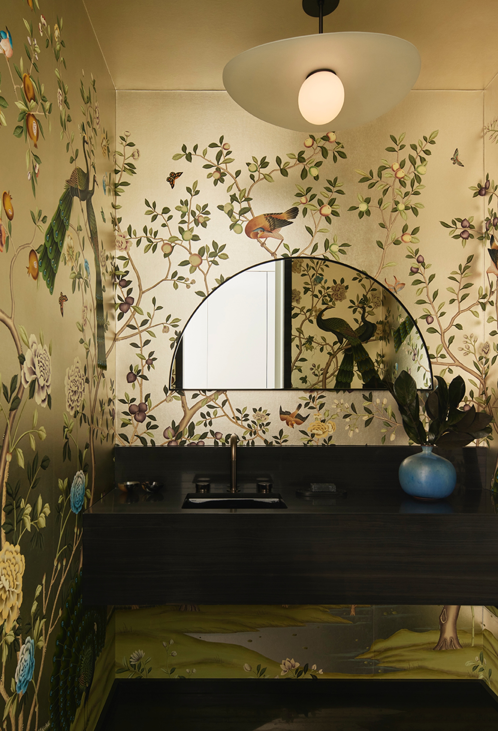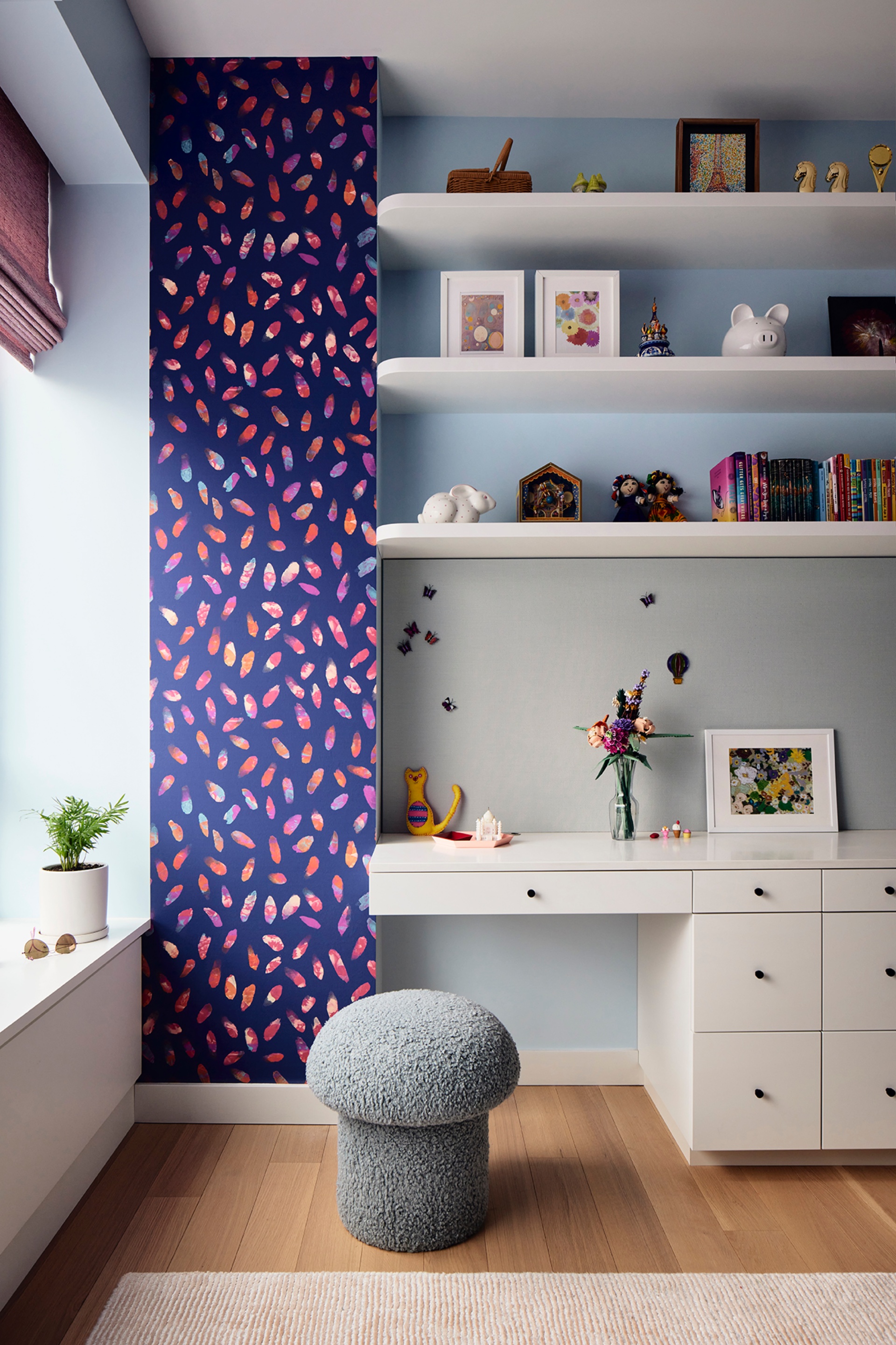 寓所的私密空間分佈在兩端,各自展現不同的氣質。孩子的天地充滿趣味與細緻,Flat Vernacular的牆紙為房間添上活潑節奏;成人的區域則以深藍與墨綠鋪陳,層次感更顯沉穩。最矚目的細節,是洗手間內的de Gournay孔雀圖案牆紙,華麗而不失雅緻,映照出屋主獨到的品味。家居每個角落也散發着量身訂製的格調,為屋主打造出真正屬於他們的生活舞台。
