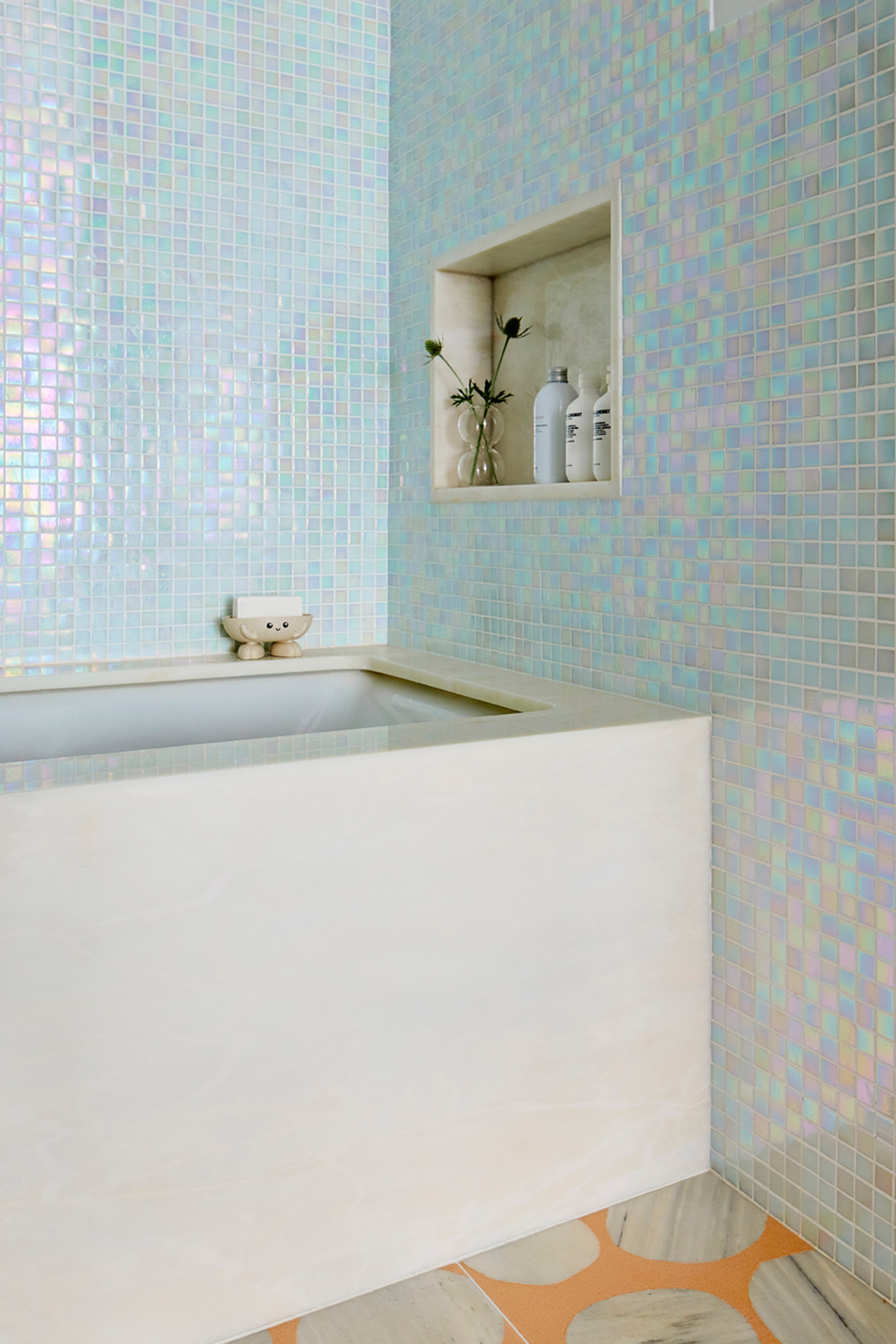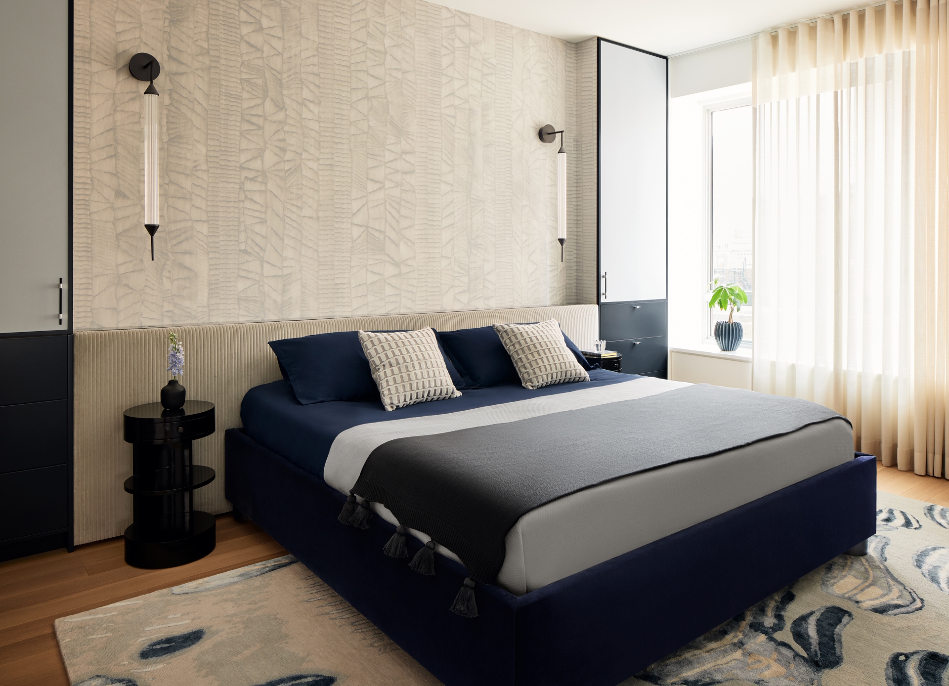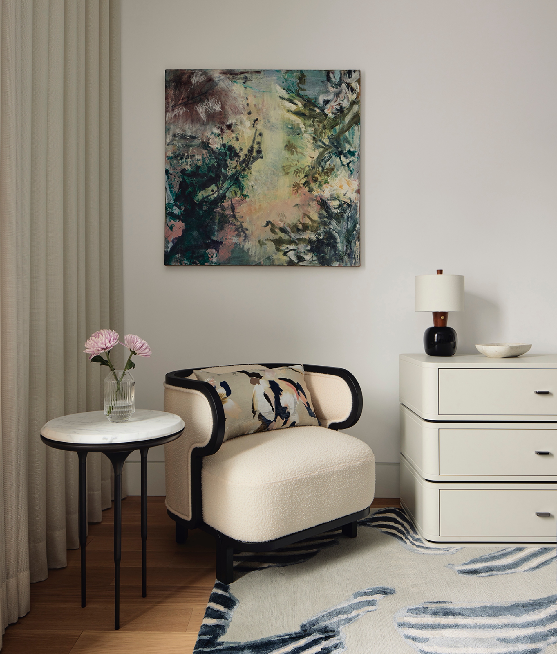 寓所的私密空間分佈在兩端,各自展現不同的氣質。孩子的天地充滿趣味與細緻,Flat Vernacular的牆紙為房間添上活潑節奏;成人的區域則以深藍與墨綠鋪陳,層次感更顯沉穩。最矚目的細節,是洗手間內的de Gournay孔雀圖案牆紙,華麗而不失雅緻,映照出屋主獨到的品味。家居每個角落也散發着量身訂製的格調,為屋主打造出真正屬於他們的生活舞台。