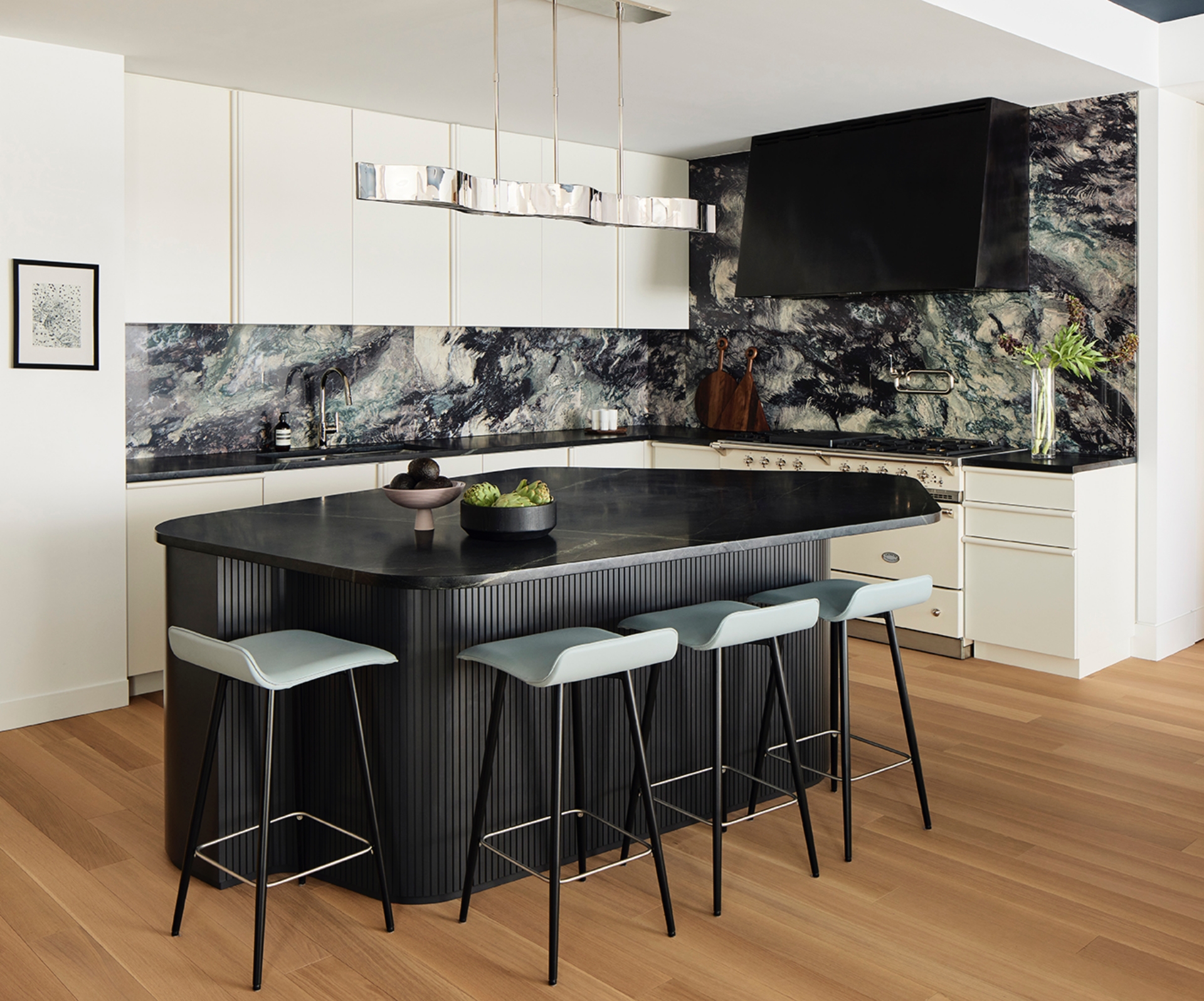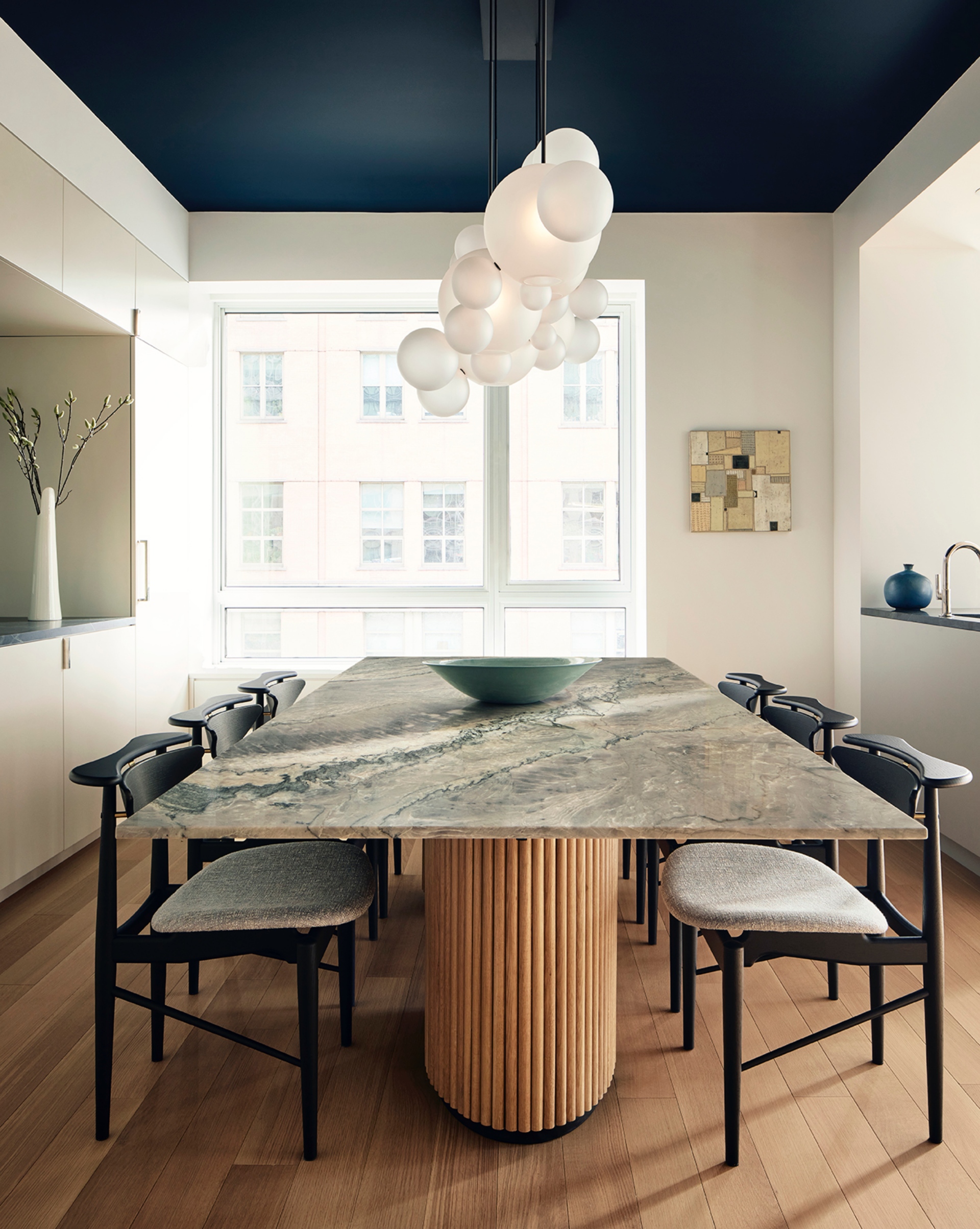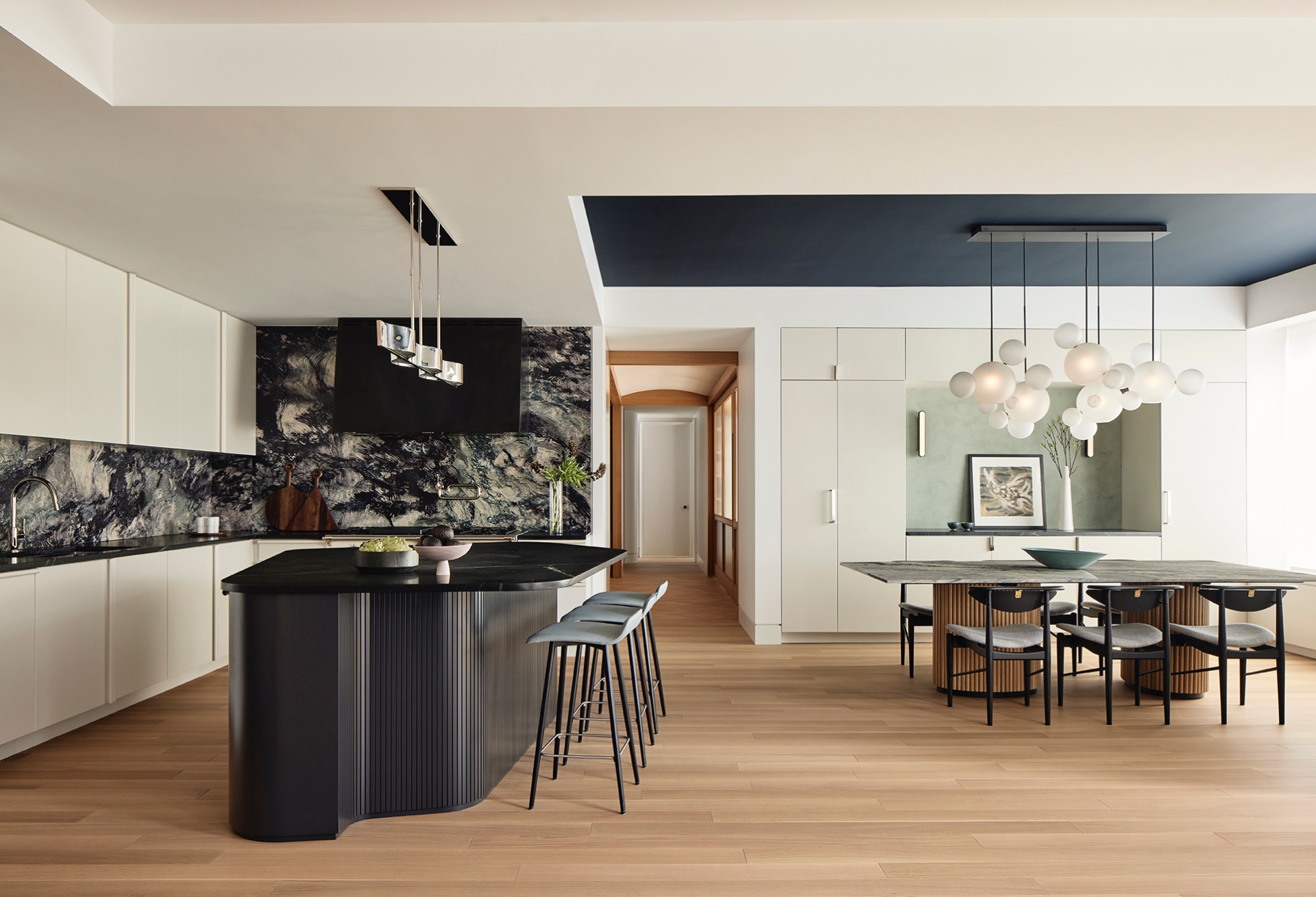 公共空間是一場材質與色彩的交響。廚房以ABC Stone的 Phoenix深藍色大理石背牆為亮點,中央黑色皂石中島以不對稱五邊形呈現,既是雕塑,也是餐桌。餐區的定製桌由Bas Stone的Platinum Crystal石英岩打造,上方懸掛Giopato & Coombes的Bolle燈飾,宛如漂浮的雲朵。這種雕塑語言延伸至餐桌與中島的Tambour紋理,再進入客廳的白橡木格柵,形成統一的設計節奏。