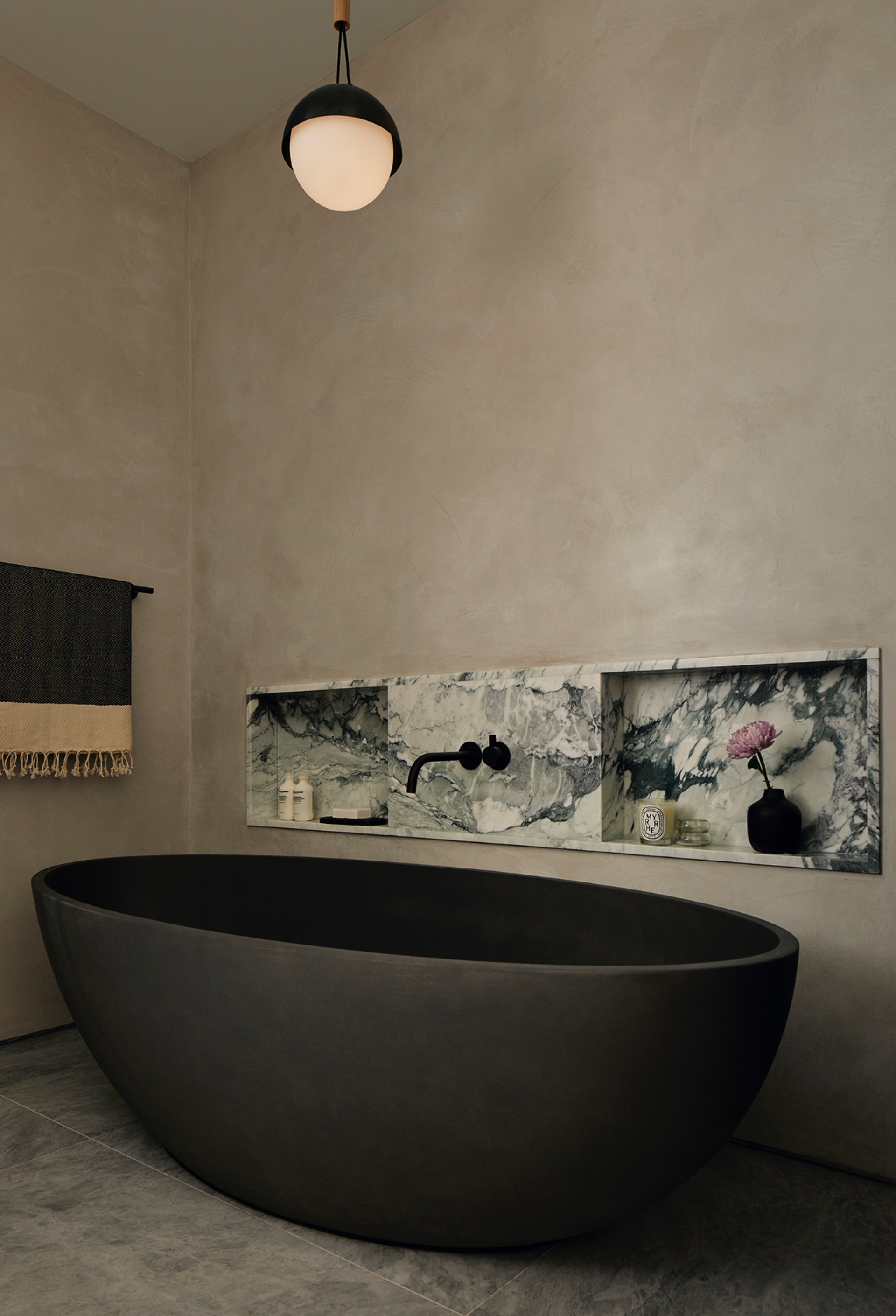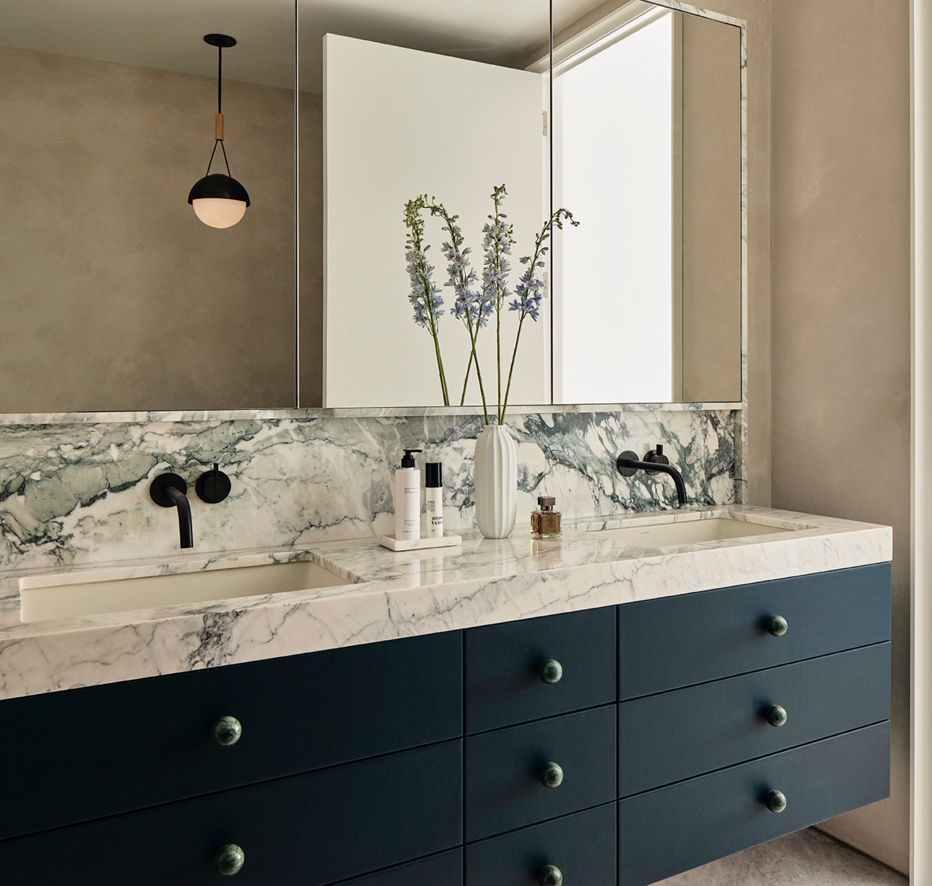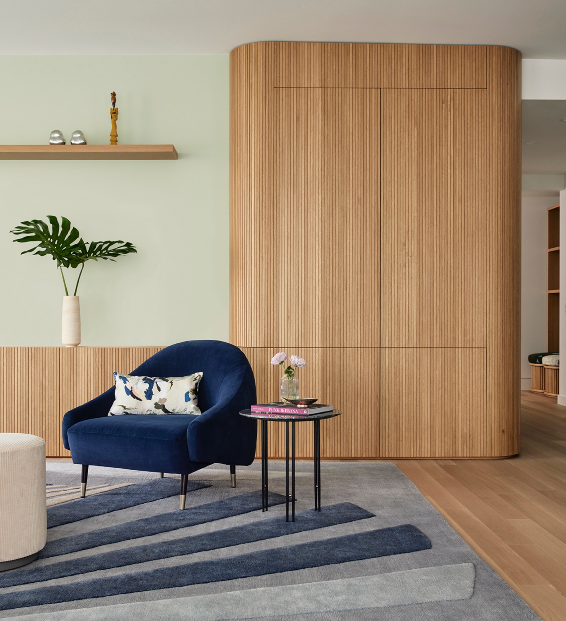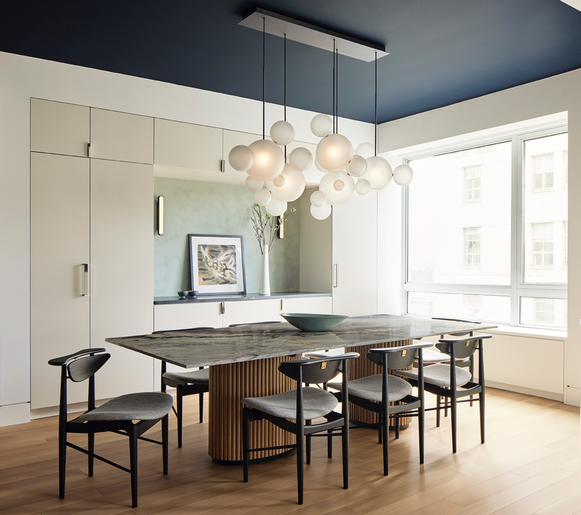 公共空間是一場材質與色彩的交響。廚房以ABC Stone的 Phoenix深藍色大理石背牆為亮點,中央黑色皂石中島以不對稱五邊形呈現,既是雕塑,也是餐桌。餐區的定製桌由Bas Stone的Platinum Crystal石英岩打造,上方懸掛Giopato & Coombes的Bolle燈飾,宛如漂浮的雲朵。這種雕塑語言延伸至餐桌與中島的Tambour紋理,再進入客廳的白橡木格柵,形成統一的設計節奏。