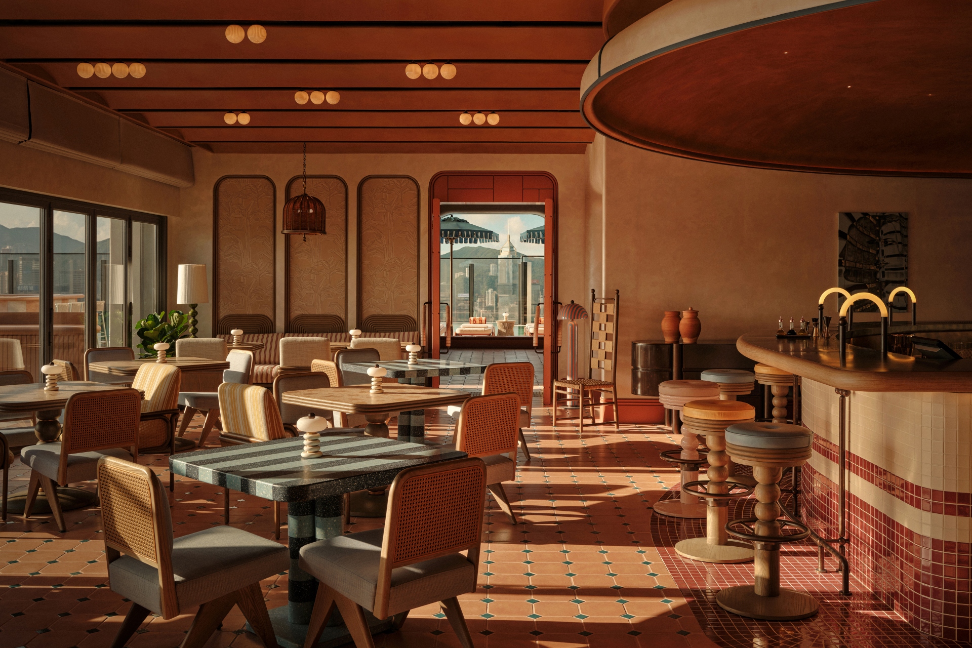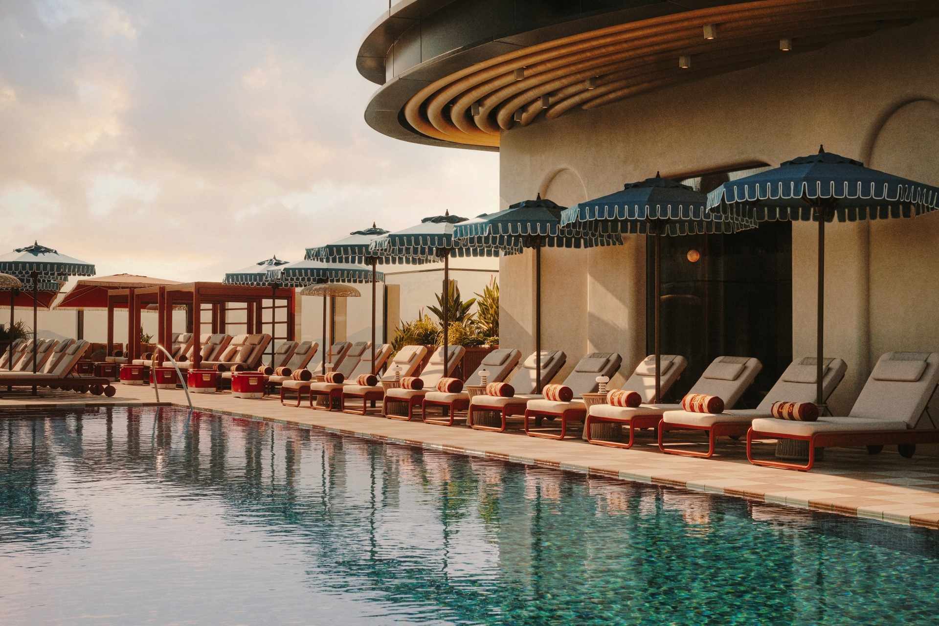 50樓的The Swim Club是另一個轉折點。空間由內斂轉向開闊,那種電影感的鋪排至此化作最直接的視覺衝擊。這裡將「海員之家」的航海基因演繹得更有趣味。作為一個結合酒吧、俱樂部與泳池的流動空間,這裡日間節奏悠閒,入夜後則換上緊湊的都會氛圍,與下方的城巿光影交織輝映。