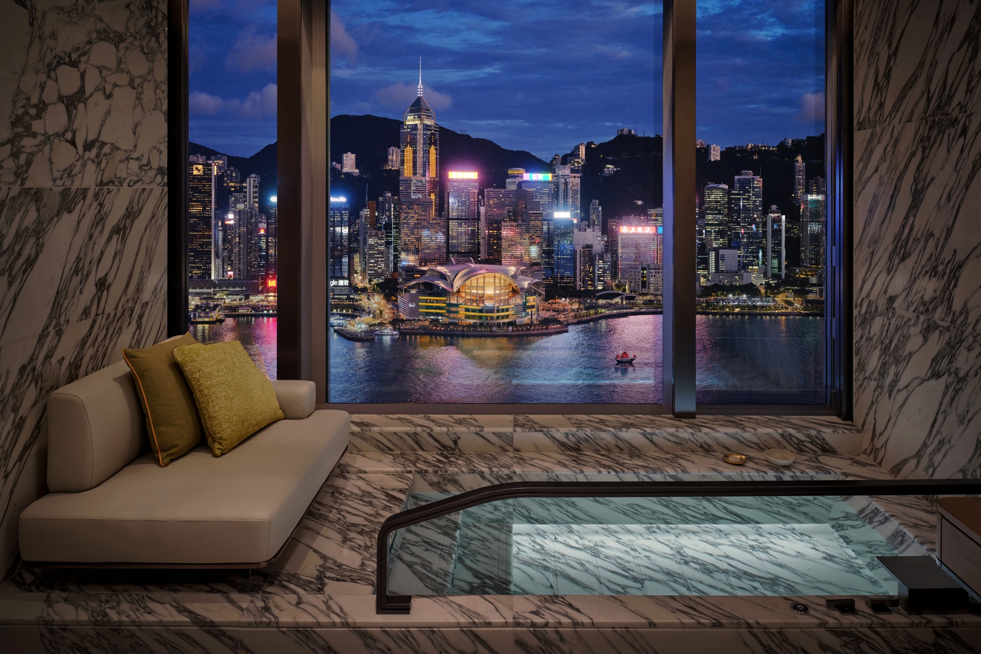 步入客房層,設計變得更矚目鮮明。HBA特意模糊了睡房與浴室的界線,Lui指出,這並非將空間區分,而是視之為「空間的延伸」。最吸睛之處莫過於置於窗旁的獨立浴缸,將毫無遮擋的維港美景框成一幅畫。Lui亦證實了這份初心:「我們的願景始終如一:消解那道屏障,讓客人在泡澡時能直視前方壯闊的海港。」由於每間客房皆坐擁維港景致,這份景觀是「恆常而非隨機」的,讓最私密的感官儀式,與這座城市最著名的公共地標並存。