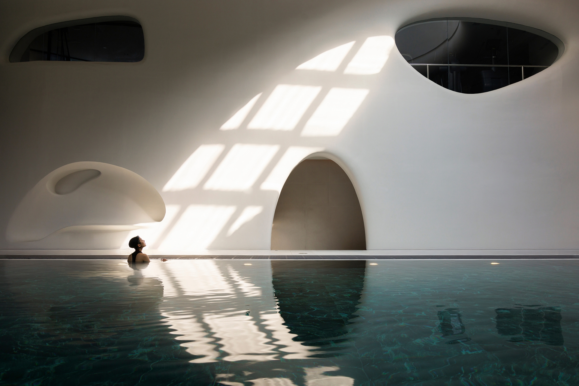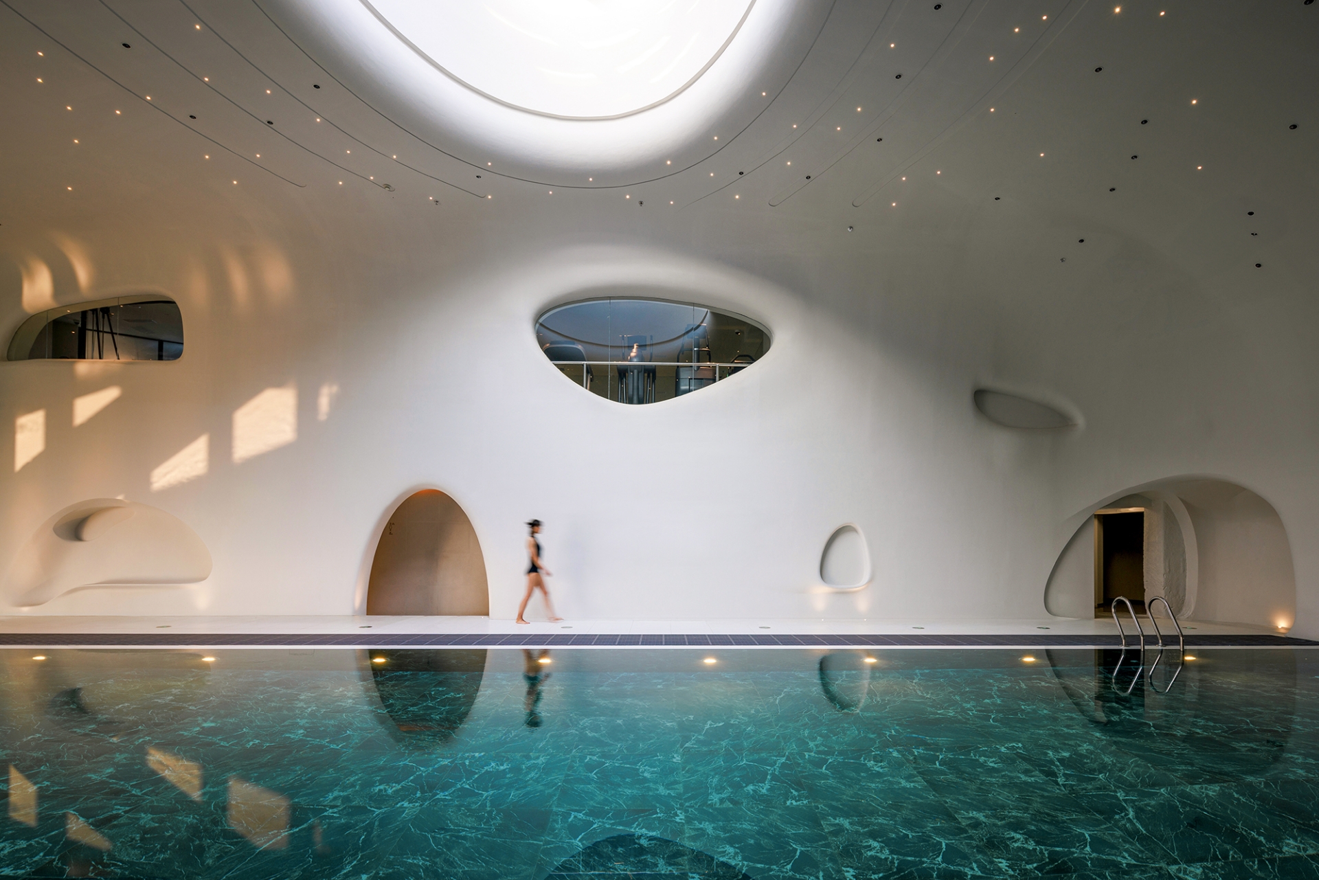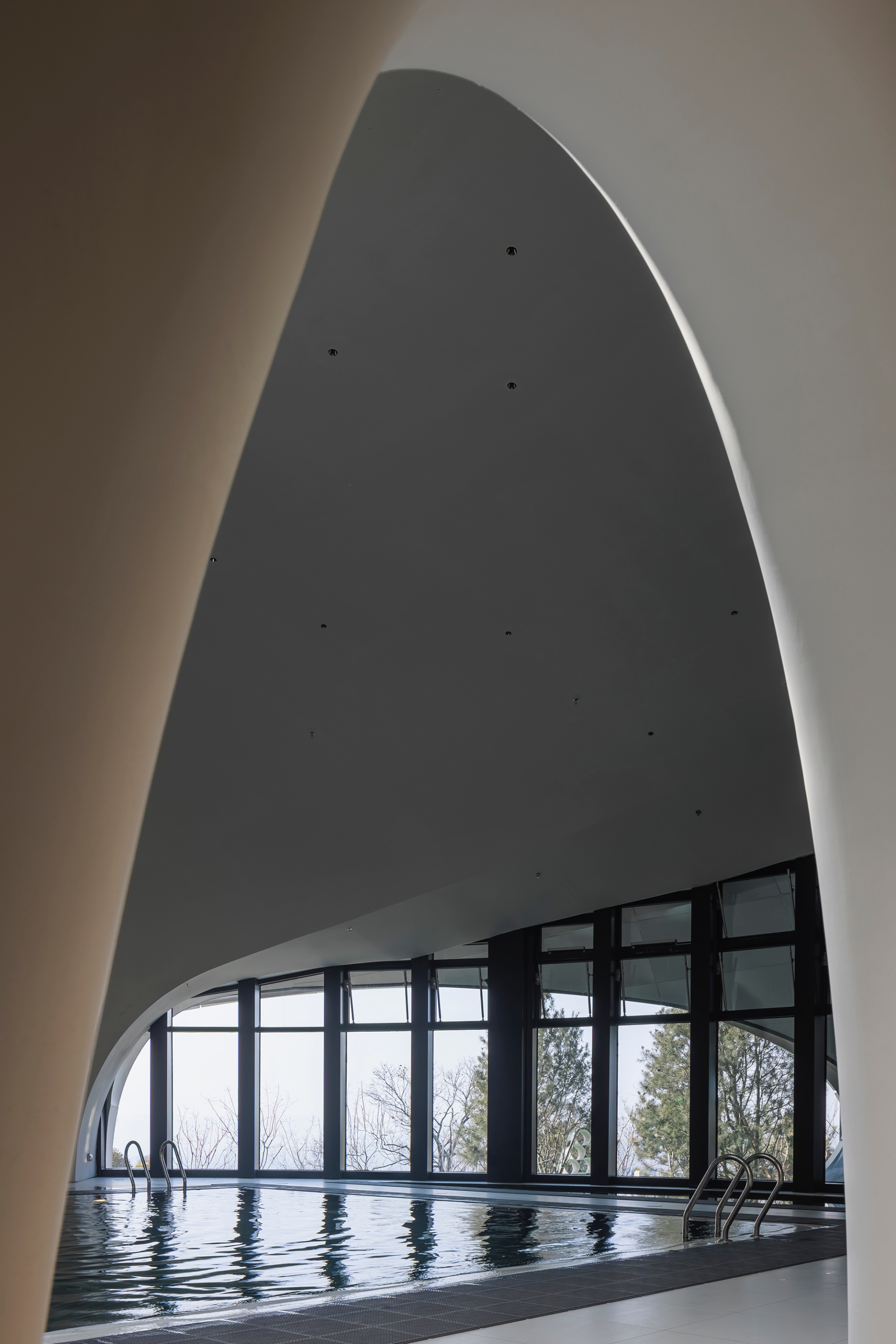 To enhance the visitor's journey to the summit, a spiraling ramp, drawing analogy from the Nazca Lines, penetrates and emerges from the rock, evoking a gentle sense of ascent. As one ascends, the breathtaking panorama of Zunhua and the Great Wall unfolds, a quiet spectacle of nature's grandeur. In winter, when snow blankets the mountaintop, only the steaming pools and the faint curves of the ramp are visible, transforming the center into a stone born of the mountain itself. Light is Liberation: Illuminating the Cavern Stone and cave, while offering shelter, can also be enclosed. Therefore, light became a crucial element in The Rock's design. Sunlight streams through the 26-square-meter skylight and the expansive northern curtain wall, illuminating the cavernous interior. The unified soft grey-white finish of the ceiling and walls, blended through curved transitions, creates an abstracted cave-like ambiance. Reflected water light dances across the surfaces, giving even solid elements a fluid, rippling quality that mirrors one's emotions.