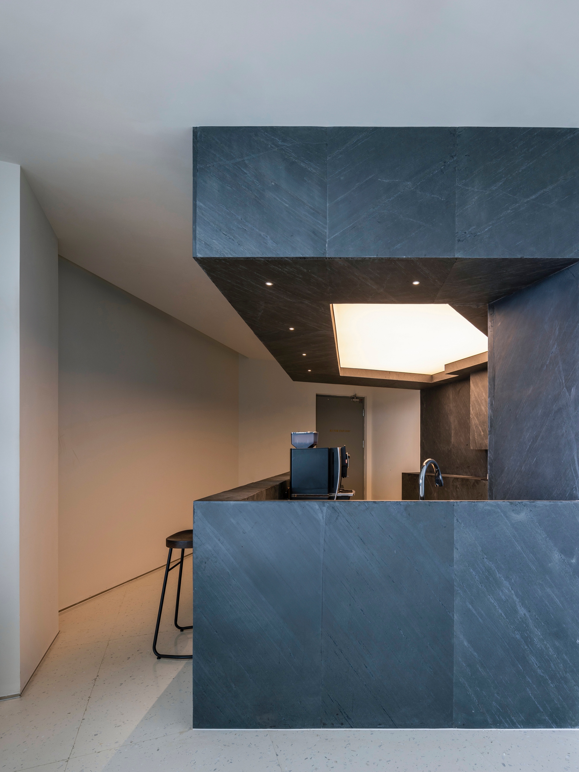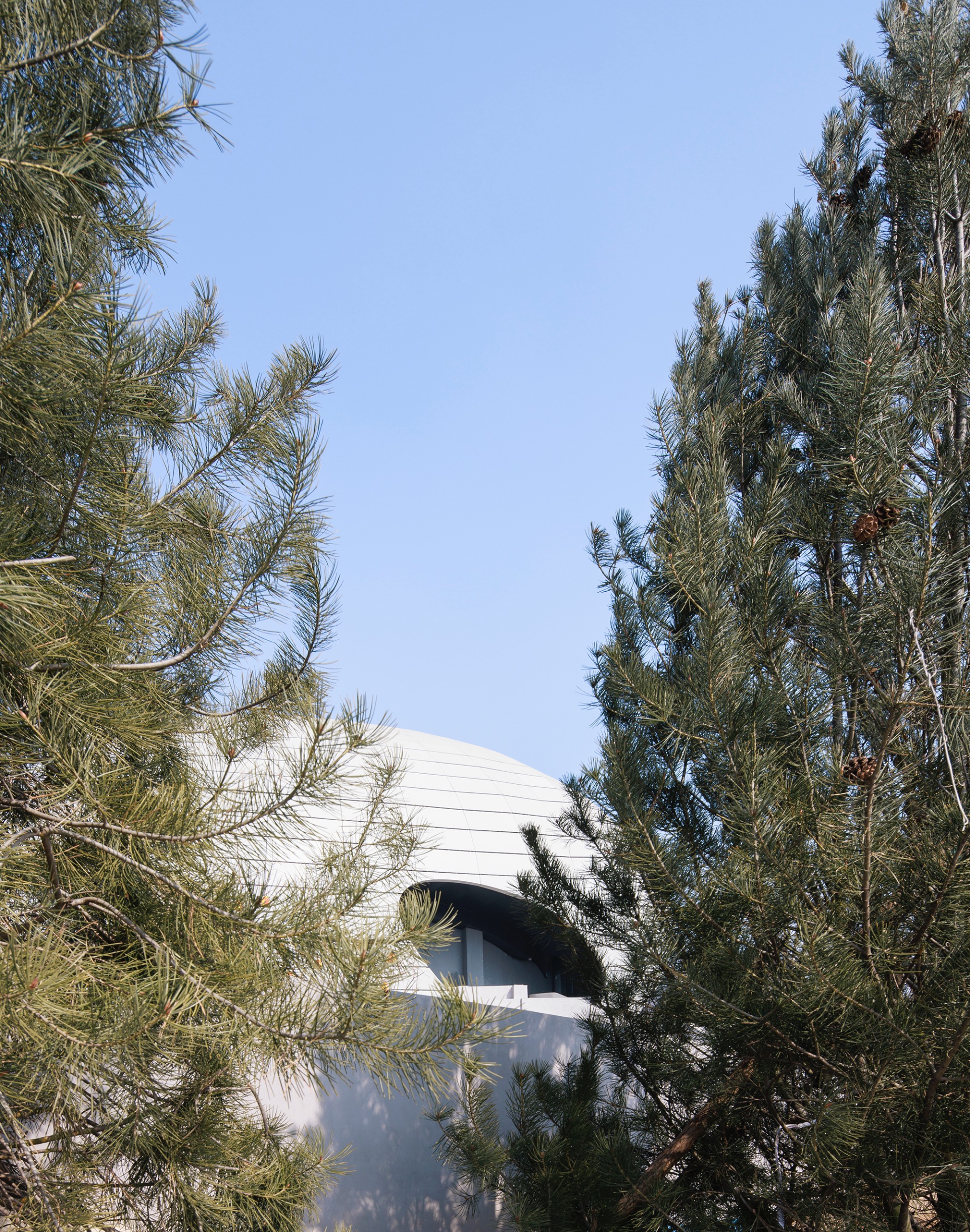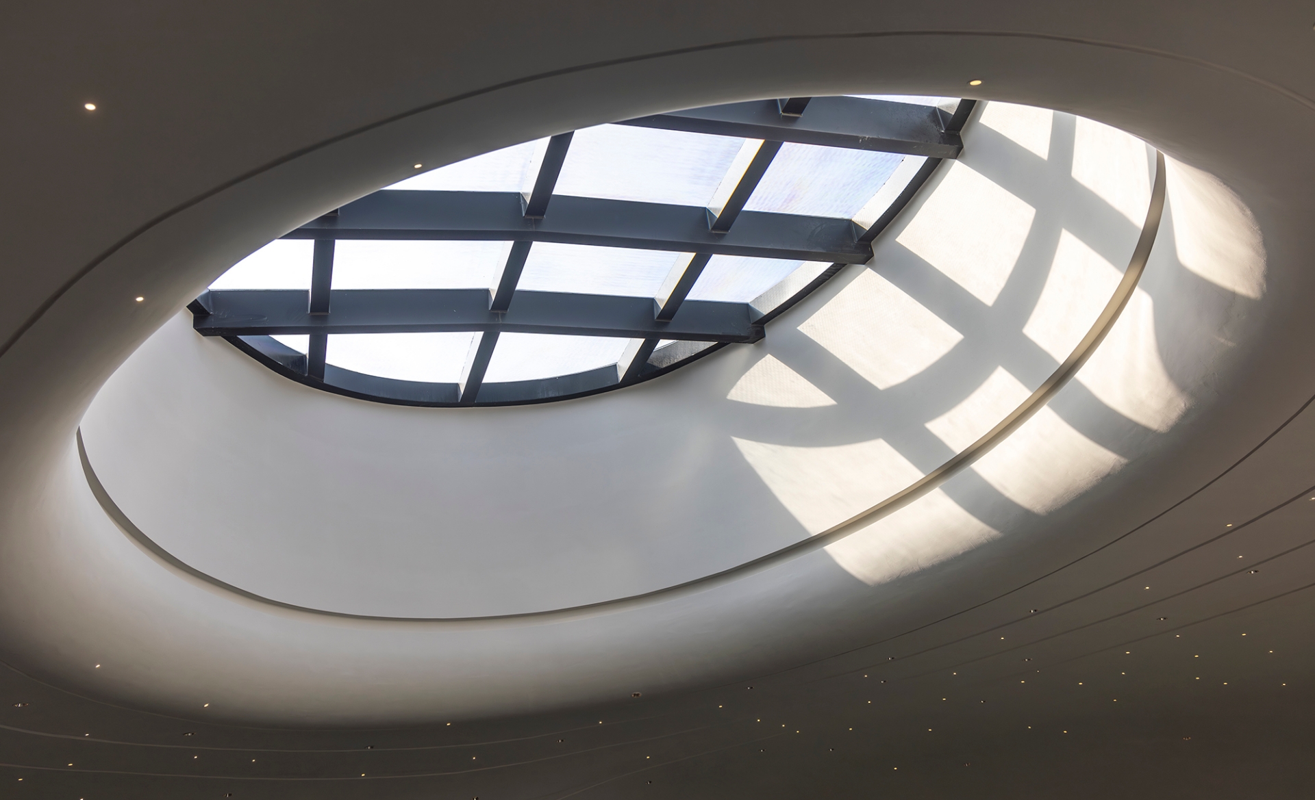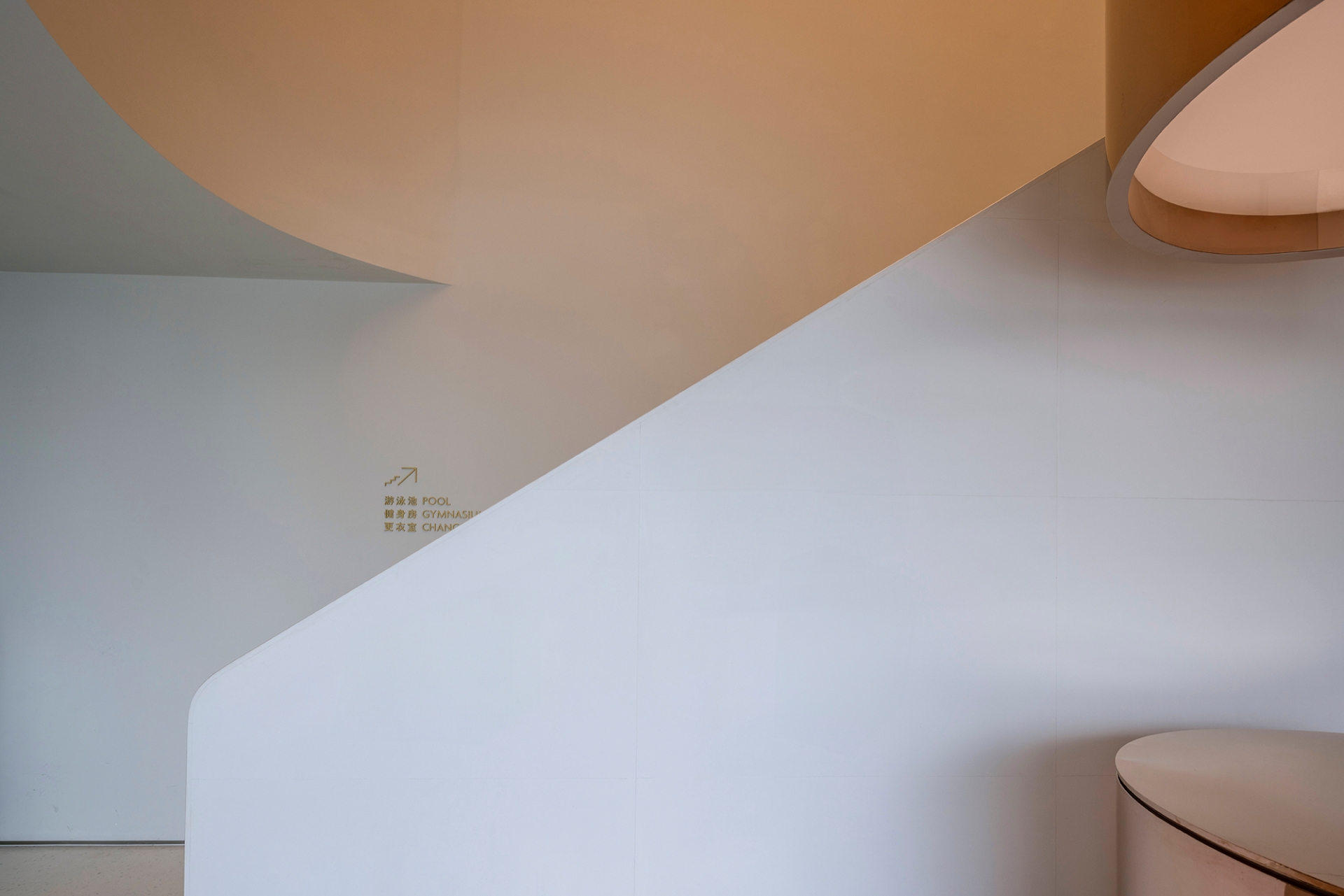 To enhance the visitor's journey to the summit, a spiraling ramp, drawing analogy from the Nazca Lines, penetrates and emerges from the rock, evoking a gentle sense of ascent. As one ascends, the breathtaking panorama of Zunhua and the Great Wall unfolds, a quiet spectacle of nature's grandeur. In winter, when snow blankets the mountaintop, only the steaming pools and the faint curves of the ramp are visible, transforming the center into a stone born of the mountain itself. Light is Liberation: Illuminating the Cavern Stone and cave, while offering shelter, can also be enclosed. Therefore, light became a crucial element in The Rock's design. Sunlight streams through the 26-square-meter skylight and the expansive northern curtain wall, illuminating the cavernous interior. The unified soft grey-white finish of the ceiling and walls, blended through curved transitions, creates an abstracted cave-like ambiance. Reflected water light dances across the surfaces, giving even solid elements a fluid, rippling quality that mirrors one's emotions.