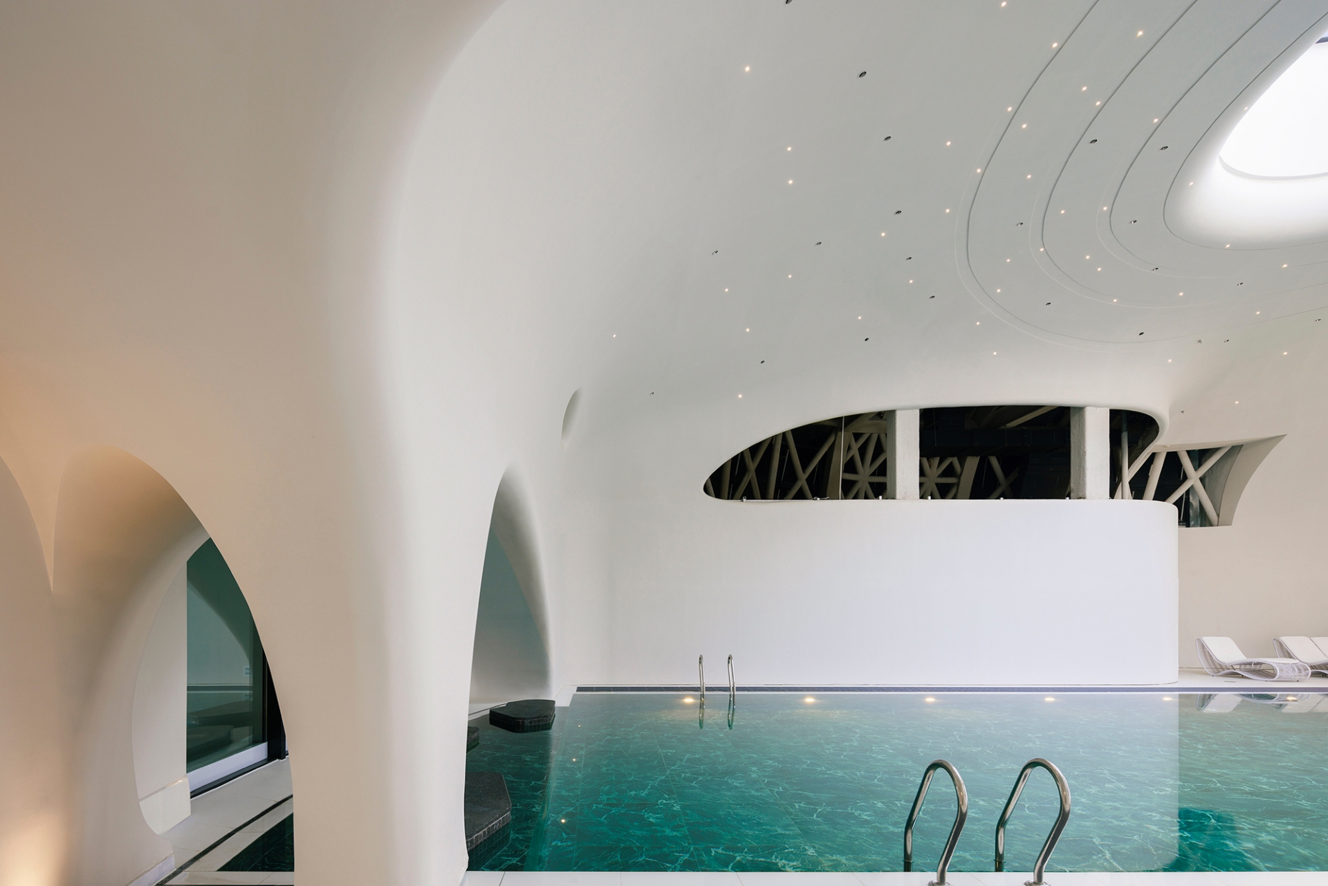 The interior spaces naturally followed this organic form, creating a captivating cavernous system. A central swimming pool anchors this subterranean world, reminiscent of the sea-filled caves in Lionel’s The Beach. A strategically placed skylight at the apex of The Rock allows daylight to pour in, striking the water and creating shimmering ripples—a moment of ephemeral sanctity that truly brings the space to life.